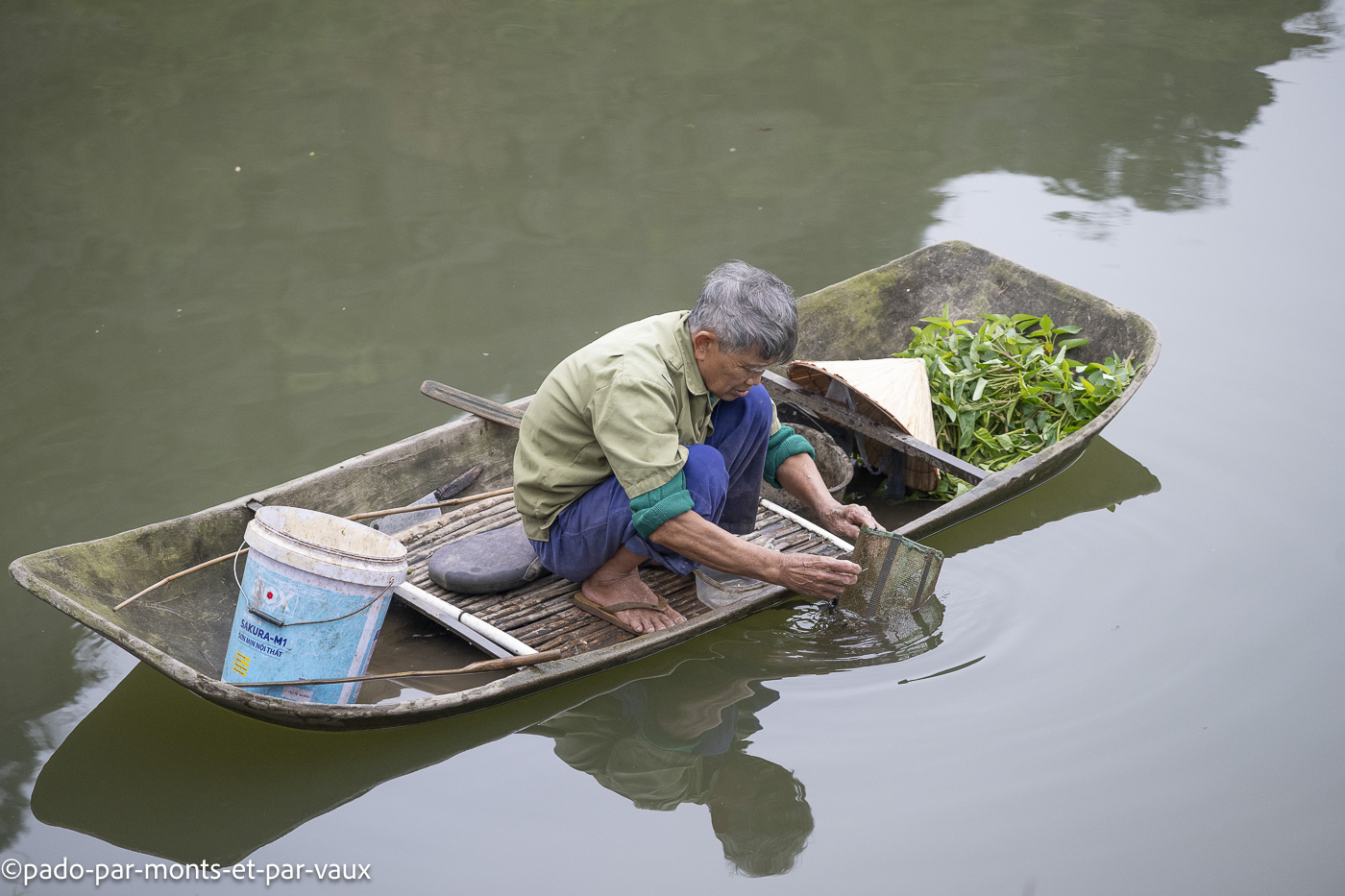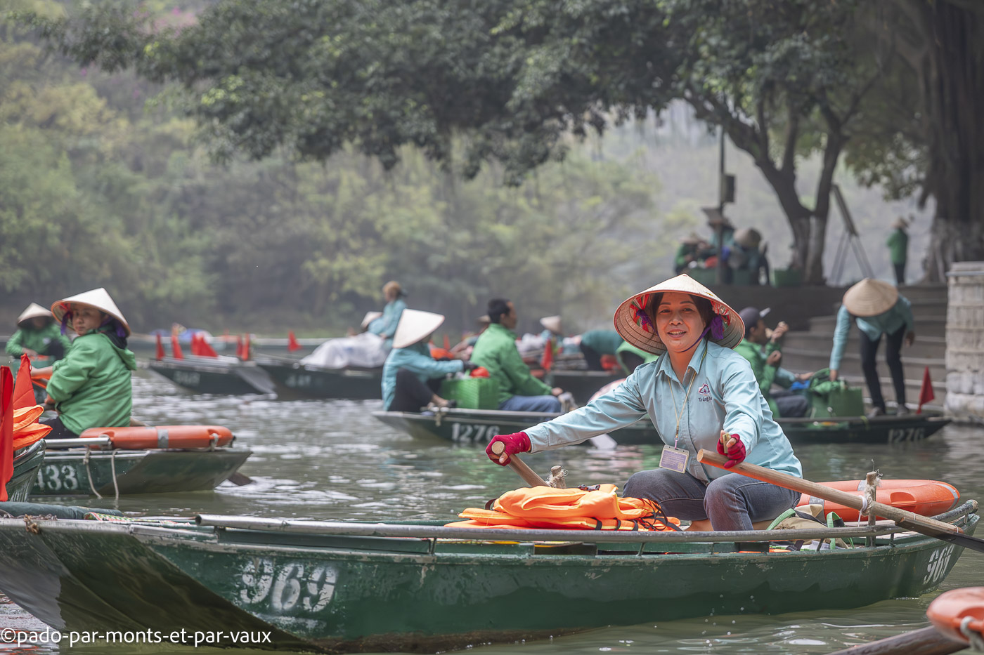 Promenade en barque dans le complexe paysager de Trang An. Le site compte plus de 200 pitons calcaires et un certain nombre de grottes. C’est une dame un peu âgée qui rame et dirige notre barque. J’ai beau savoir qu’elle doit gagner sa croûte, j’ai un peu du mal à rester les bras croisés alors qu’elle ahane sous l’effort (nous lui donnerons un petit coup de main sur le retour).