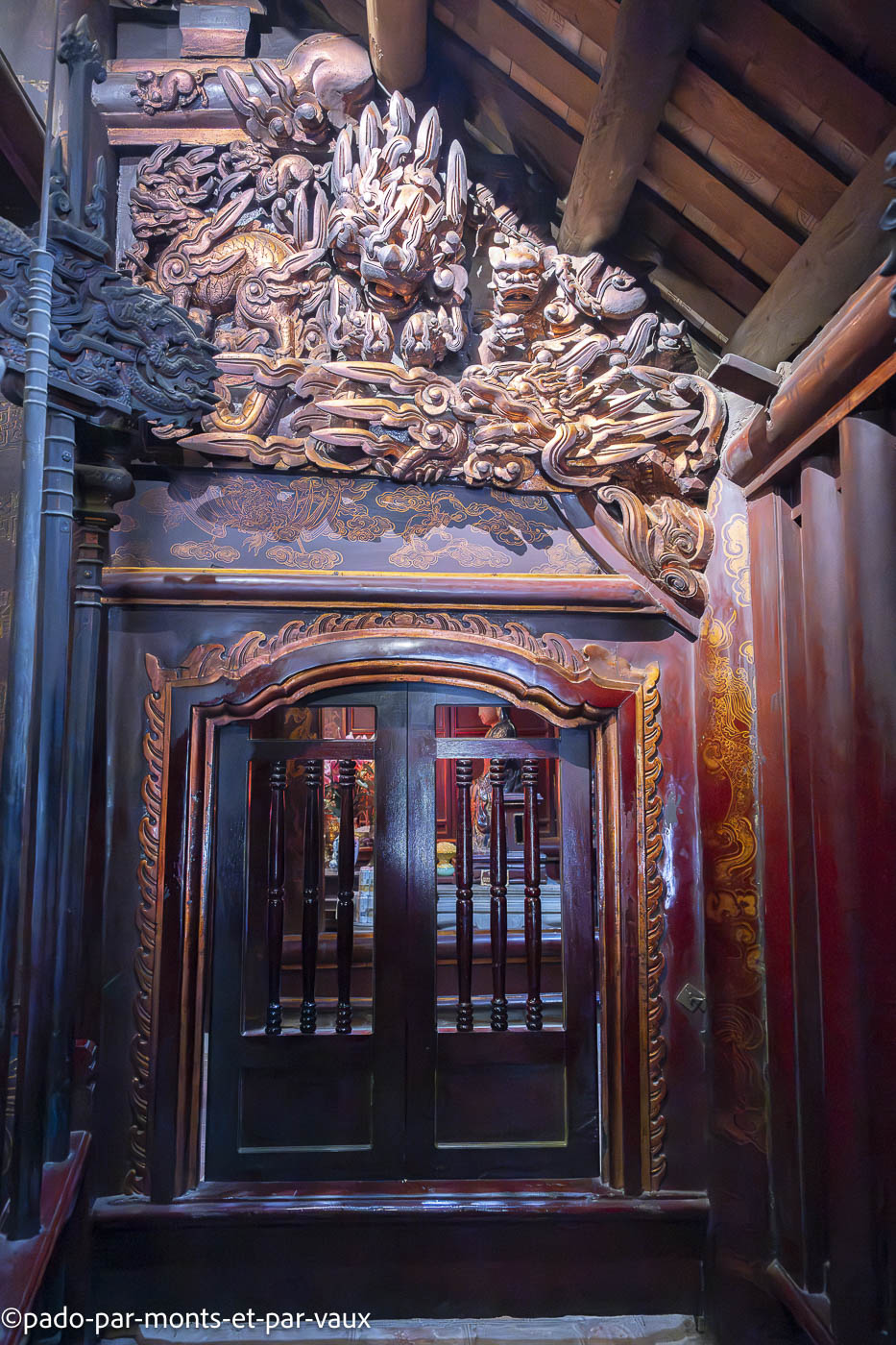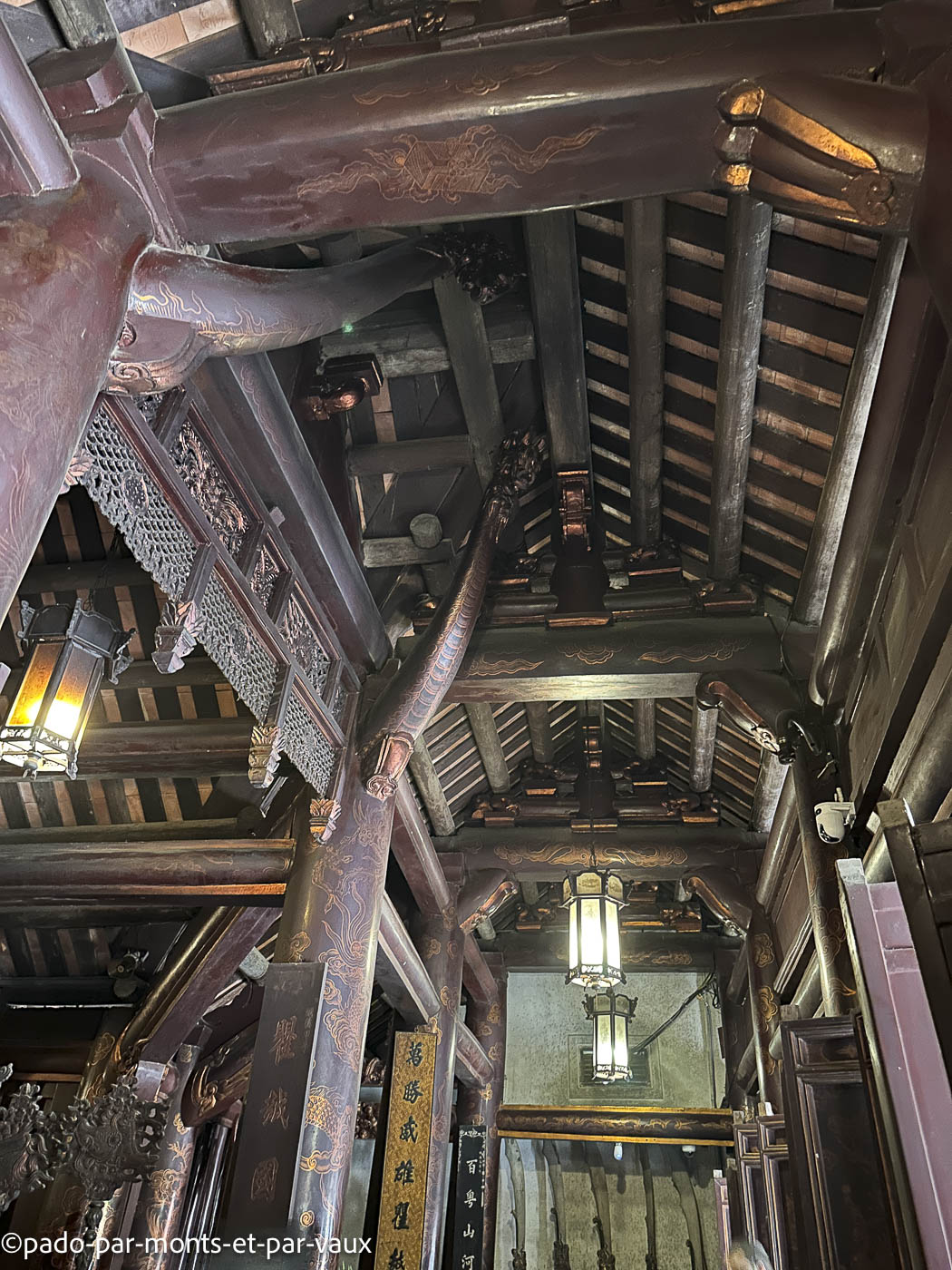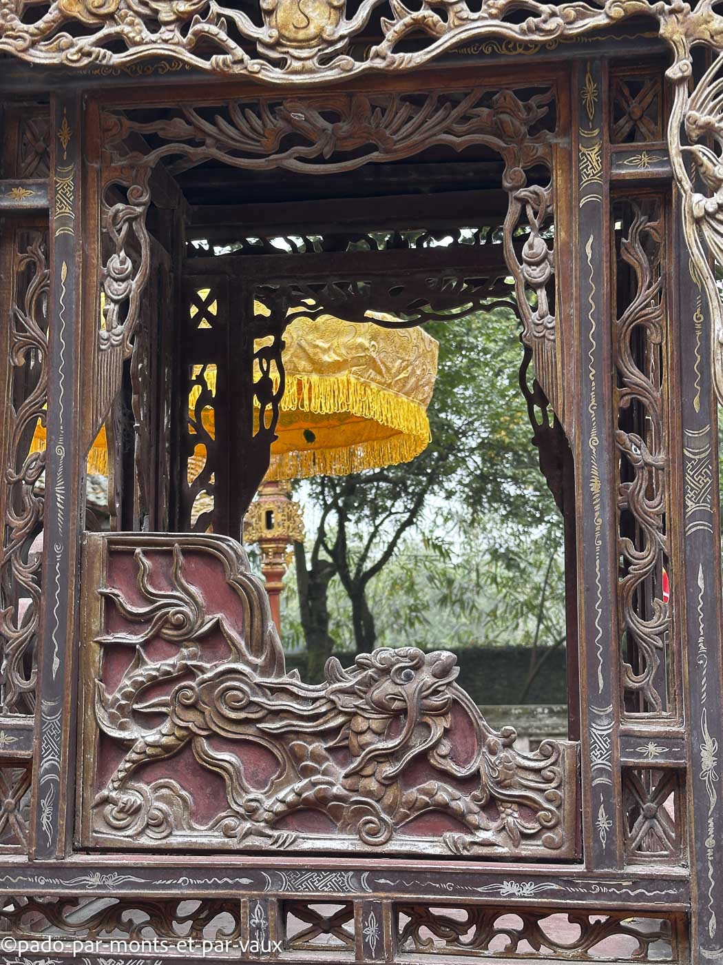L’un est dédié à l’empereur Dinh Tien Hoang (den Dinh) et l’autre à l’empereur Le Dai Hanh (den Le). Belles colonnes de bois avec des décors laqués. Nous traversons également quelques fouilles avec des restes de murs de l’ancienne citadelle.