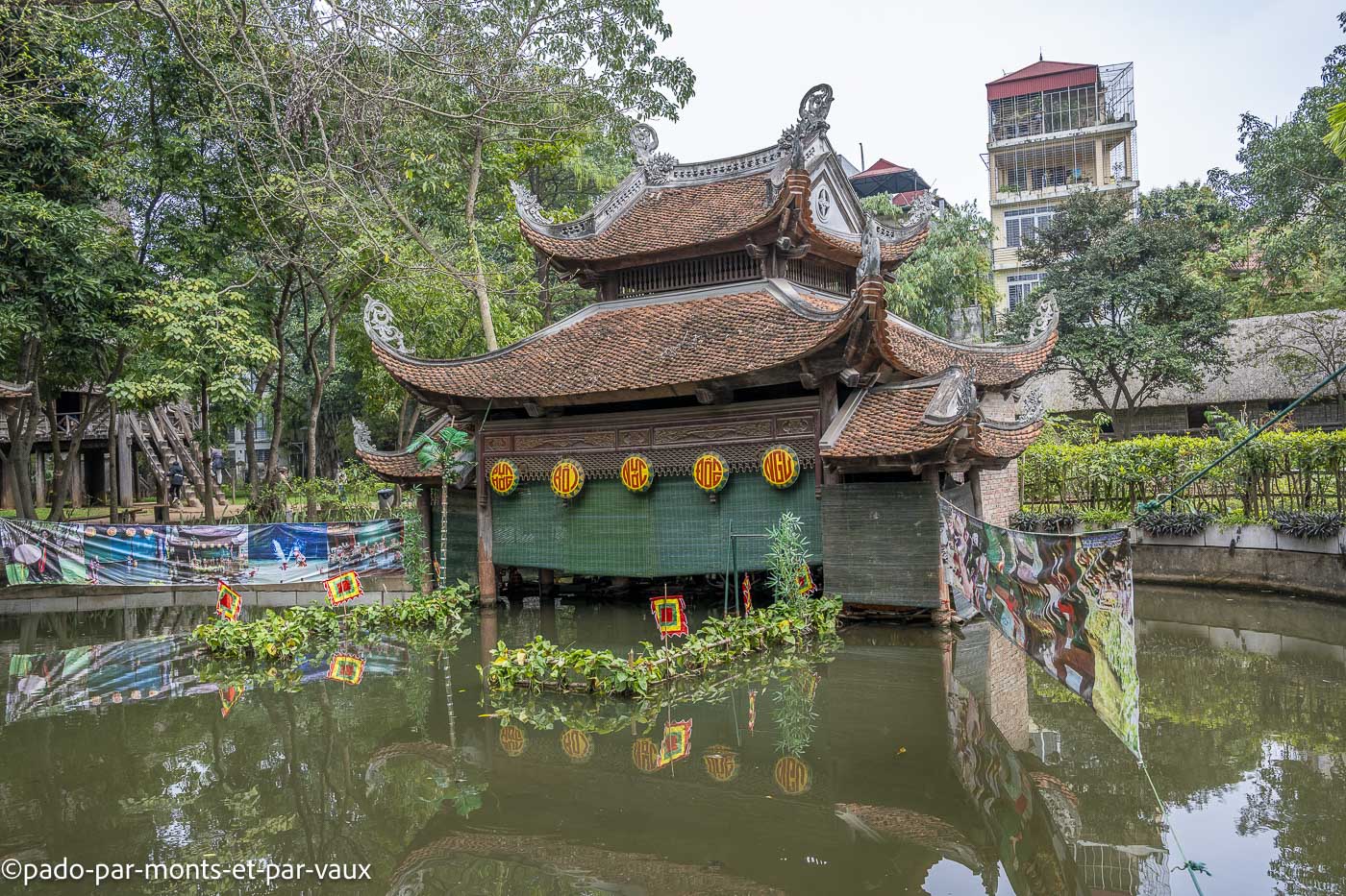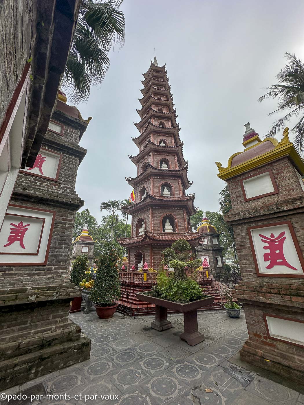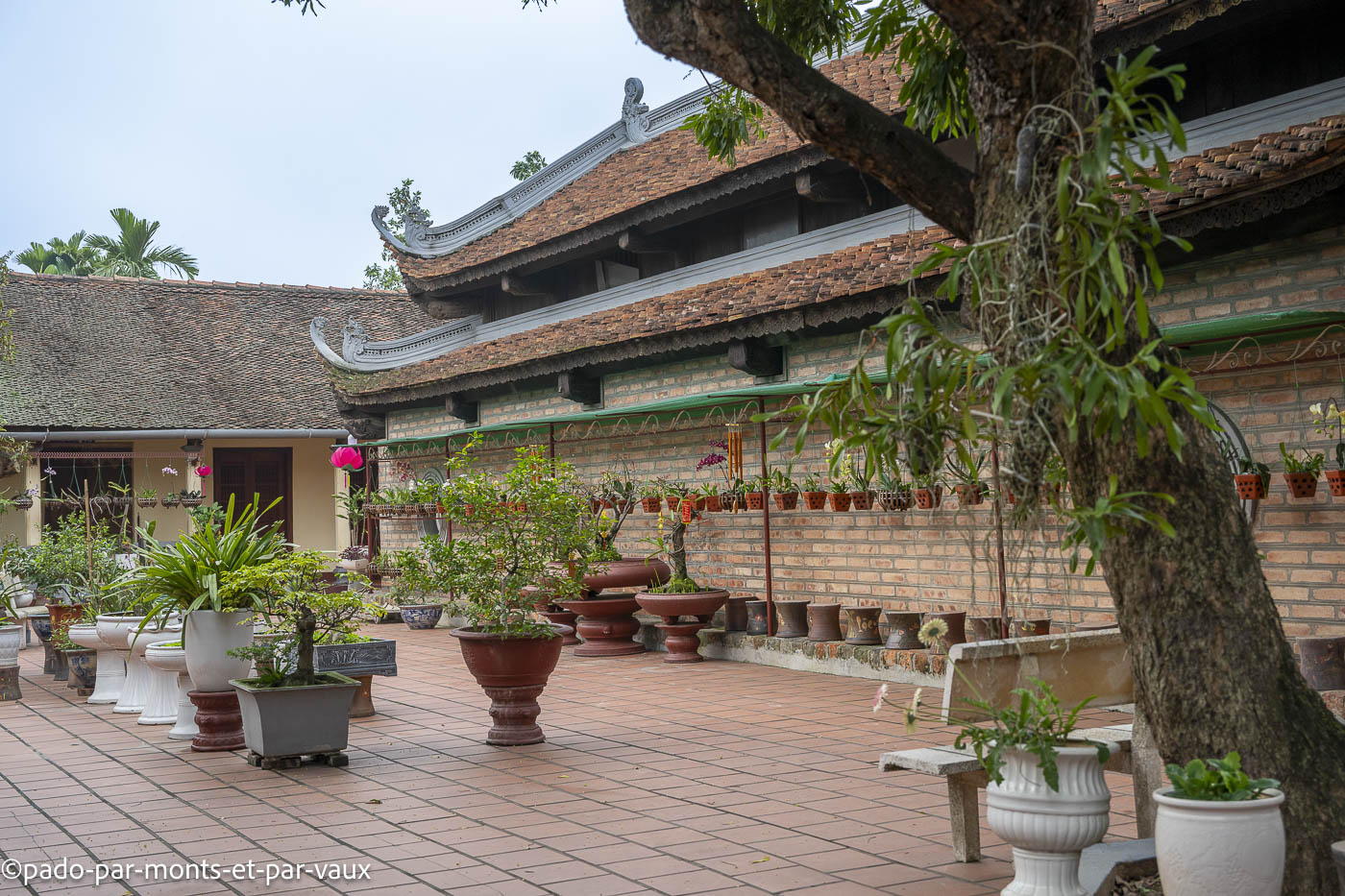 Après le petit-déjeuner au 8ème étage de l’hôtel avec vue sur la brume et les toits de Hanoi, nous prenons un grab pour aller jusqu’à la Pagode du Lotus d’Or à proximité du Lac de l’Ouest. C’est un endroit charmant où en plus, il n’y a quasiment personne à l’exception de quelques locaux venus s’y recueillir. Ici on vénère la princesse des vers à soie (princesse Tu Hoa). Petit cloître avec des pots en céramique bleue, des rangées d’orchidées et des légumes dans les platebandes (choux rave).