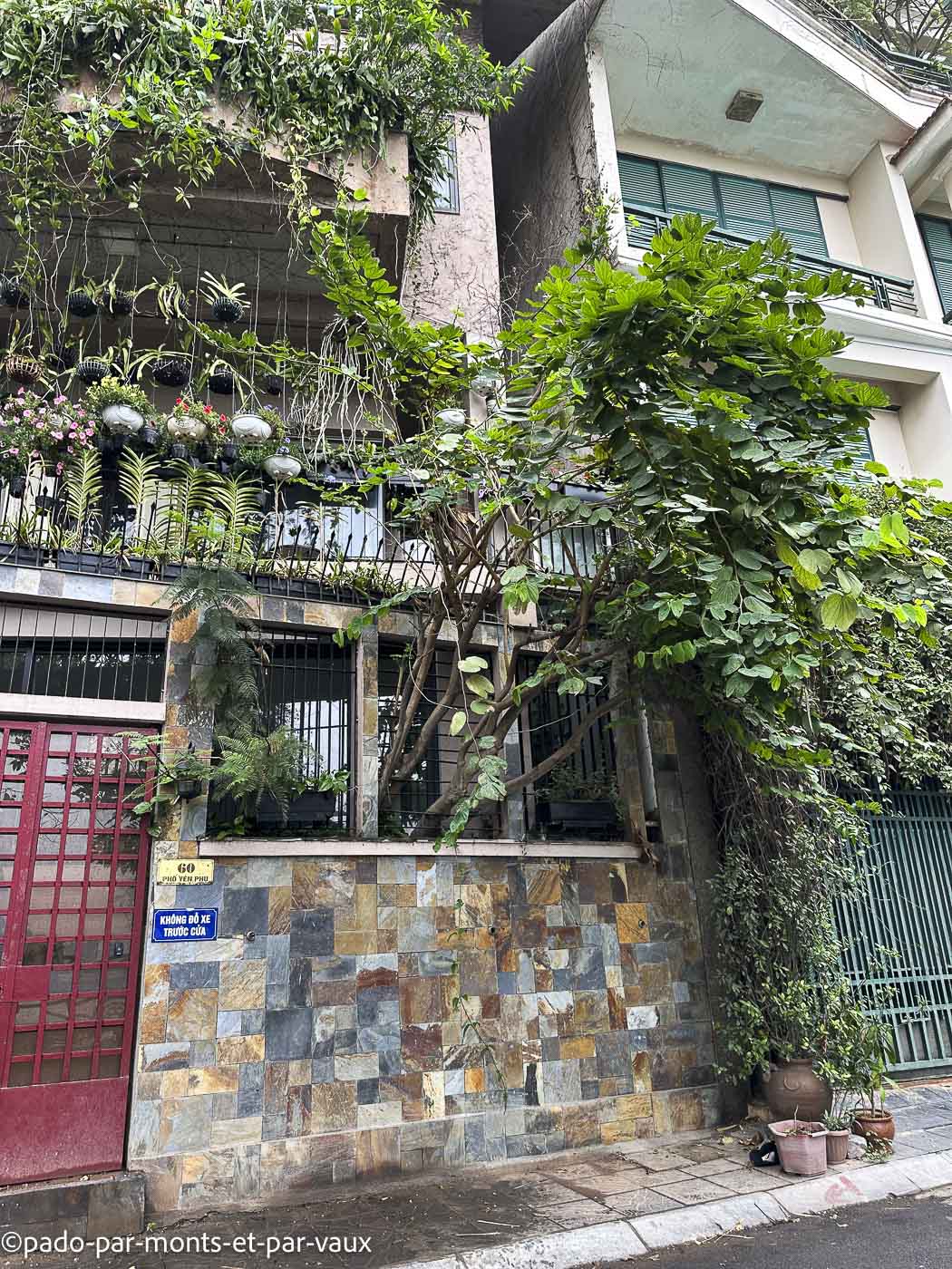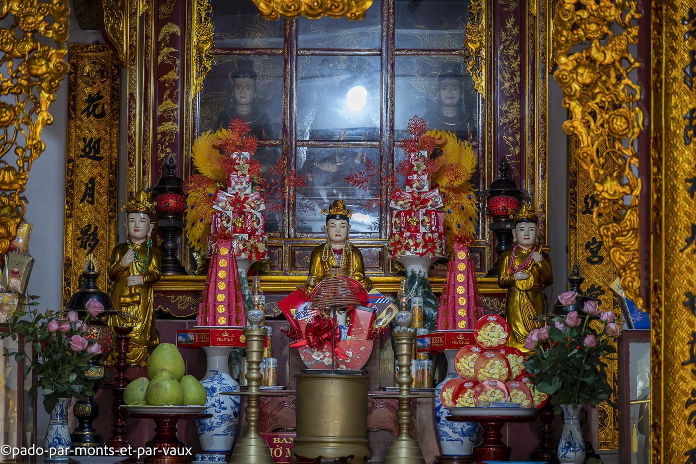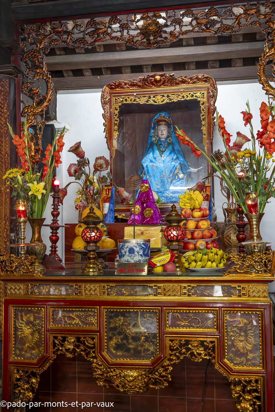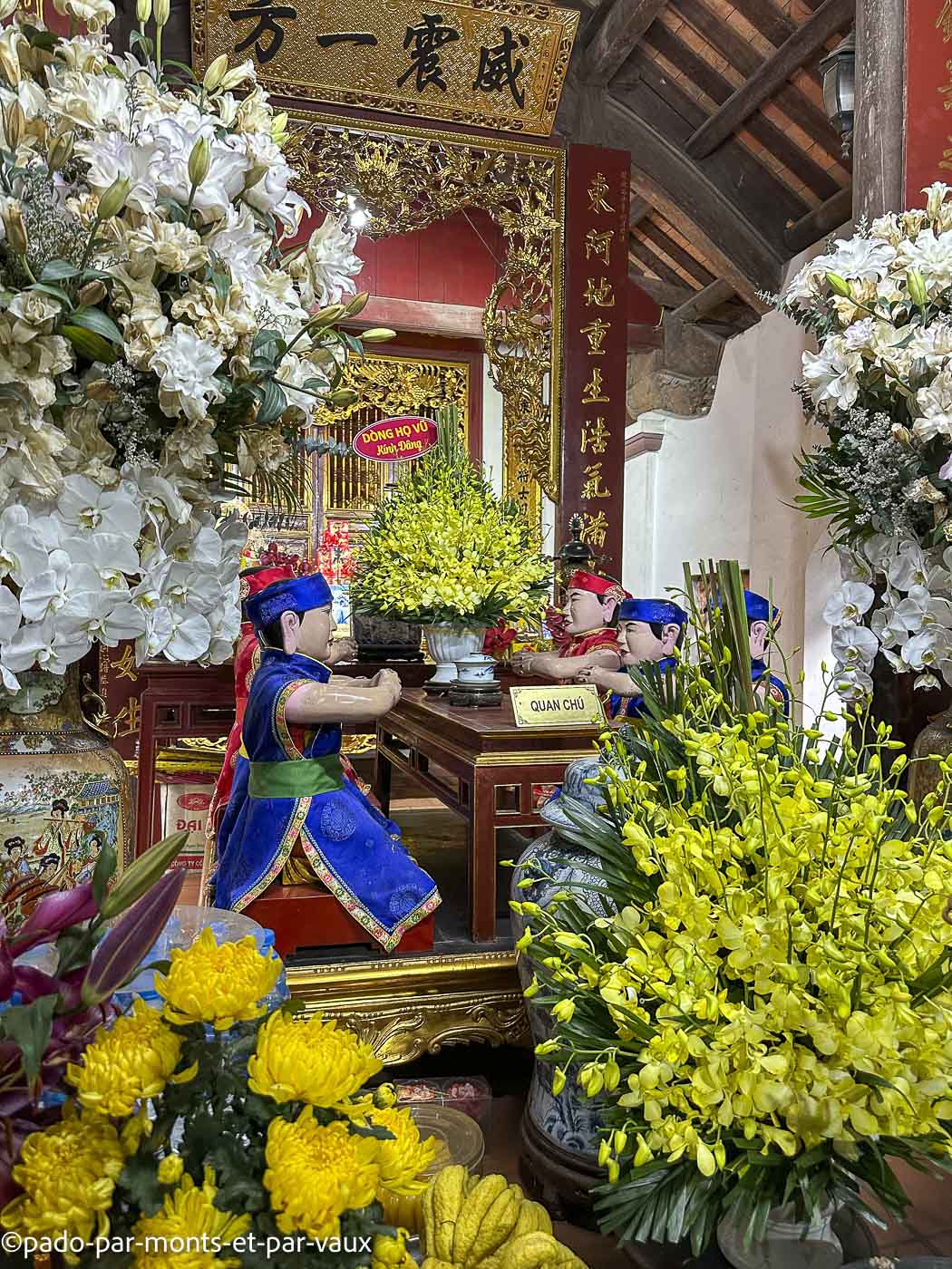 Après le petit-déjeuner au 8ème étage de l’hôtel avec vue sur la brume et les toits de Hanoi, nous prenons un grab pour aller jusqu’à la Pagode du Lotus d’Or à proximité du Lac de l’Ouest. C’est un endroit charmant où en plus, il n’y a quasiment personne à l’exception de quelques locaux venus s’y recueillir. Ici on vénère la princesse des vers à soie (princesse Tu Hoa). Petit cloître avec des pots en céramique bleue, des rangées d’orchidées et des légumes dans les platebandes (choux rave).