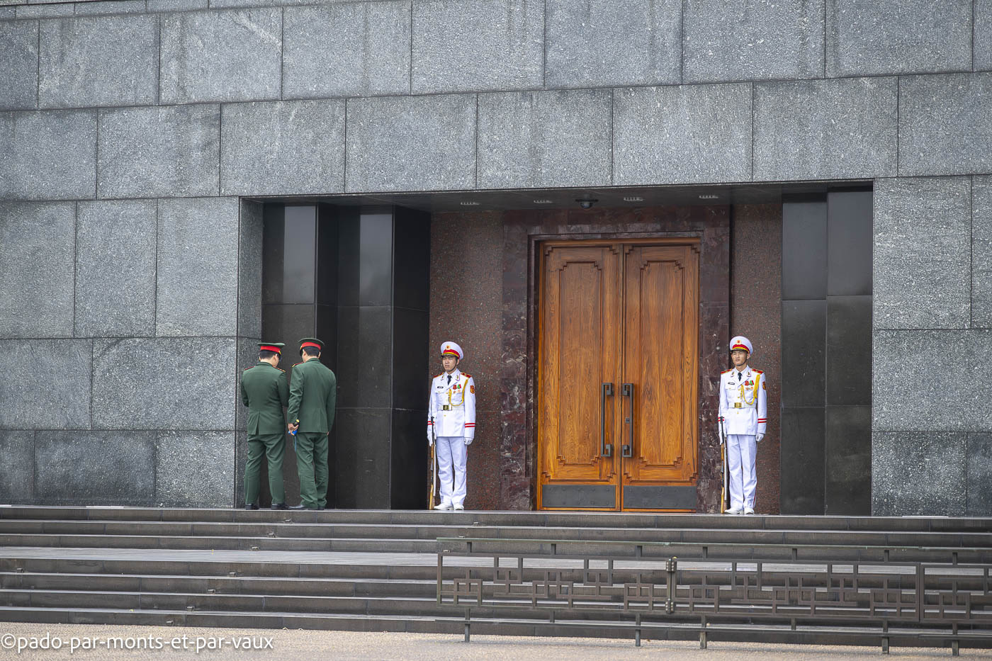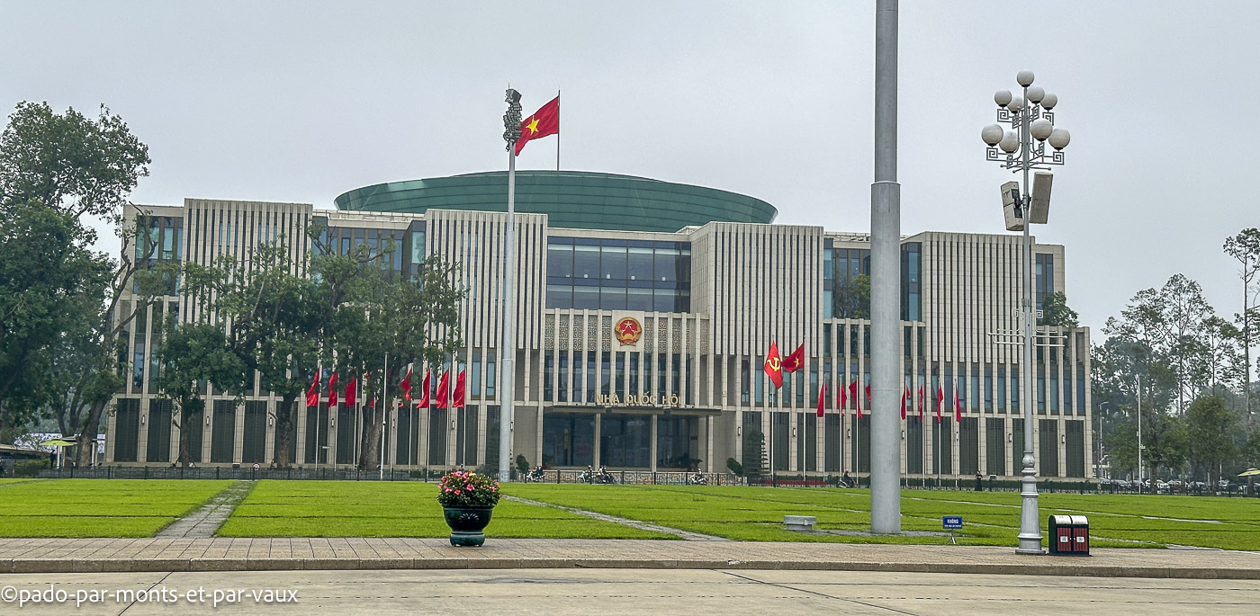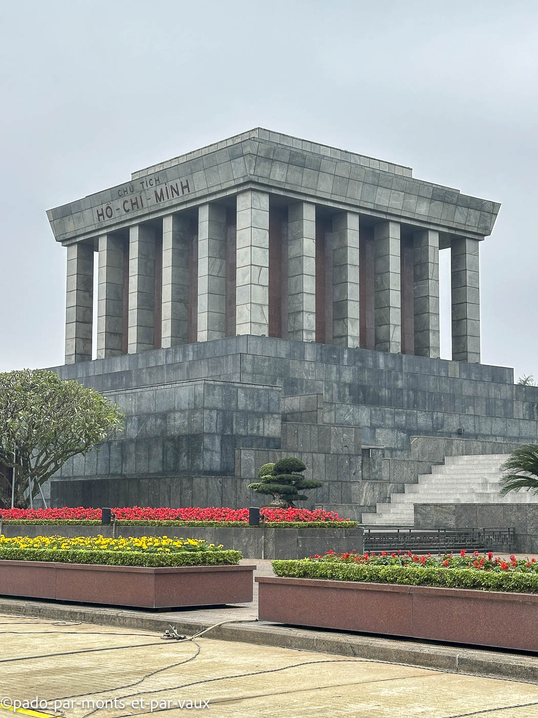 Passage devant le mausolée d’Ho Chi Minh. L’accès à l’esplanade qui est devant le mausolée est soumis à un contrôle de police. Le bâtiment en marbre gris est très austère. Nous traversons l’esplanade et sortons à l’autre bout et là, nous sommes surpris par la taille de la file d’attente pour entrer sur le site (il y a des centaines de personnes massées sur le trottoir). Nous cherchions l’accès à la pagode du pilier unique et nous l’avons raté (l’entrée se fait depuis l’esplanade). Pas le courage de faire la queue, nous renonçons à la pagode !