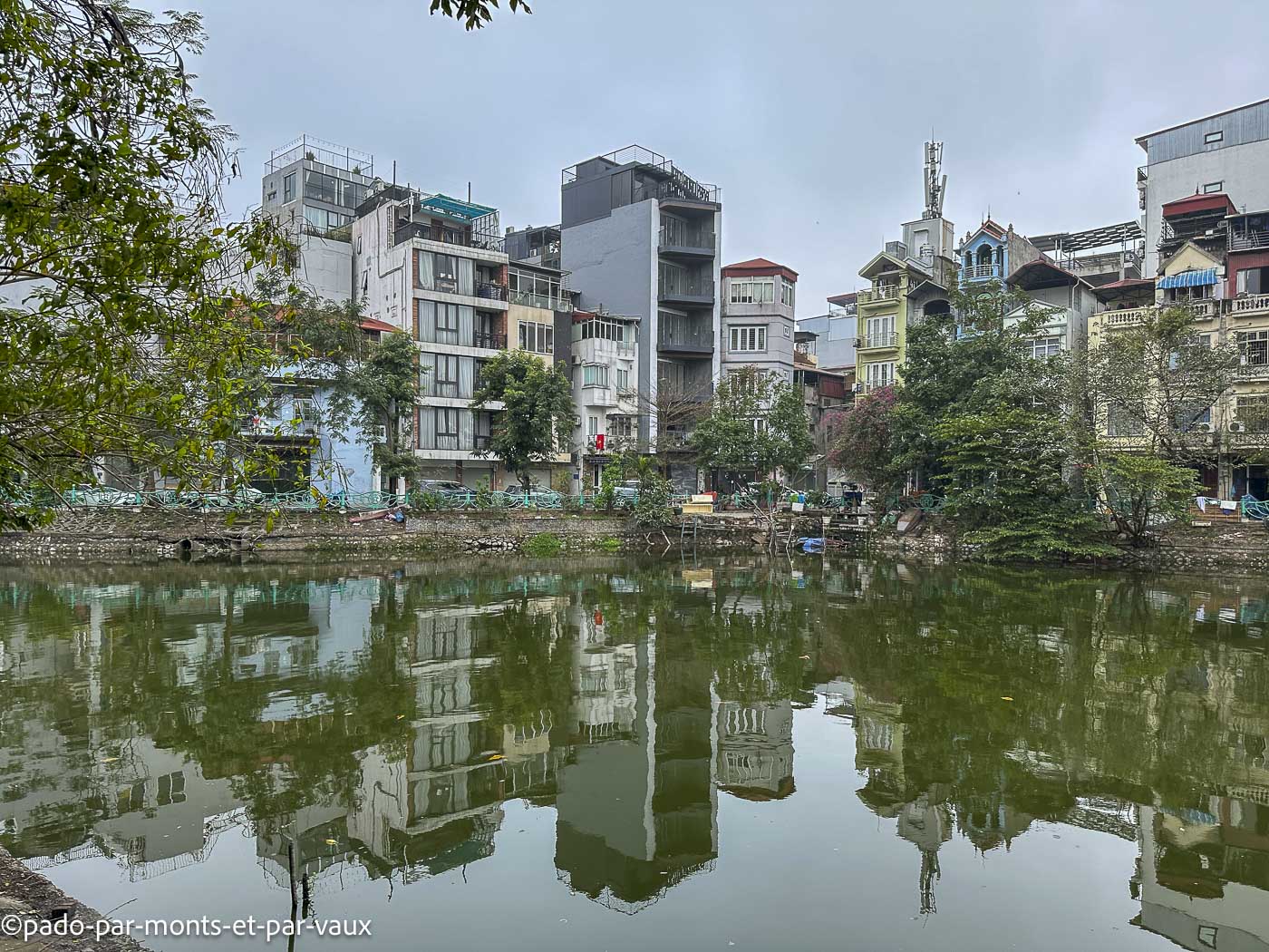 Nous poursuivons par une promenade le long des berges du Lac de l’Ouest, dans un quartier résidentiel calme (presque aucune moto) où l’on ne croise que des dames âgées faisant leur gymnastique matinale, des pêcheurs à la ligne, des buveurs de café et des promeneurs d’oiseaux. Nous entrons dans un temple de quartier par curiosité. Il semble assez ancien et certaines parties sont en restauration.