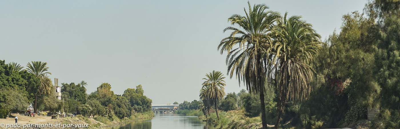 Traversée de la campagne égyptienne avec des palmiers, des manguiers, des champs de canne à sucre, de choux, de bananiers, des villages poussiéreux aux maisons un peu délabrées mais souvent colorées ou parées de décors en briques. On suit la voie de chemin de fer qui passe parfois au ras des habitations (on comprend pourquoi le train donne de la corne en permanence).