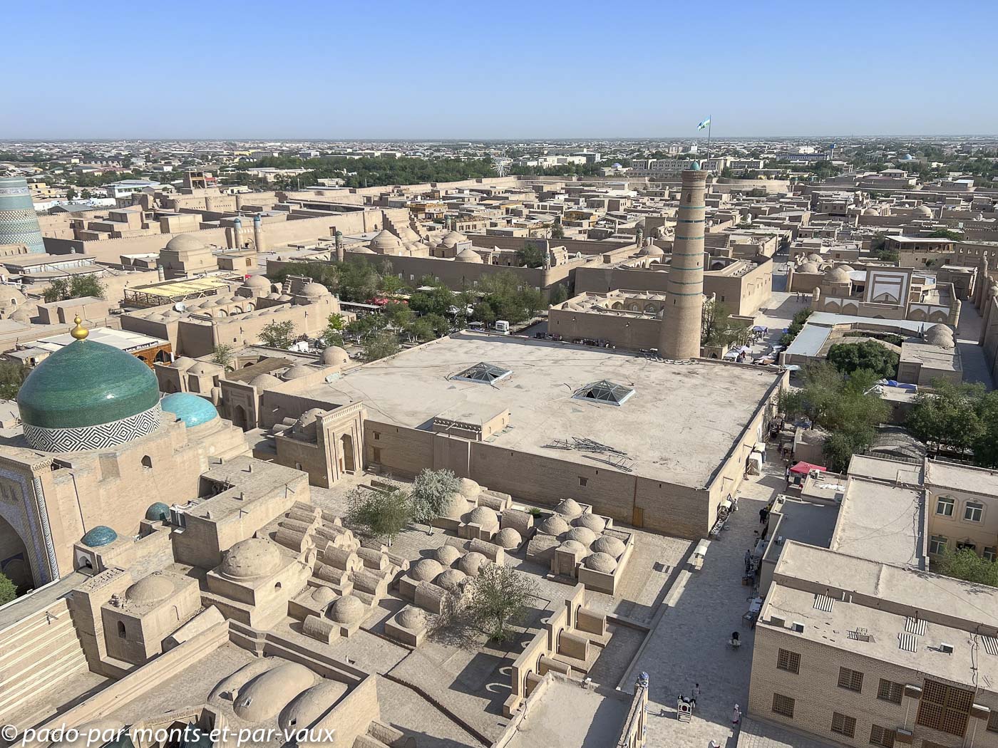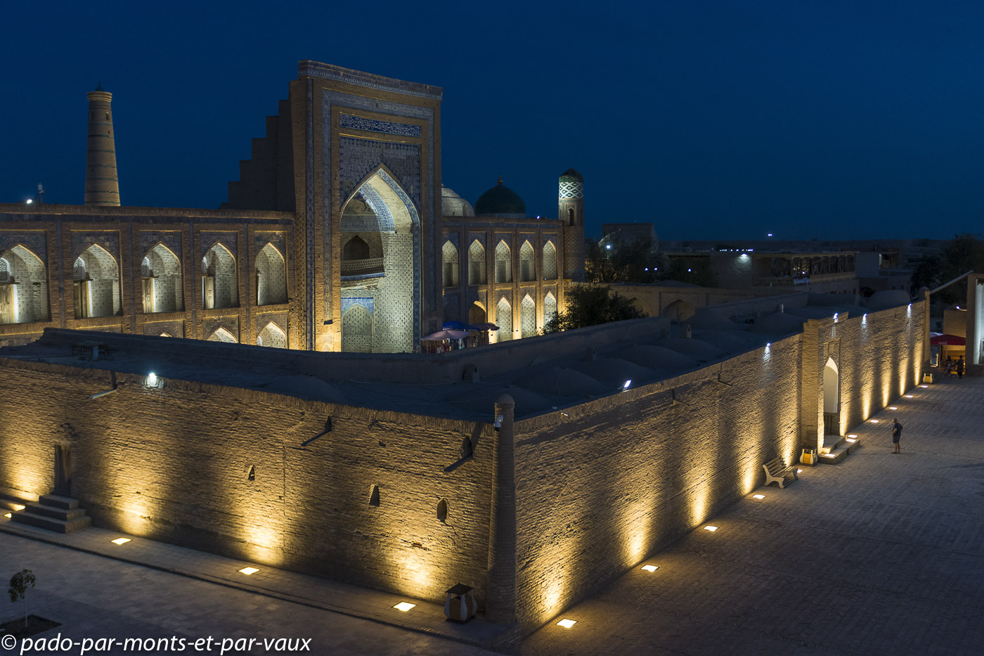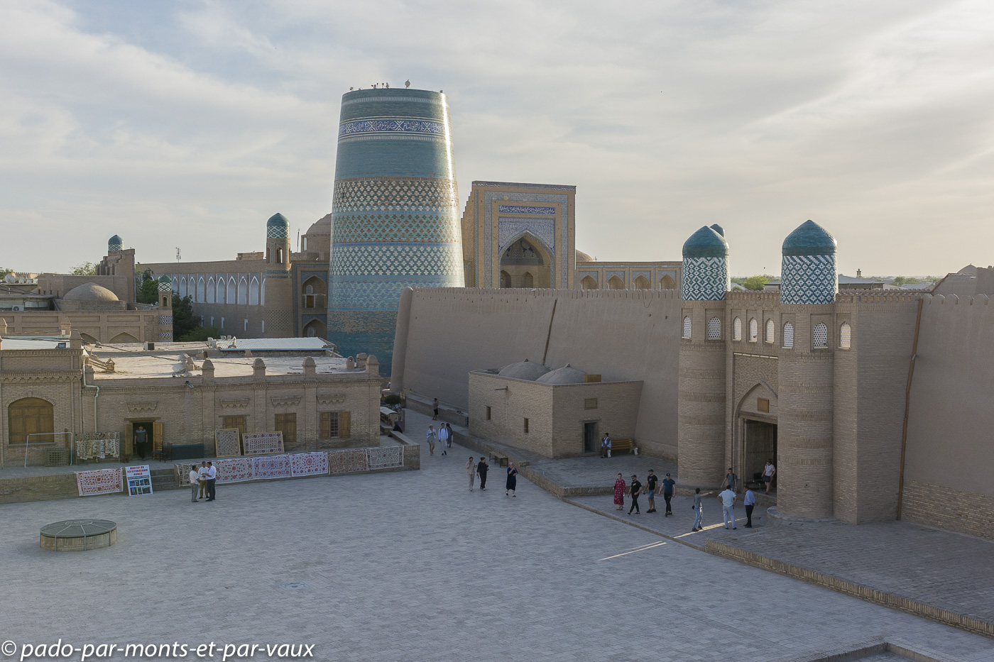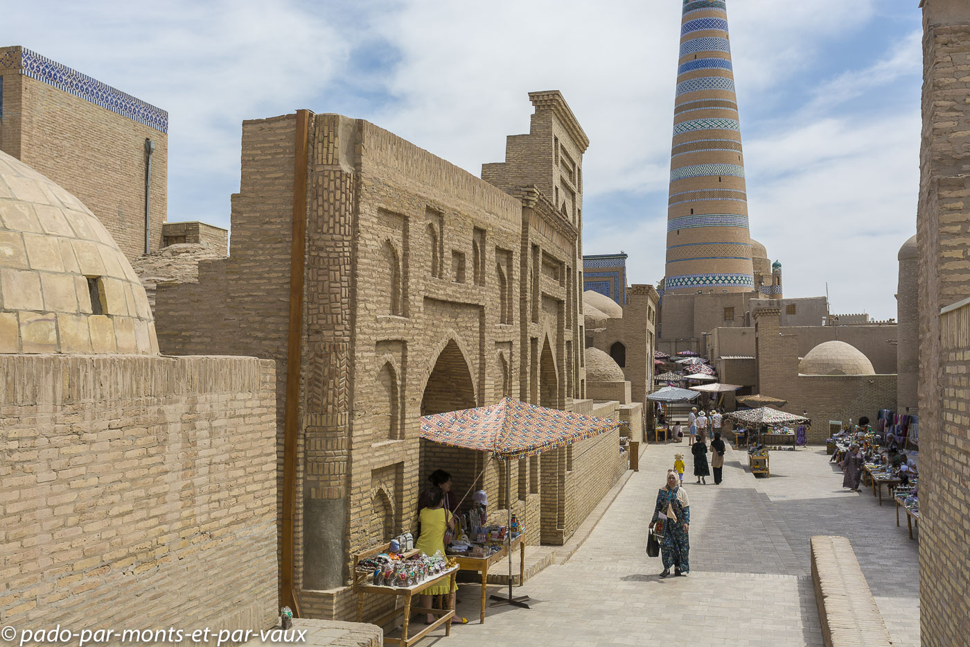 Suite des visites de la vieille ville. Patrice grimpe jusqu’au sommet du minaret de la madrasa Islam Khodja qui ressemble un peu à un phare avec ses bandes de céramiques bleues et blanches. Ce minaret qui culmine à 45 mètres est le plus haut de la ville. Il a été construit en 1910. Je renonce à monter car les 120 marches sont très hautes et il n’y a pas de main courante pour se tenir (mais impossible de me faire rembourser le prix du ticket). Dans la madrasa attenante, il y a un petit musée présentant l’artisanat ouzbek (pierres gravées, faïences, sculptures sur bois, orfèvrerie…). L’ensemble est bien présenté mais il n’y a aucune explication en anglais.