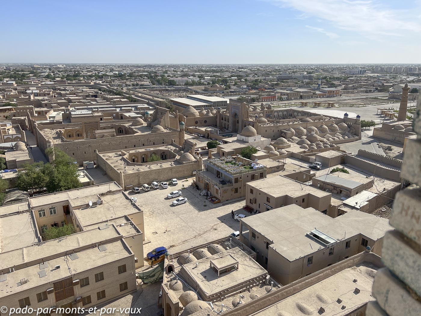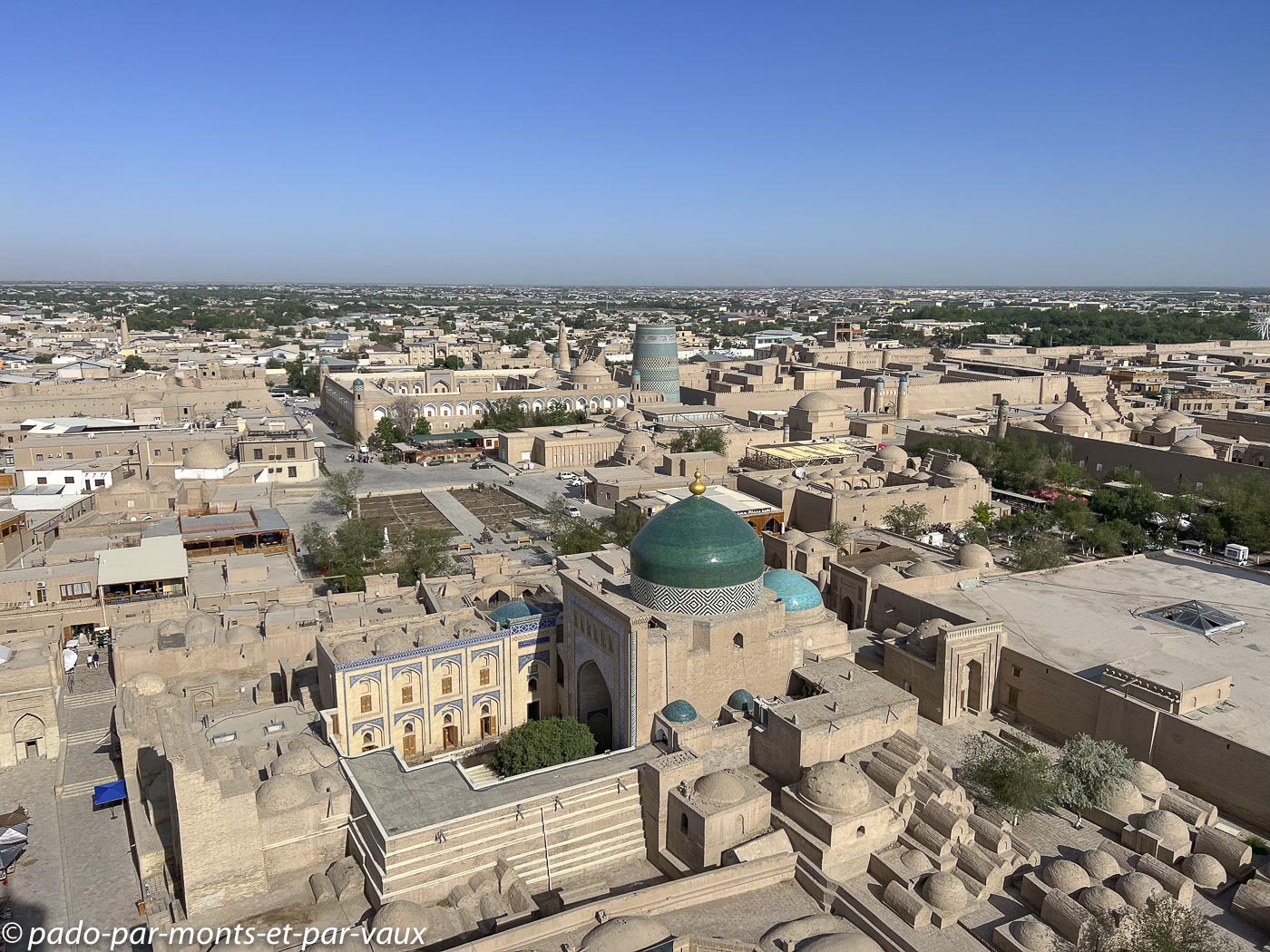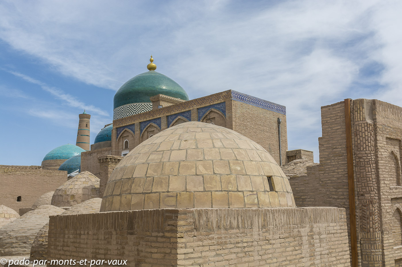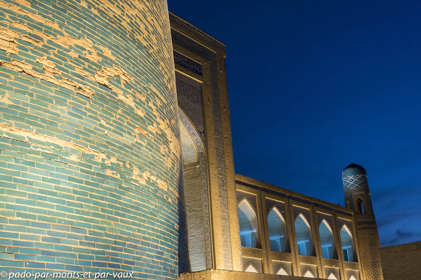 Suite des visites de la vieille ville. Patrice grimpe jusqu’au sommet du minaret de la madrasa Islam Khodja qui ressemble un peu à un phare avec ses bandes de céramiques bleues et blanches. Ce minaret qui culmine à 45 mètres est le plus haut de la ville. Il a été construit en 1910. Je renonce à monter car les 120 marches sont très hautes et il n’y a pas de main courante pour se tenir (mais impossible de me faire rembourser le prix du ticket). Dans la madrasa attenante, il y a un petit musée présentant l’artisanat ouzbek (pierres gravées, faïences, sculptures sur bois, orfèvrerie…). L’ensemble est bien présenté mais il n’y a aucune explication en anglais.