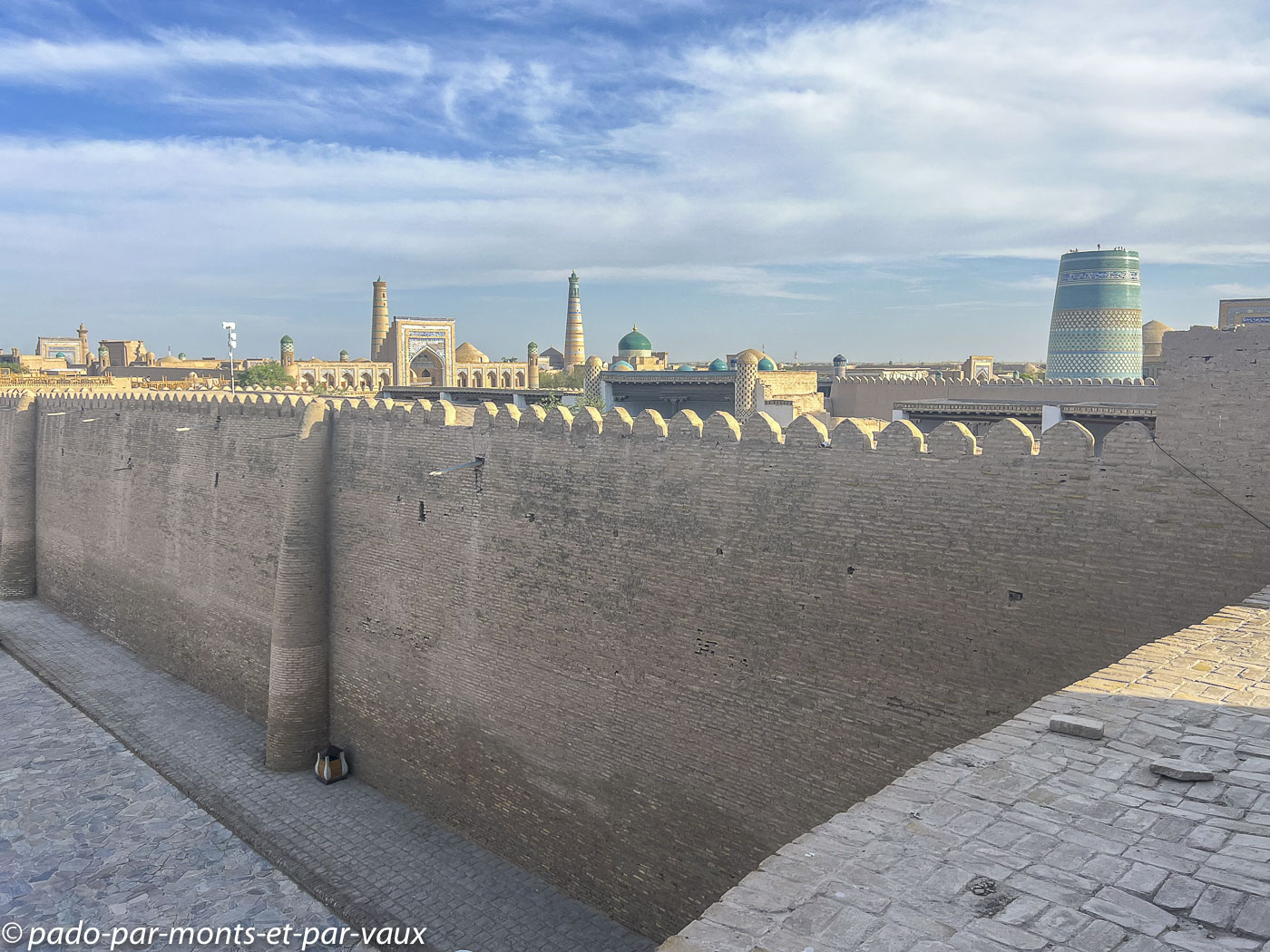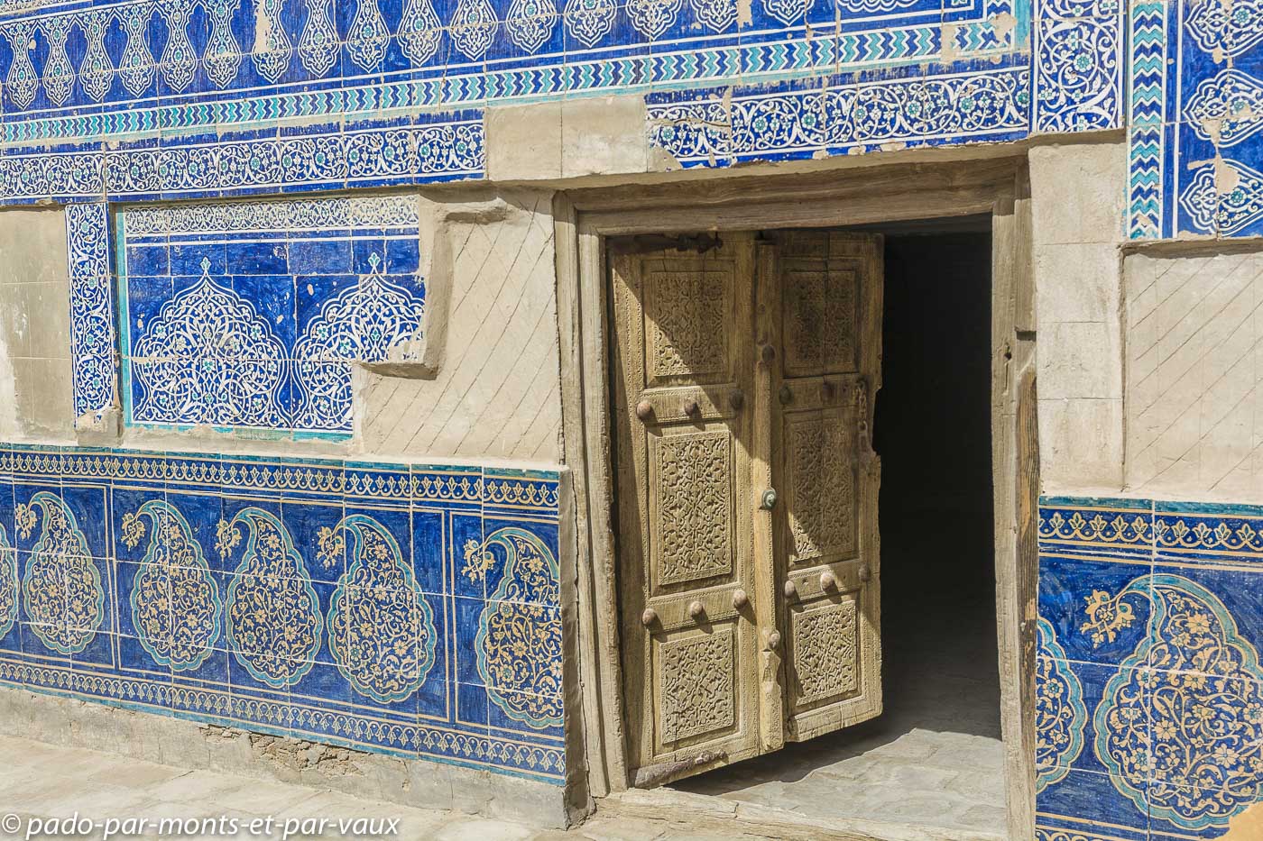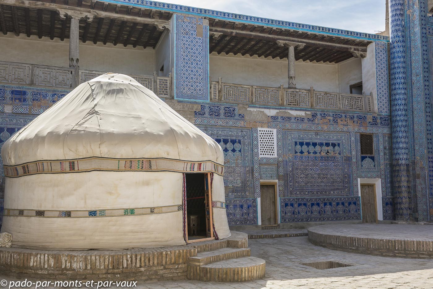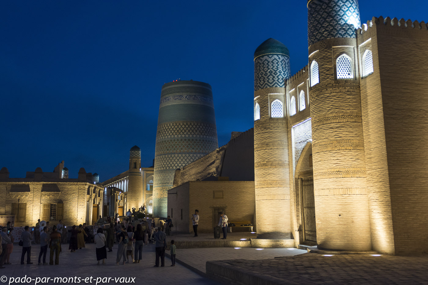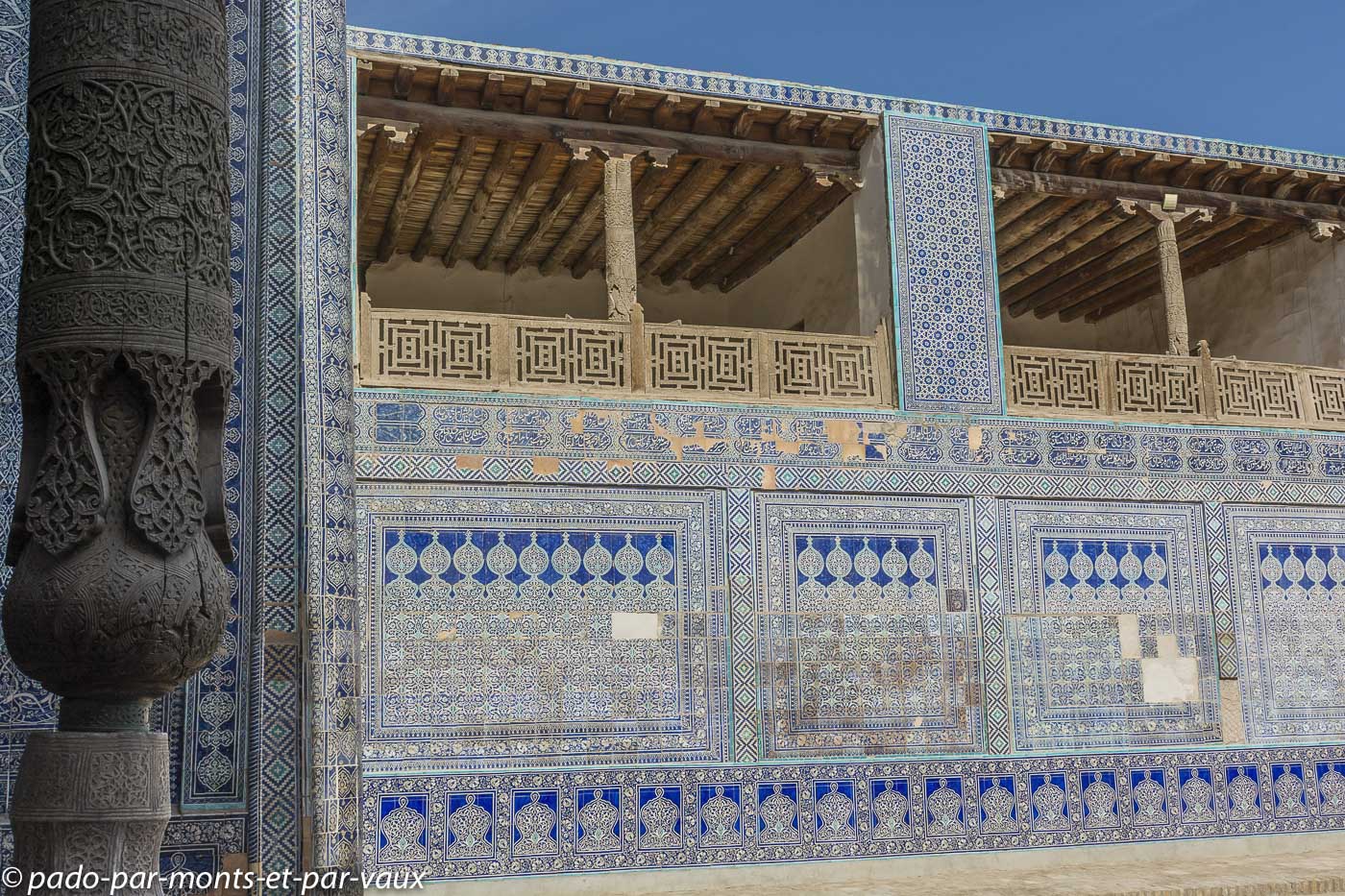 Suite des visites de la vieille ville. Patrice grimpe jusqu’au sommet du minaret de la madrasa Islam Khodja qui ressemble un peu à un phare avec ses bandes de céramiques bleues et blanches. Ce minaret qui culmine à 45 mètres est le plus haut de la ville. Il a été construit en 1910. Je renonce à monter car les 120 marches sont très hautes et il n’y a pas de main courante pour se tenir (mais impossible de me faire rembourser le prix du ticket). Dans la madrasa attenante, il y a un petit musée présentant l’artisanat ouzbek (pierres gravées, faïences, sculptures sur bois, orfèvrerie…). L’ensemble est bien présenté mais il n’y a aucune explication en anglais.