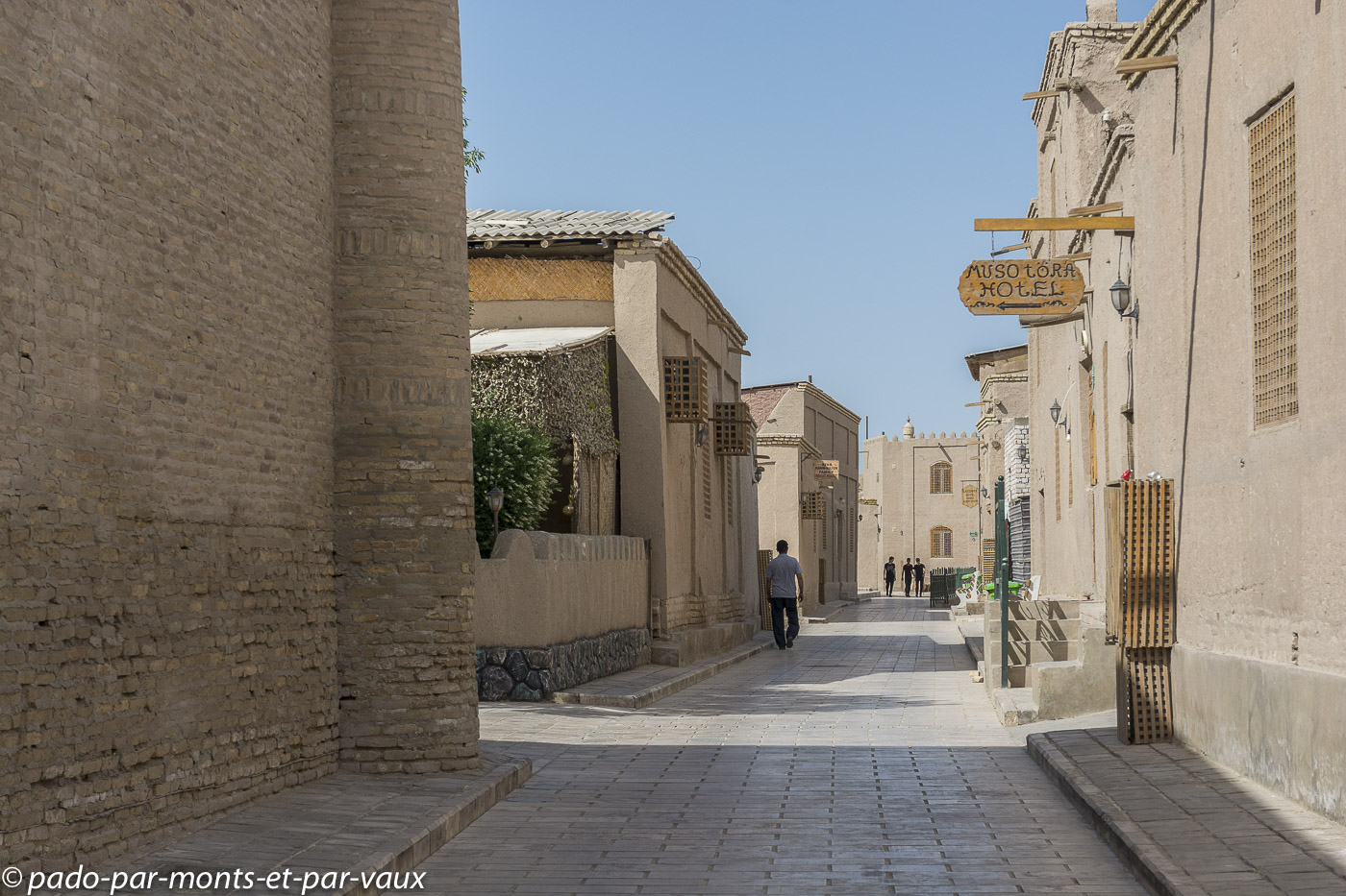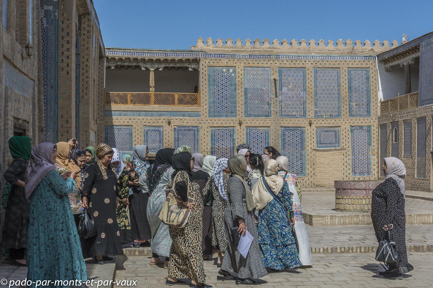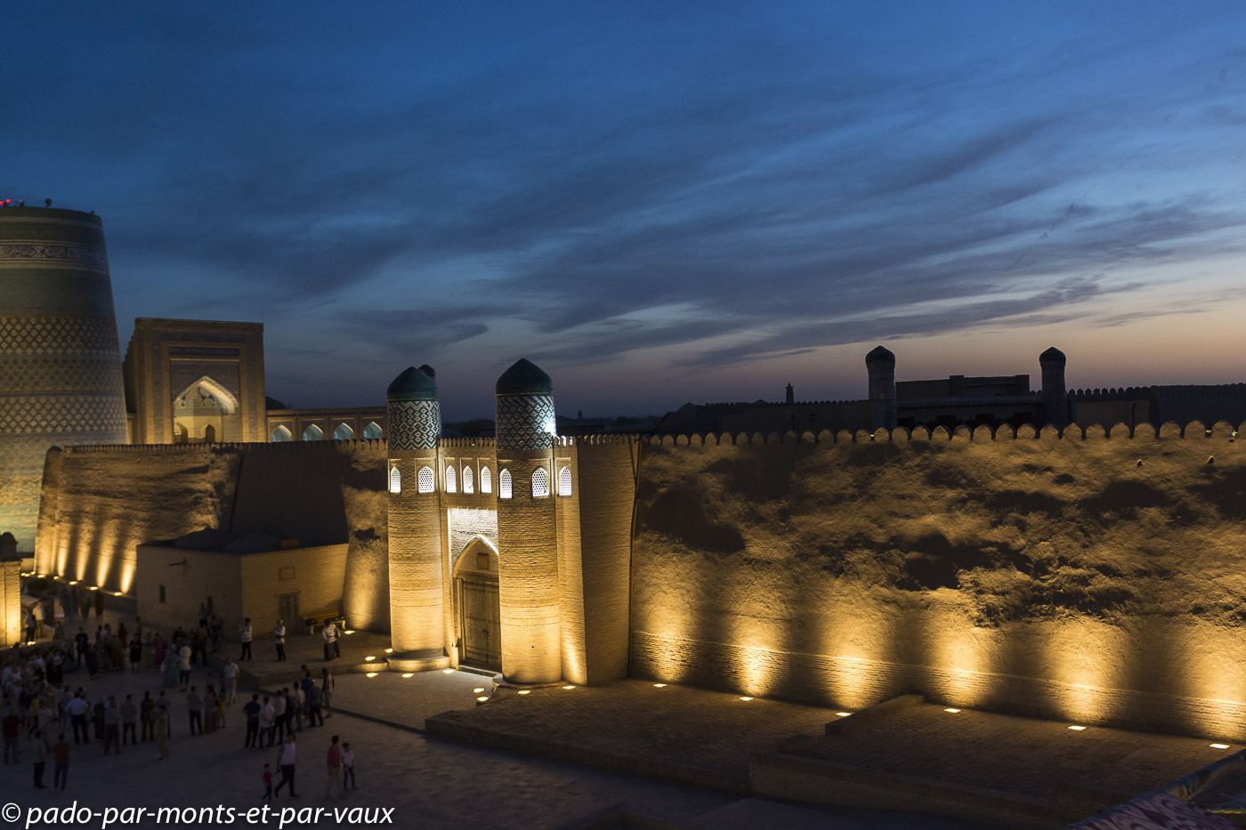Nouvelle déambulation puis arrêt boisson/glace pour se rafraîchir avant de revenir à l’hôtel pour une petite pause bien agréable. Nous ressortons pour aller voir le palais Isfandiyar (ou palais Nouroullah Baï) qui se trouve à l’extérieur des remparts. Construit au début des années 1900, dans un mélange de styles russe et ouzbek. Très nombreuses pièces dont certaines avec des décors très chargés, pièces de réception avec des poêles russes en céramique, expositions de tableaux contemporains illustrant Khiva et sa région et de belles photos anciennes. Visite plus intéressante que ce que nous avait laissé envisager la lecture des guides.