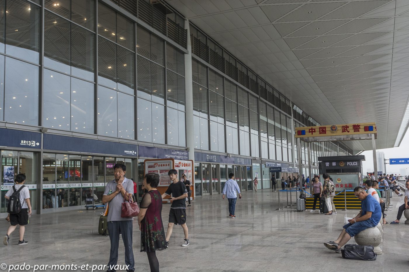 Réveil vers 6h pour un départ à 6h45. Ce matin il pleut. Hier la majorité des passants avaient un parapluie pour se protéger du soleil, aujourd’hui la plupart marchent tête nue sous la pluie. La gare TGV de Xi’an est loin du centre-ville et ressemble plus à un aéroport qu’à une gare. Il faut montrer son passeport en même temps que le billet de train puis passer au contrôle de sécurité (comme d’ailleurs chaque fois que l’on prend le métro ou que l’on rentre sur un site touristique) avant de pouvoir pénétrer dans l’immense bâtiment. Assise au milieu du grand hall, je regarde la foule des voyageurs : une vraie fourmilière dans laquelle je ne distingue aucun visage européen. Sagement installés dans la queue devant la porte d’embarquement, nous sommes emportés par le flot de chinois dès que se libère l’accès au quai. Le train rapide pour Tianshui est parfaitement à l’heure et nous nous installons pour deux heures de trajet qui vont nous emmener dans la province du GANSU via un paysage de plaines cultivées mais aussi de montagnes que nous franchissons par de nombreux tunnels.