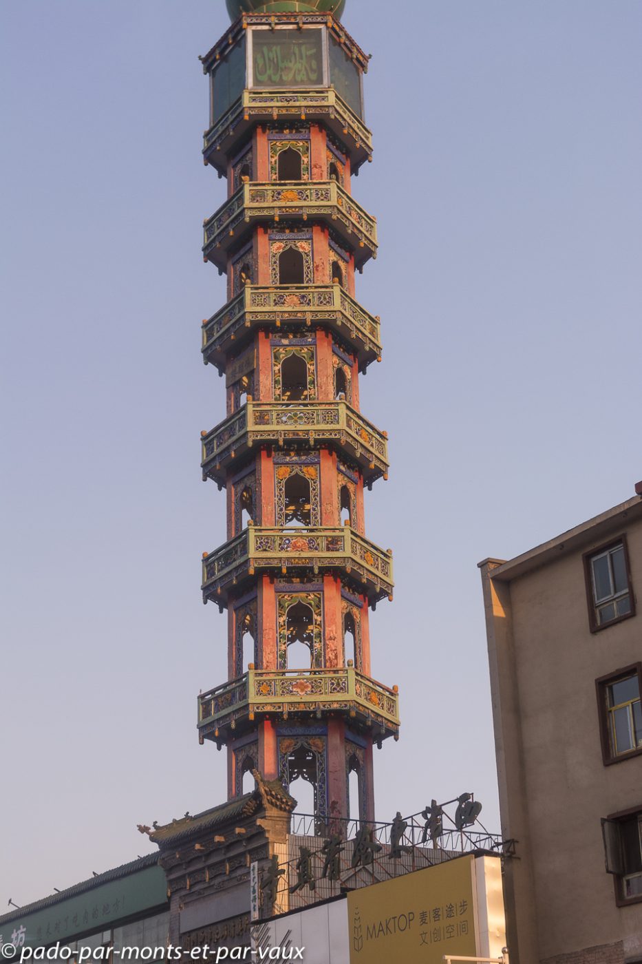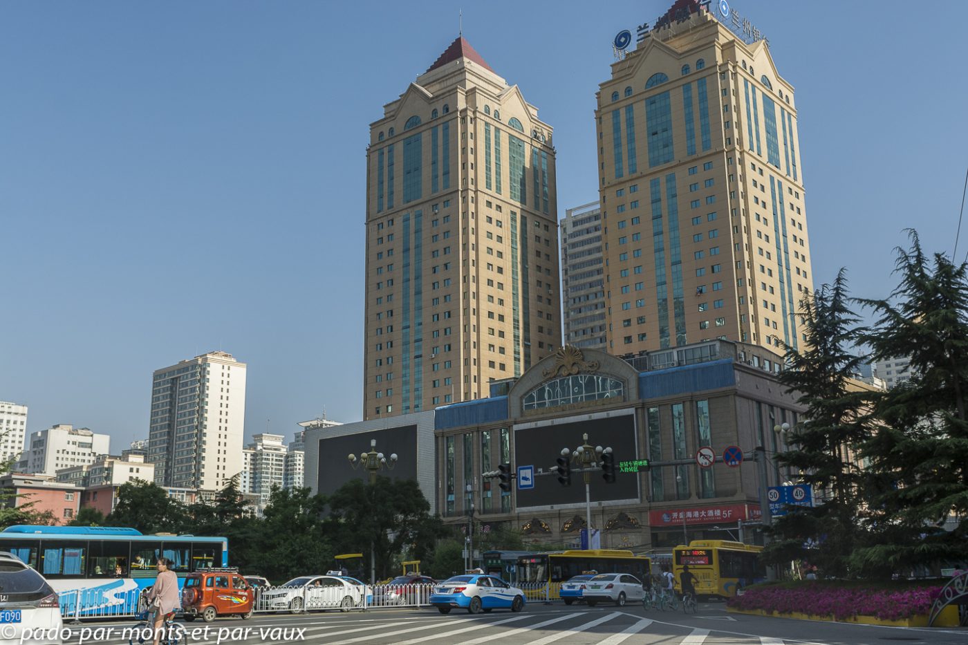A l’arrivée nous faisons connaissance avec notre nouveau chauffeur qui va nous accompagner pendant quelques jours. Il ne parle pas un mot d’anglais mais possède un traducteur sur son téléphone qui permet d’échanger quelques mots. La ville de Lanzhou (près de 4 millions d’habitants) est la capitale de la province du Gansu, elle s’étire le long du fleuve jaune sur près de 20 kilomètres. C’est une ville énorme avec des centres commerciaux monstrueux, de très larges avenues encombrées de bus et de taxis, des immeubles neufs qui poussent comme des champignons et voisinent avec des temples et des mosquées. Installation au JJ Sun hotel, un hôtel classique et confortable. Notre chambre est au 9ème étage avec une vue partiellement dégagée sur la ville. Comme il est assez tard, nous optons pour le restaurant de l’hôtel. Pour eux aussi c’est un peu tard mais nous arrivons à nous faire servir un steak accompagné de pastèque, une des rares choses proposées sur la mini carte en anglais.