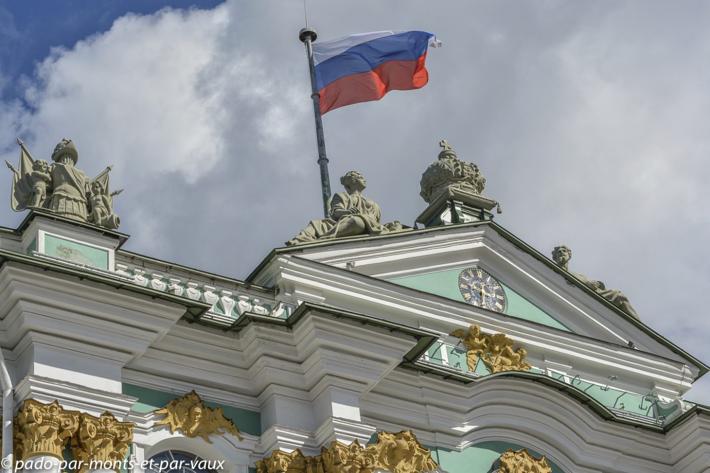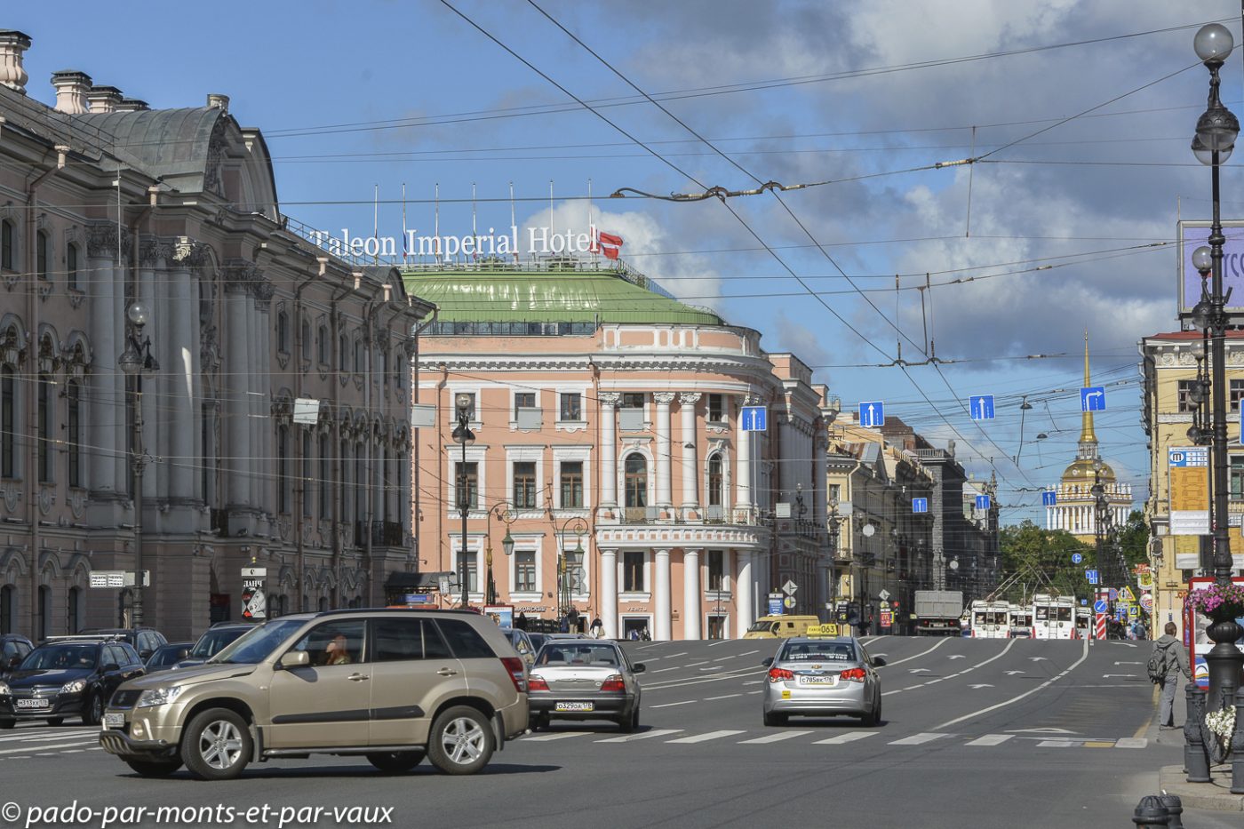 Aujourd’hui le ciel est clair mais il y a du vent et la température ne dépasse pas les 15°C. Nous sortons donc couverts. Nous avons prévu de consacrer notre journée au musée de l’Ermitage. Nous partons en éclaireurs avec Patrice pour acheter les tickets (les guides annoncent une queue importante et nous n’avons pas réussi à les acheter par internet).