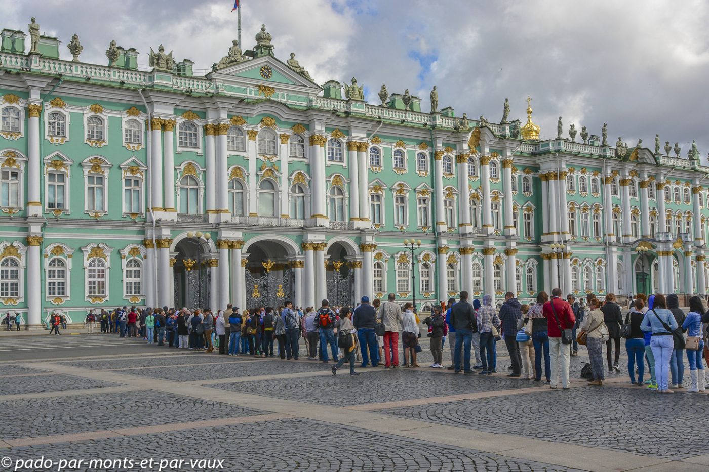 Nous arrivons à 9h30 (le musée ouvre ses portes à 10h30) et il y a déjà une bonne centaine de personnes devant nous. Les enfants nous rejoignent un peu plus tard et nous nous relayons. La queue devient vite impressionnante. A 10h la grille s’ouvre et nous poursuivons l’attente dans la cour du musée. Finalement à 11h nous sommes opérationnels avec notre ticket en main. Ouf ! Le billet à 600 roubles donne droit à l’entrée du bâtiment principal (sauf le trésor), du General Staff Building, du musée de la Porcelaine et du Palais Menchikov. Cela fait beaucoup pour une journée et il vaut mieux prendre le billet à 400 roubles.