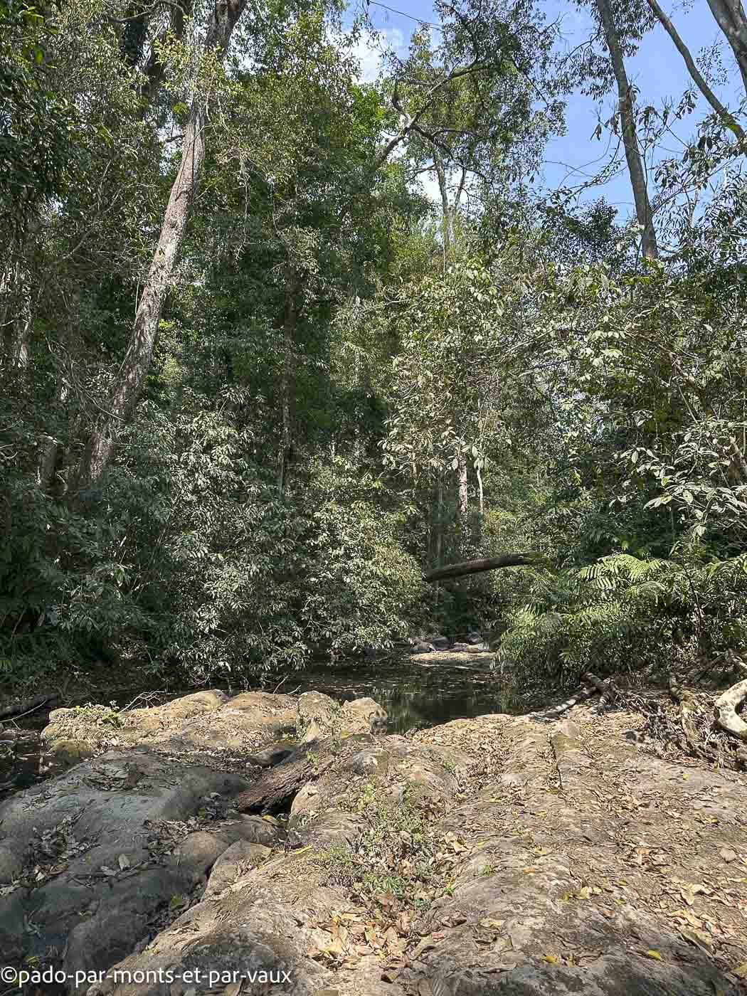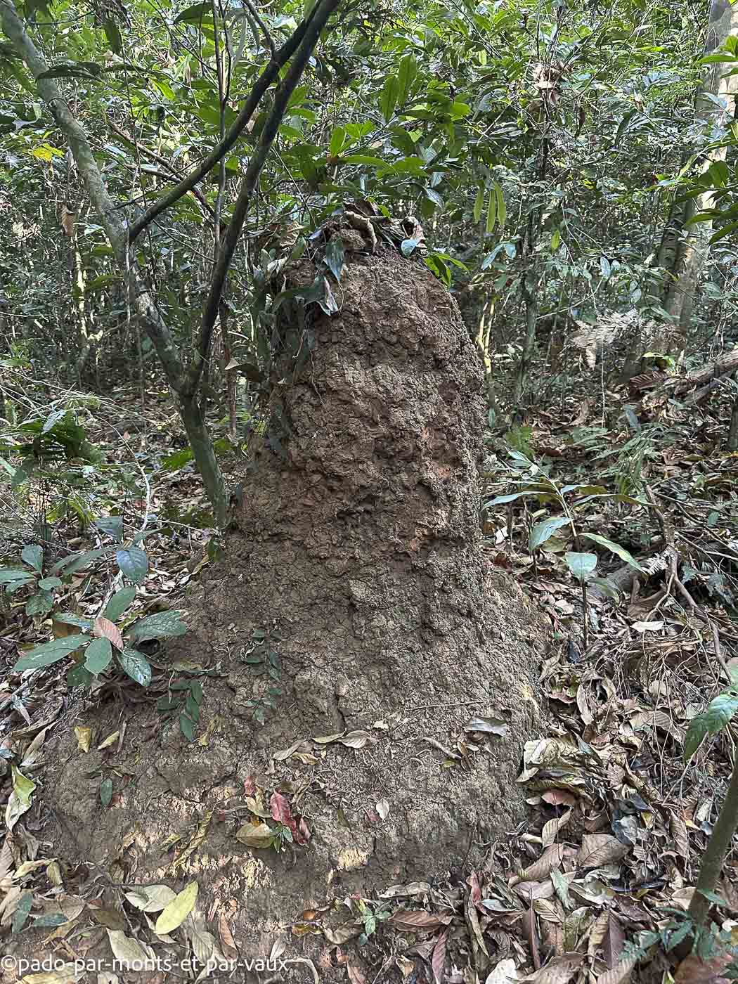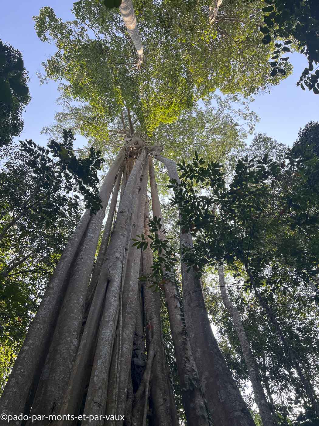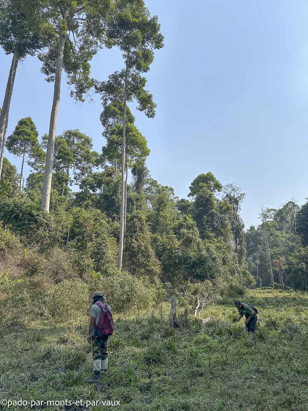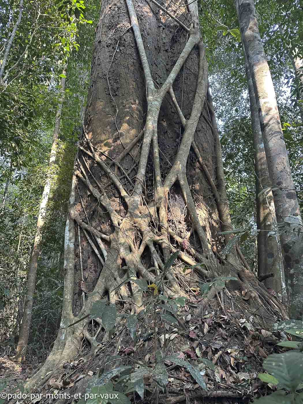 La végétation est superbe avec des arbres immenses, des lianes, des ficus étrangleurs monstrueux. Certaines lianes sont couvertes d’excroissances et le nom en thaï évoque le dos d’un dragon. Quelques arbres portent les traces de griffures d’ours malais. Il y a bien quelques chemins, mais le plus souvent Whisky coupe dans les sous-bois au milieu des termitières. Des papillons volètent autour de nous et nous entendons de nombreux oiseaux, même si nous les apercevons à peine dans les frondaisons.