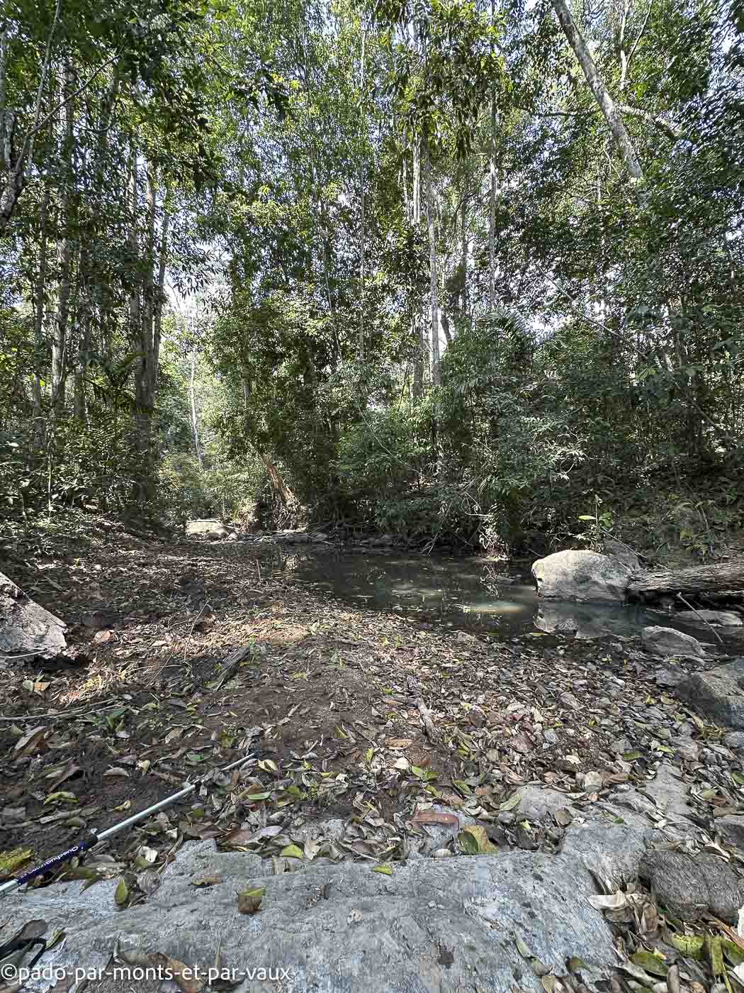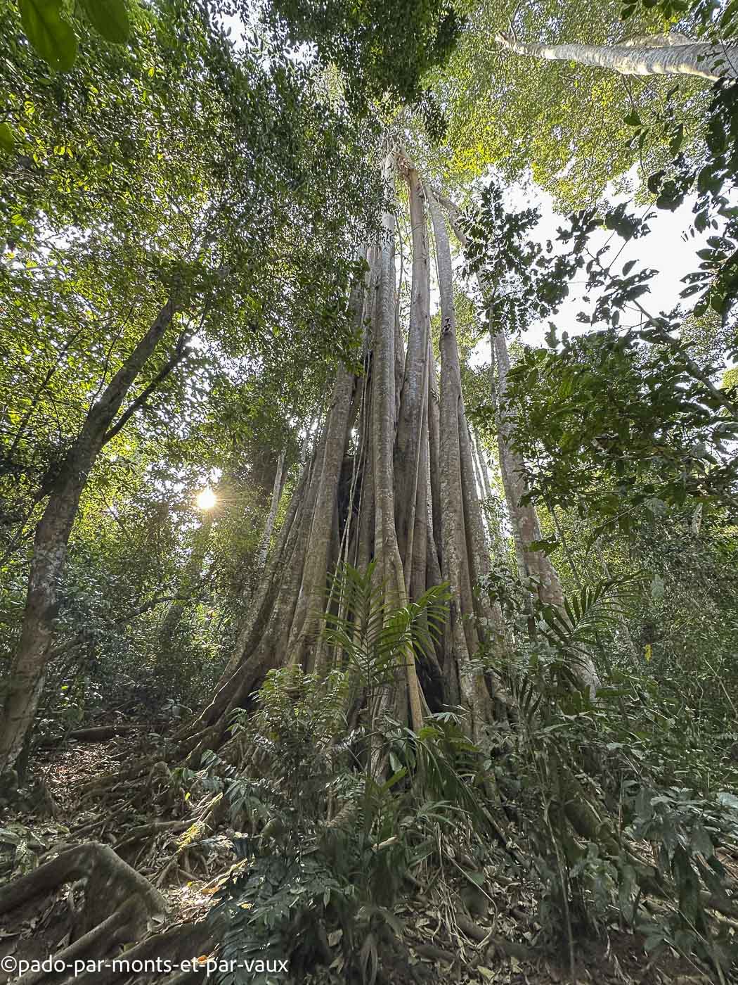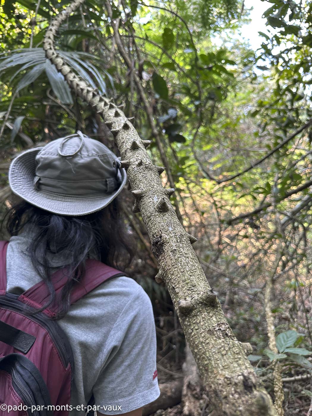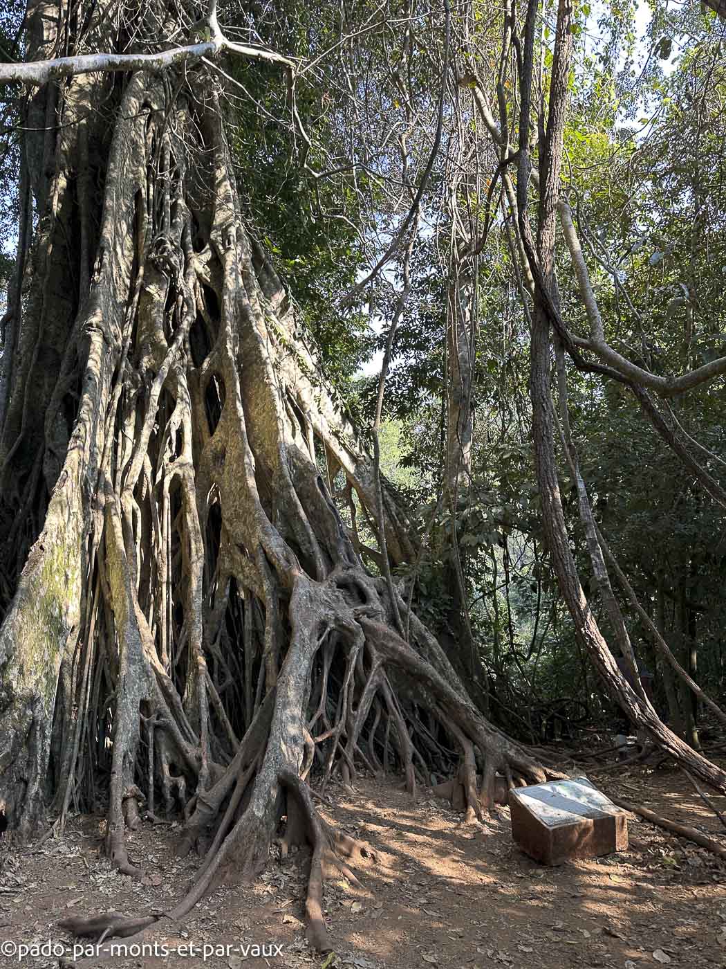La végétation est superbe avec des arbres immenses, des lianes, des ficus étrangleurs monstrueux. Certaines lianes sont couvertes d’excroissances et le nom en thaï évoque le dos d’un dragon. Quelques arbres portent les traces de griffures d’ours malais. Il y a bien quelques chemins, mais le plus souvent Whisky coupe dans les sous-bois au milieu des termitières. Des papillons volètent autour de nous et nous entendons de nombreux oiseaux, même si nous les apercevons à peine dans les frondaisons.
