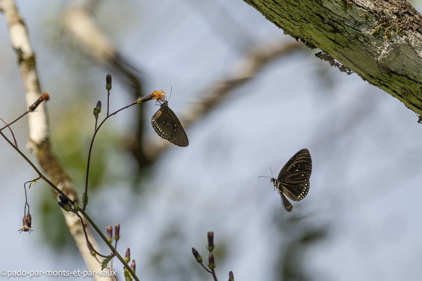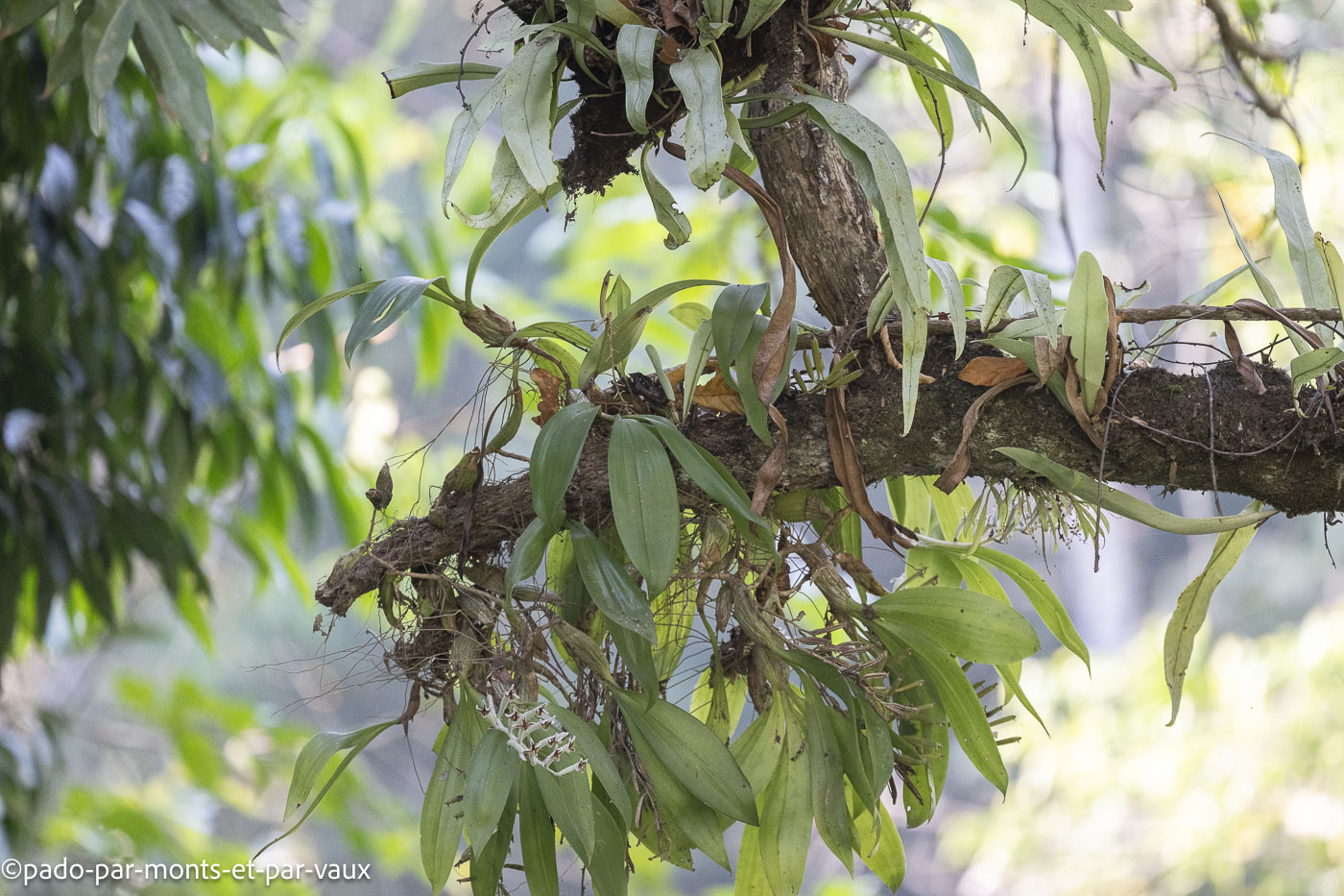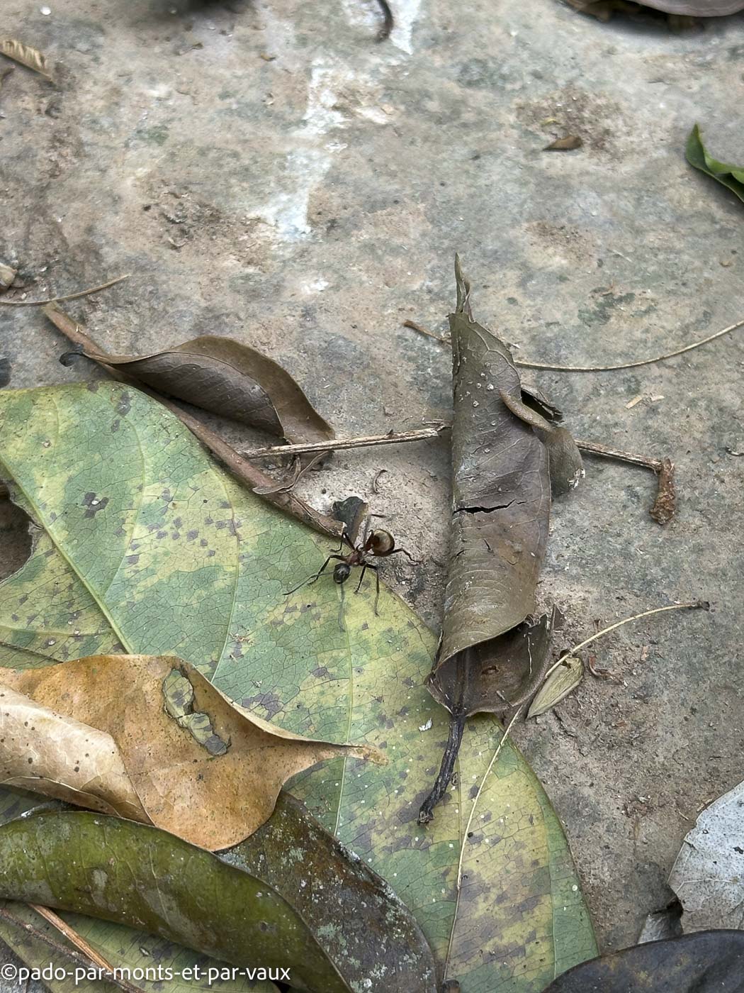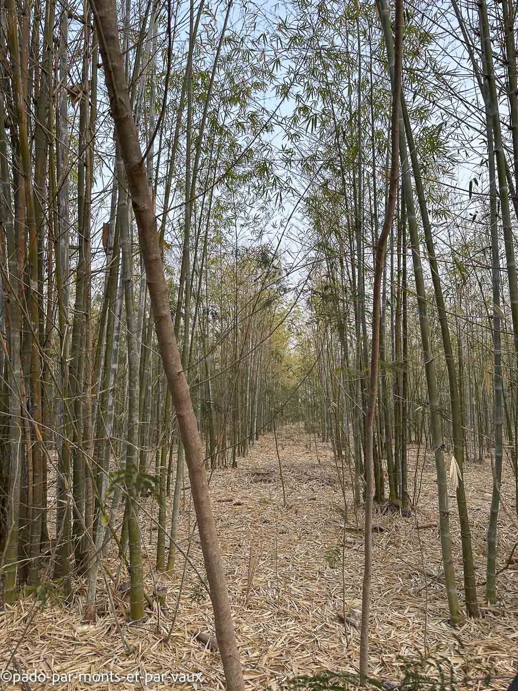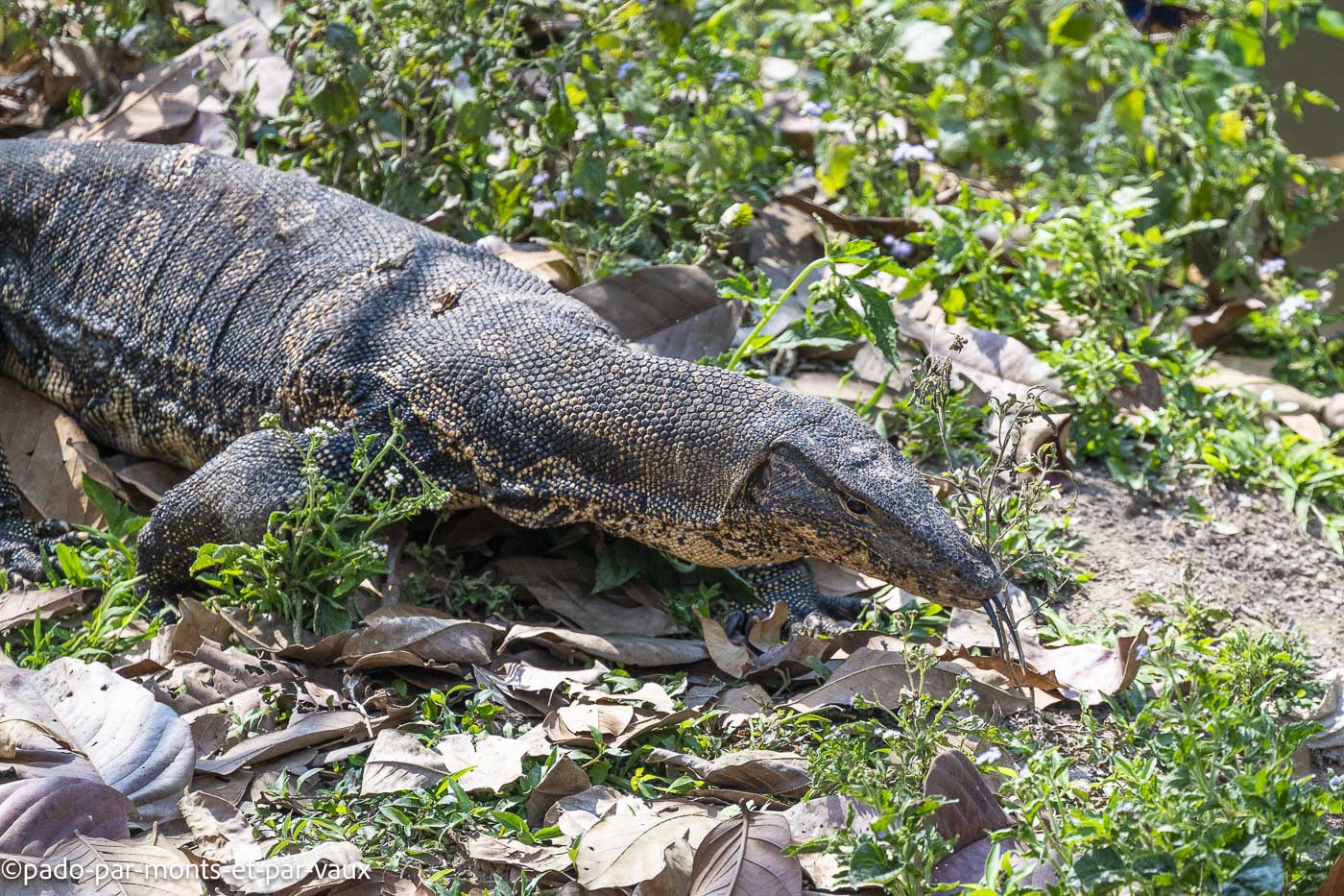 La végétation est superbe avec des arbres immenses, des lianes, des ficus étrangleurs monstrueux. Certaines lianes sont couvertes d’excroissances et le nom en thaï évoque le dos d’un dragon. Quelques arbres portent les traces de griffures d’ours malais. Il y a bien quelques chemins, mais le plus souvent Whisky coupe dans les sous-bois au milieu des termitières. Des papillons volètent autour de nous et nous entendons de nombreux oiseaux, même si nous les apercevons à peine dans les frondaisons.