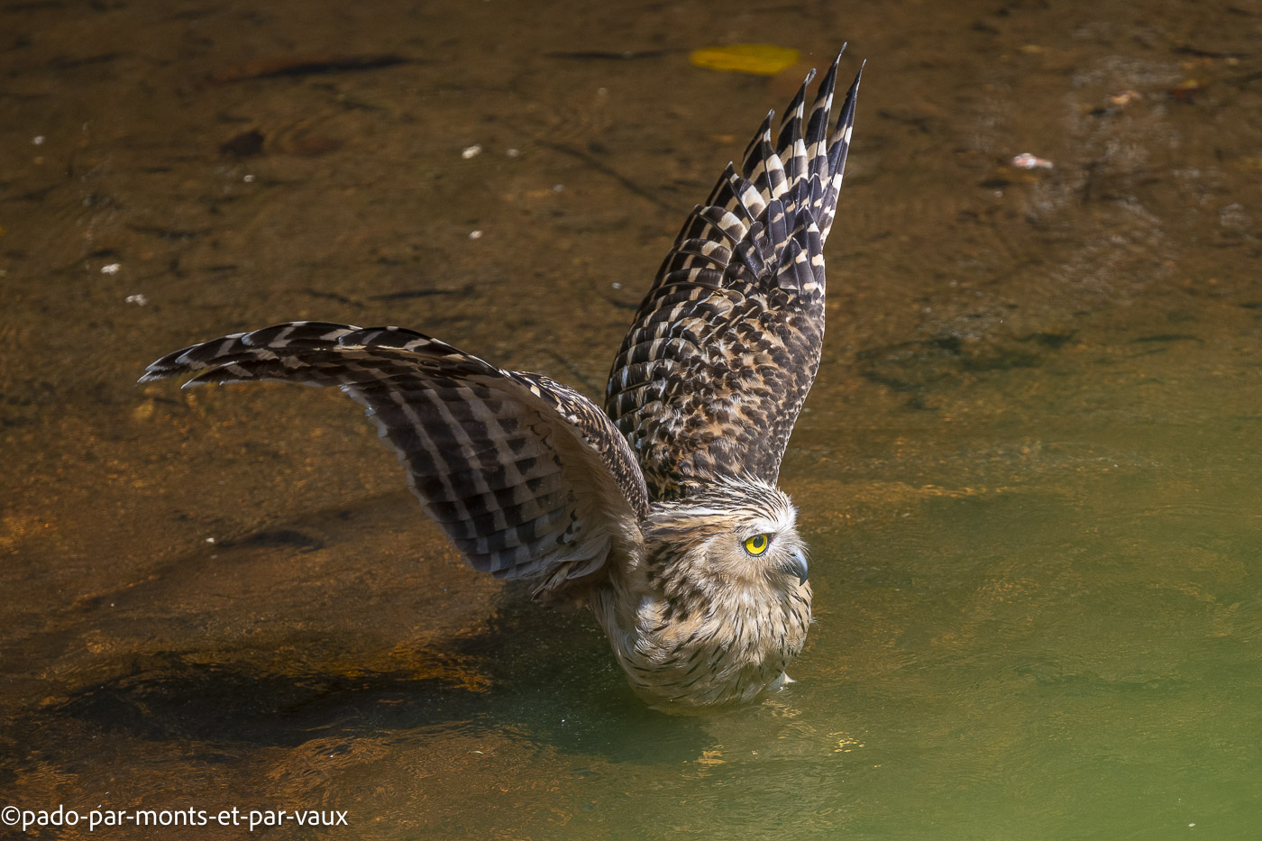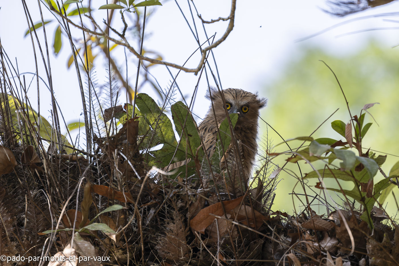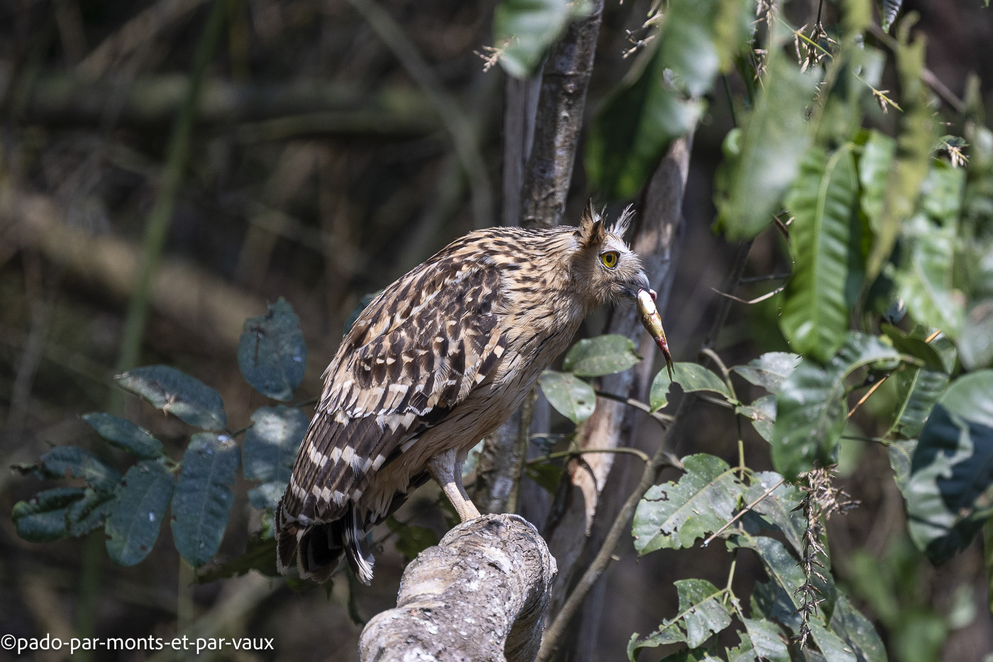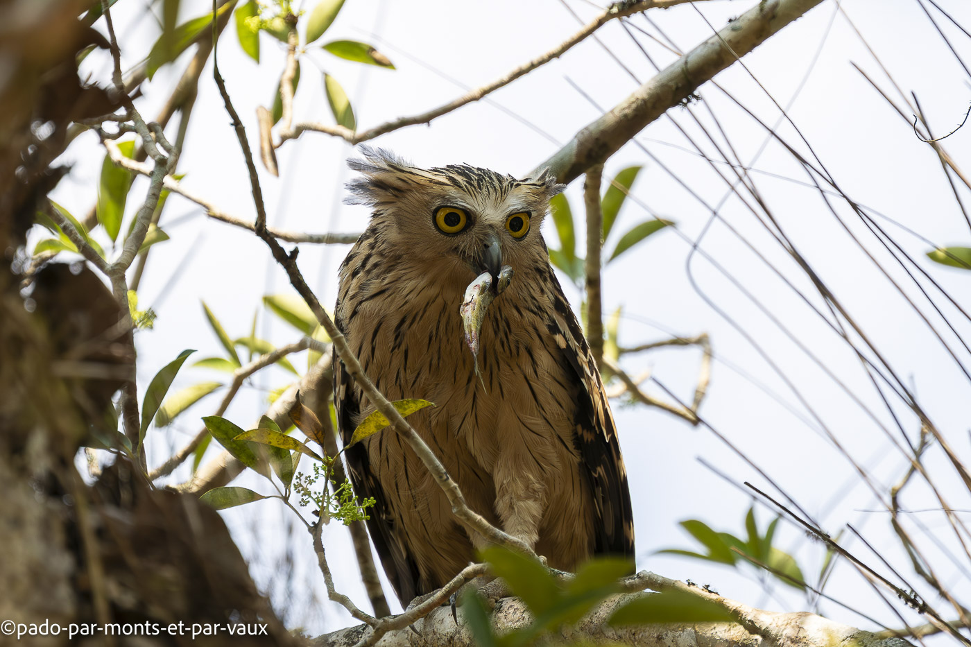 Nous nous approchons d’un petit cours d’eau où se tiennent quelques photographes avec de gros télés. La vedette du lieu est un hibou d’assez grande taille, une femelle kétoupa malais qui se tient près de son nid où se trouve un petit. Nous avons la chance de voir la mère s’envoler, aller pêcher un poisson et le ramener au jeune. Superbe !!