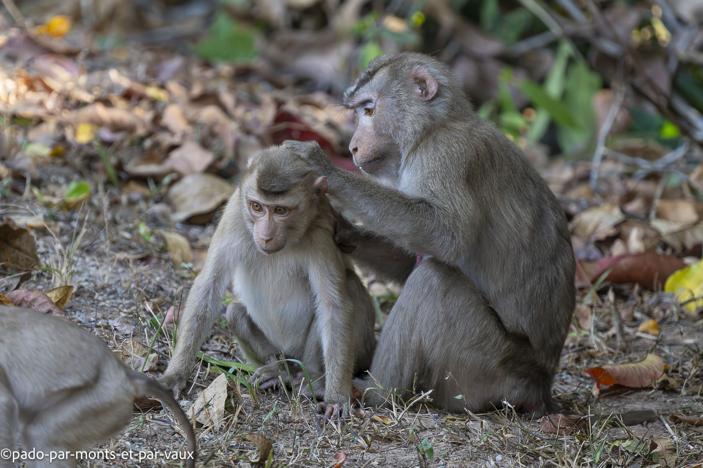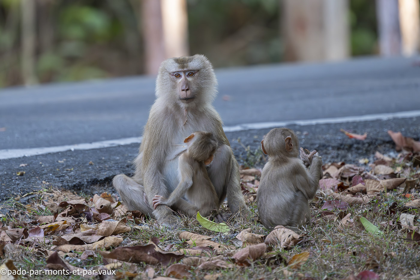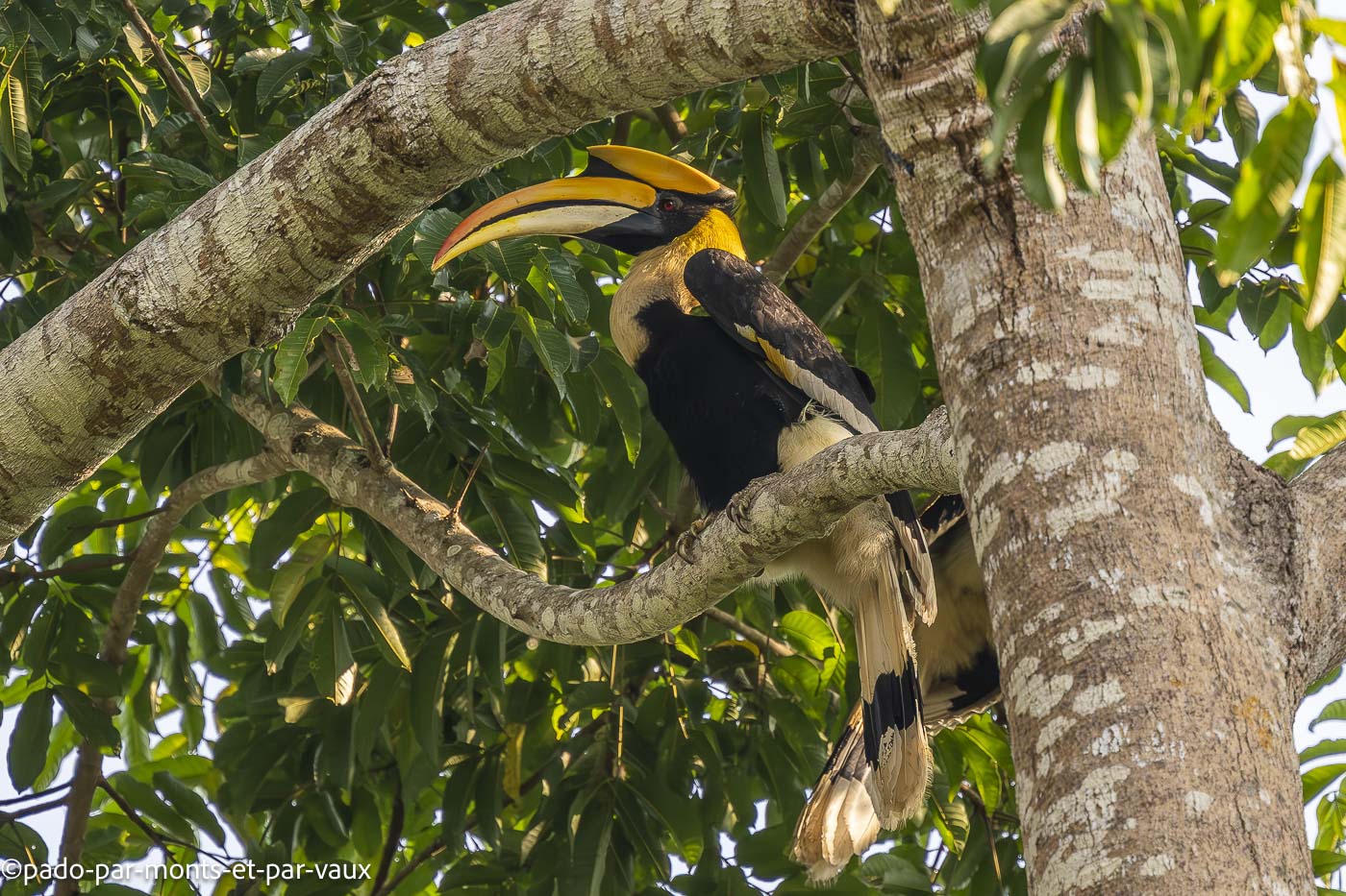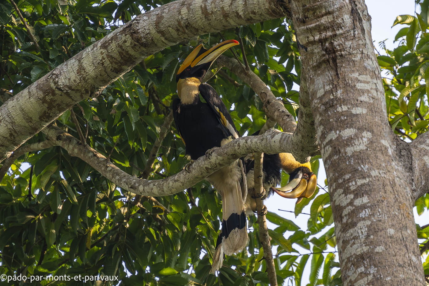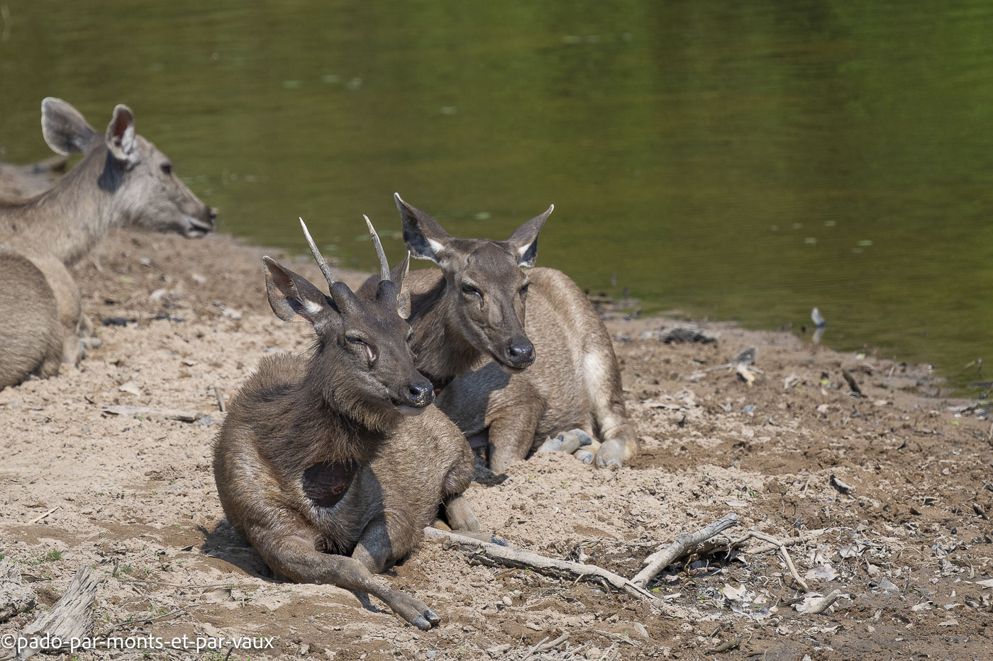 Nous passons par le camping où de nombreux cerfs Sambar se prélassent dans le plan d’eau et au milieu des tentes, puis nous repartons pour un tour en voiture dans le parc qui nous permet de voir d’autres animaux : une troupe de macaques à queue de cochon et un couple de magnifiques calaos bicornes.