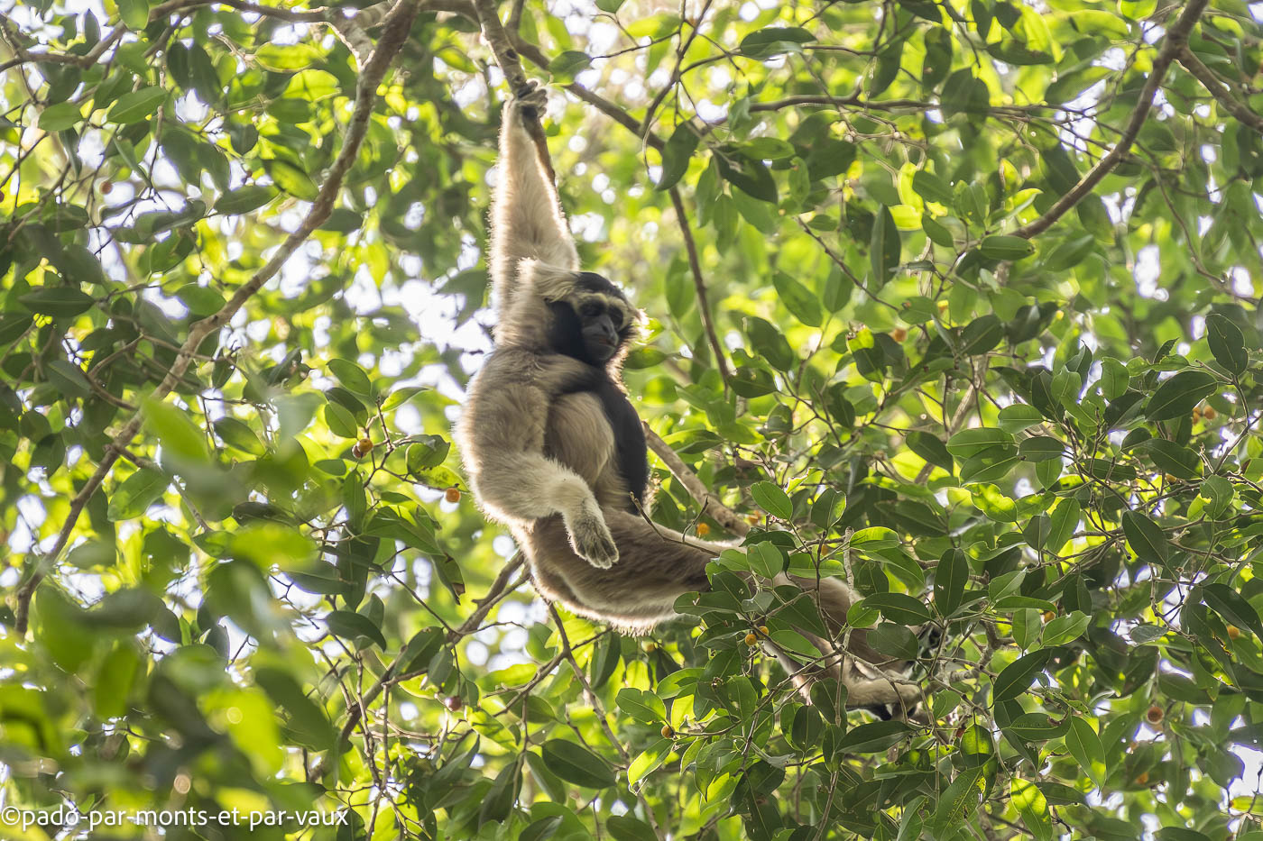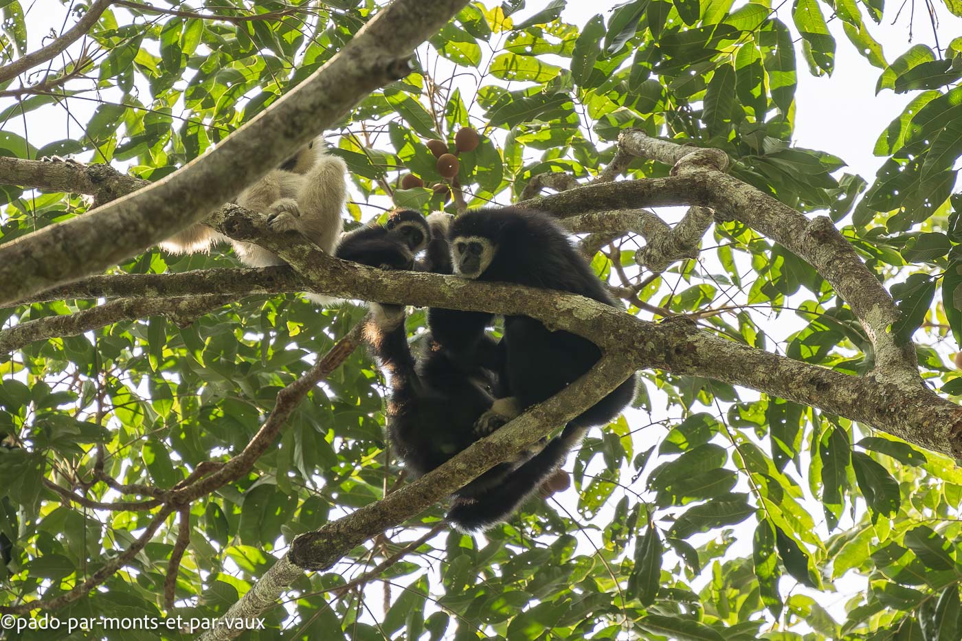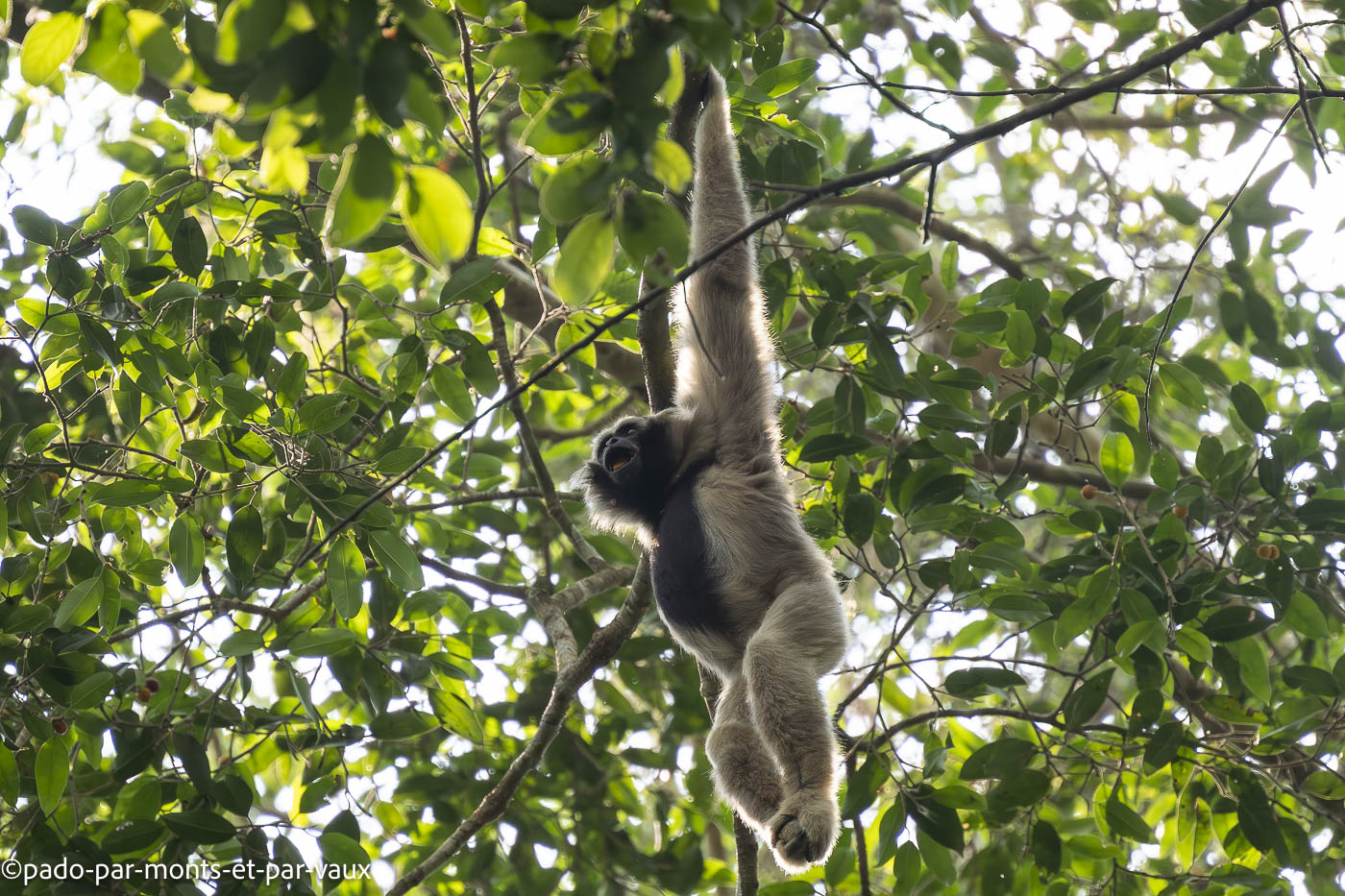 Arrêt pique-nique dans la jungle avec du poulet froid et des galettes de riz. Tony propose une « goutte » à Patrice et lui tend un breuvage parfaitement transparent dans une bouteille d’eau. Pensant que c’est de l’eau, ce dernier en prend une bonne lampée alors que c’est de l’alcool de riz ! Après la pause, Whisky nous déniche une famille de gibbons en train de faire la sieste dans les arbres. Au bout d’un moment ils commencent à bouger et on les voit mieux. Leur aisance pour se déplacer dans les arbres est impressionnante. Heureusement que j’ai le télé et Patrice les jumelles car ils sont vraiment très haut au milieu des branches feuillues.