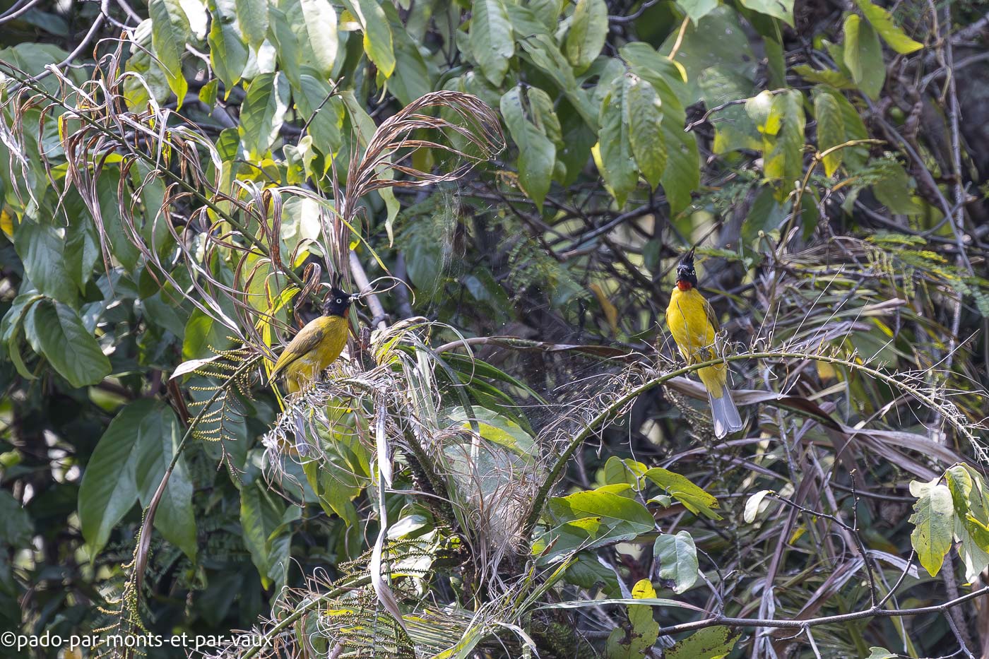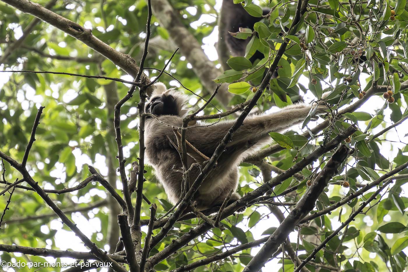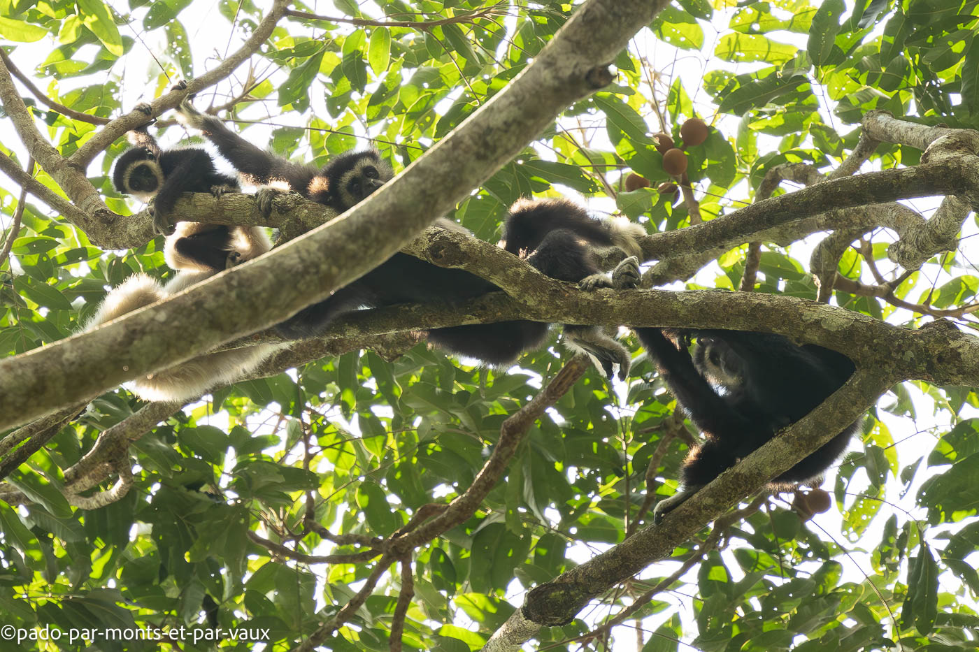 Arrêt pique-nique dans la jungle avec du poulet froid et des galettes de riz. Tony propose une « goutte » à Patrice et lui tend un breuvage parfaitement transparent dans une bouteille d’eau. Pensant que c’est de l’eau, ce dernier en prend une bonne lampée alors que c’est de l’alcool de riz ! Après la pause, Whisky nous déniche une famille de gibbons en train de faire la sieste dans les arbres. Au bout d’un moment ils commencent à bouger et on les voit mieux. Leur aisance pour se déplacer dans les arbres est impressionnante. Heureusement que j’ai le télé et Patrice les jumelles car ils sont vraiment très haut au milieu des branches feuillues.