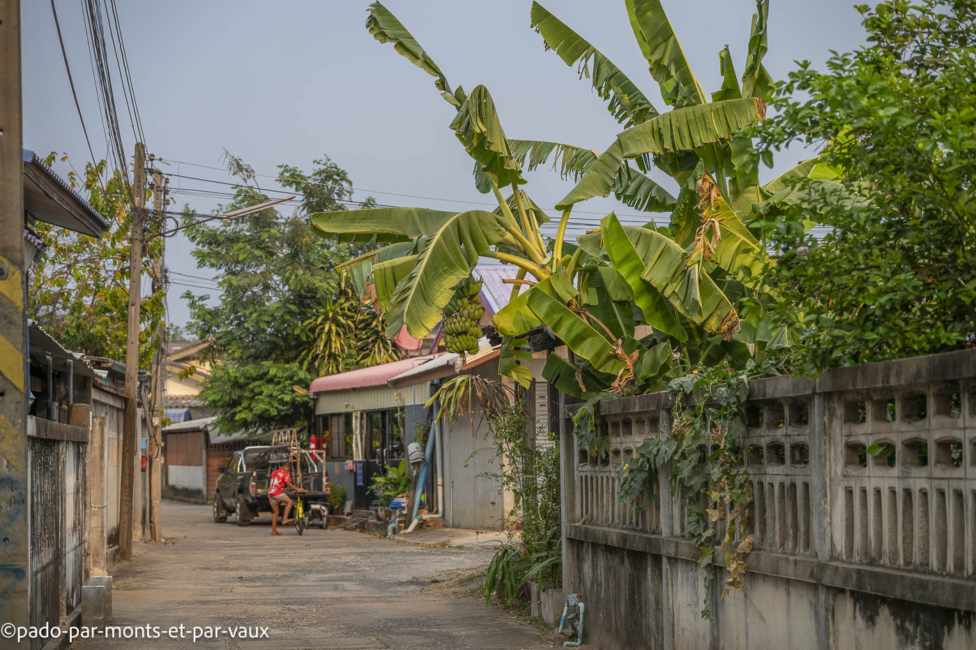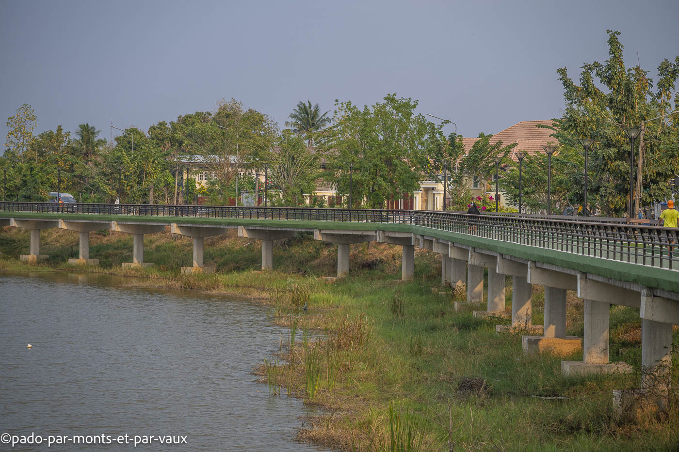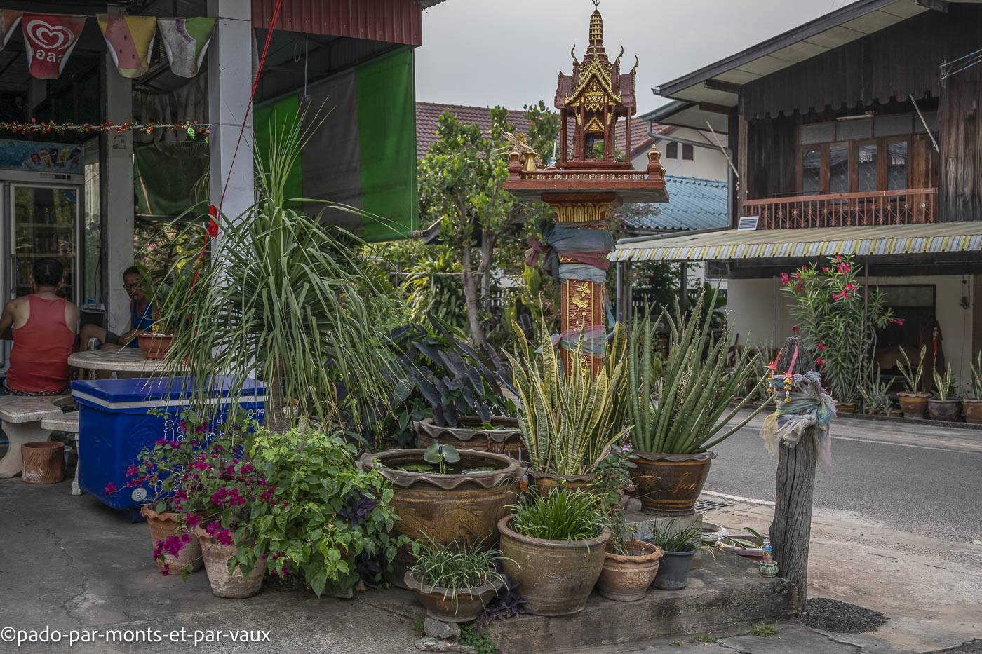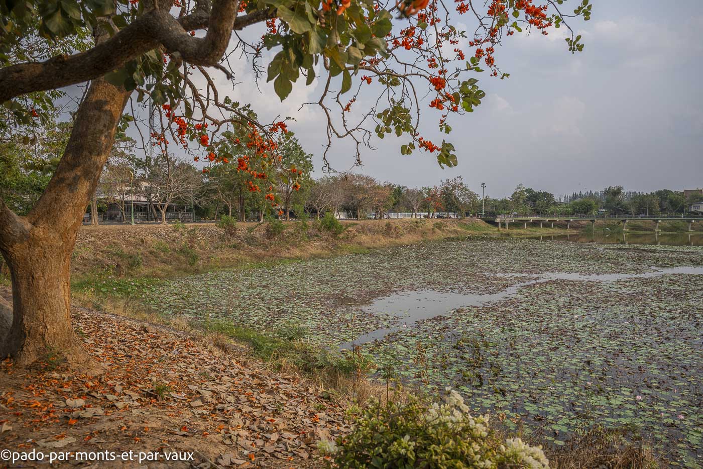 Pause-lecture en attendant que la température extérieure soit plus supportable. Vers 16h nous sortons nous promener. Tour à pied d’un grand plan d’eau artificiel bordé de maisons cossues. Nous empruntons la piste cyclable qui en fait le tour. Le coin est assez joli avec des arbres et des lotus dans l’eau. Nous poursuivons par les rues au hasard de la marche. Toutes les maisons, même les plus modestes ont des plantes disposées devant la façade, un petit autel avec des fleurs et une vasque avec de l’eau. C’est assez coquet.
