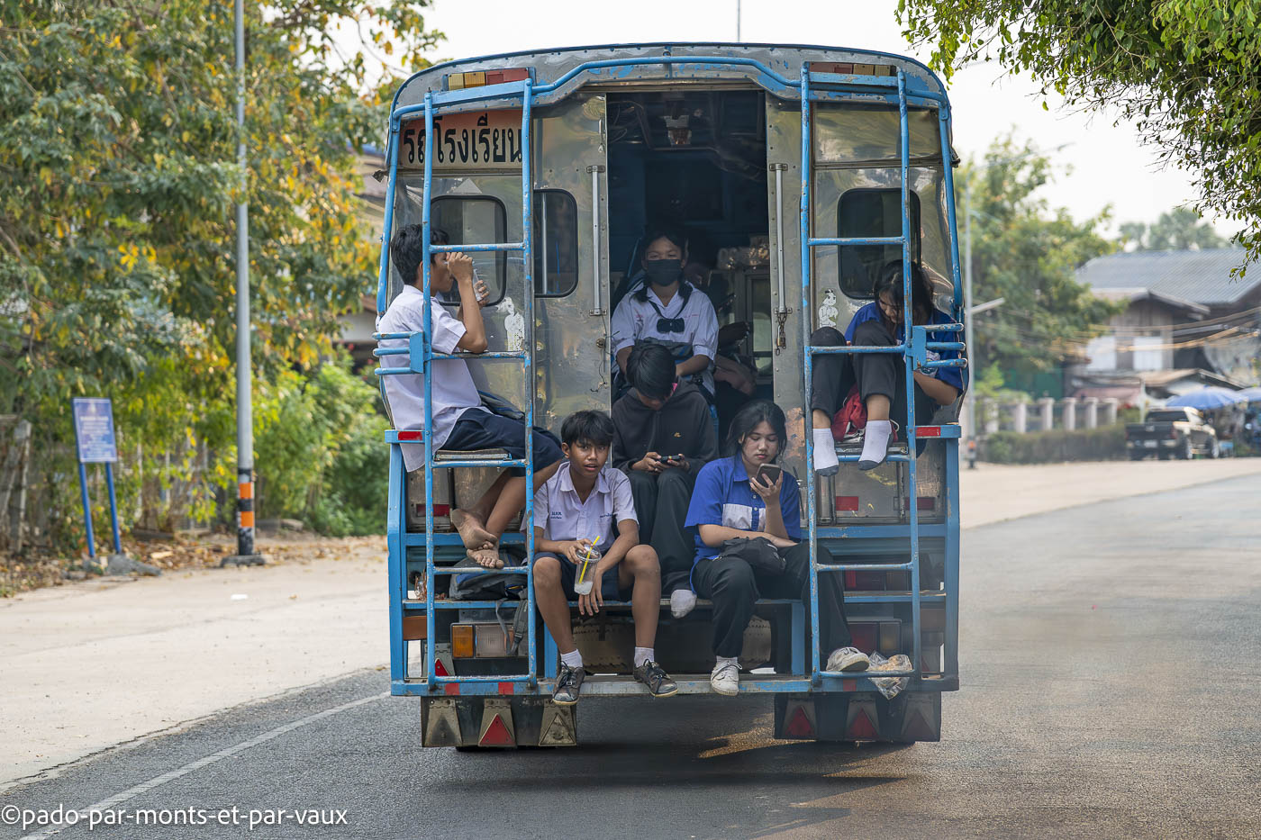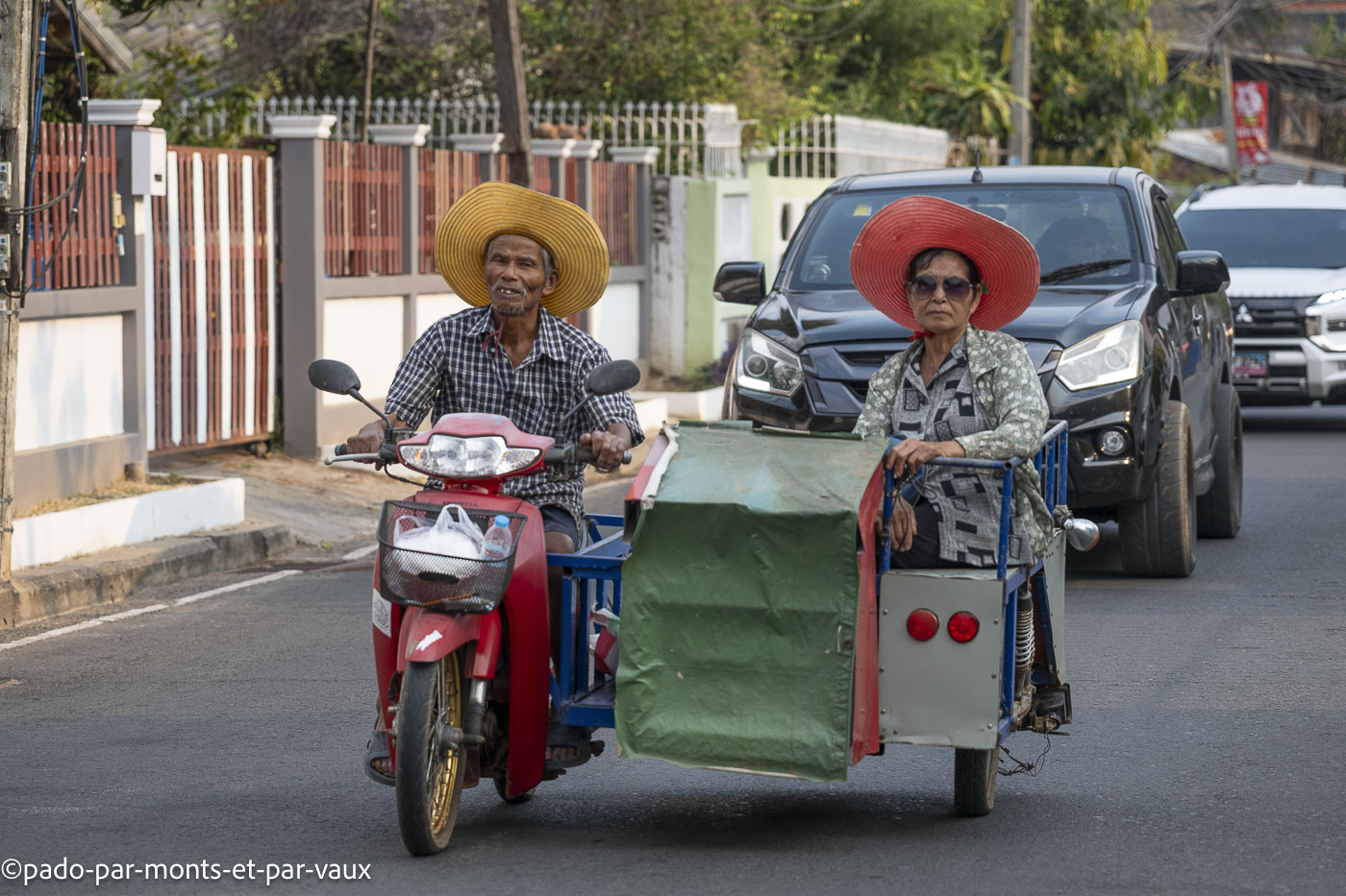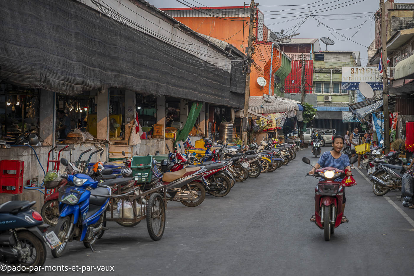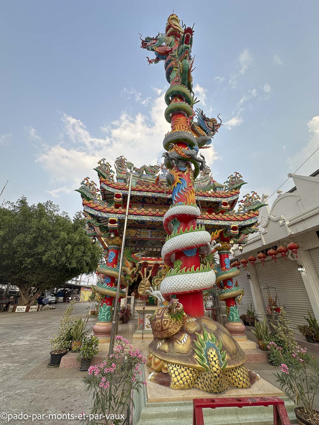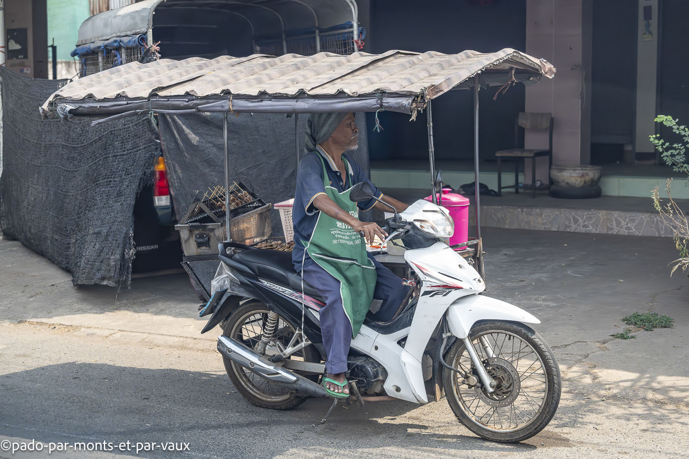 Traversée d’un temple chinois aux couleurs criardes et de temples bouddhistes où les moines vaquent à leurs occupations. Les petits stands de cuisine de rue sont fixés à des mobylettes et promènent au gré de leurs propriétaires.