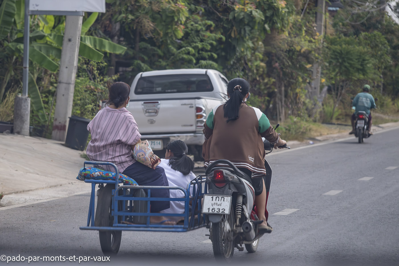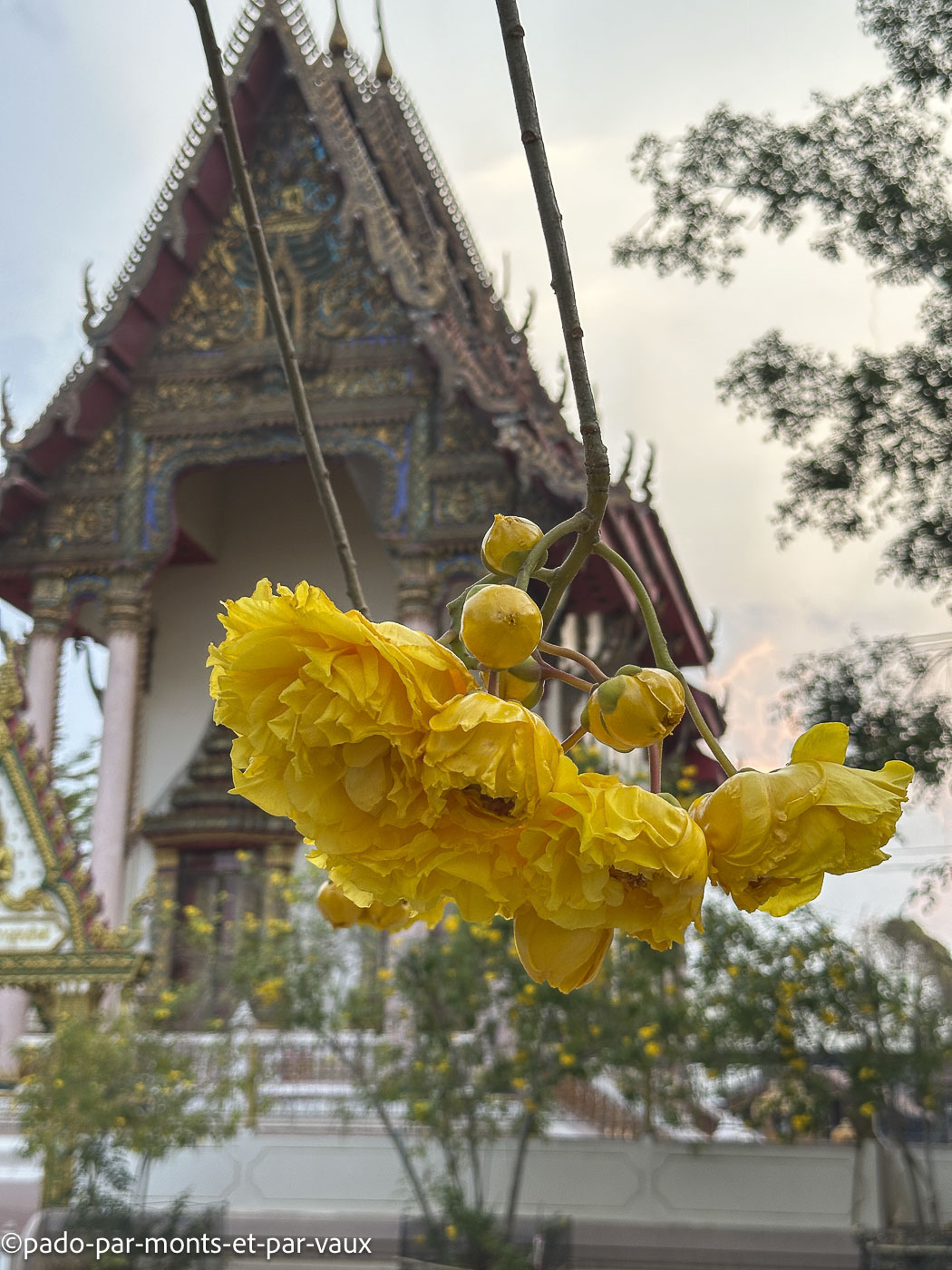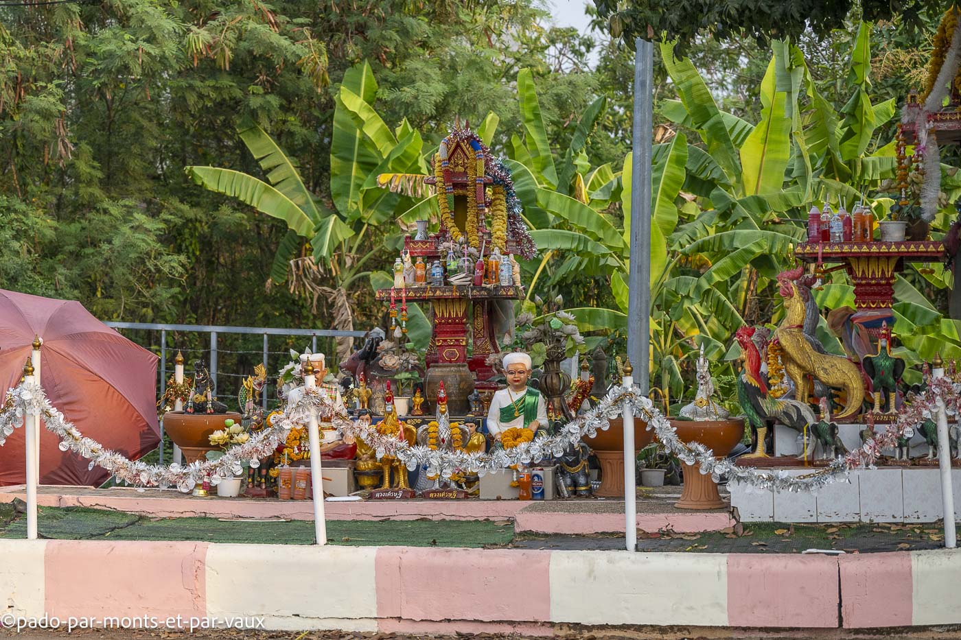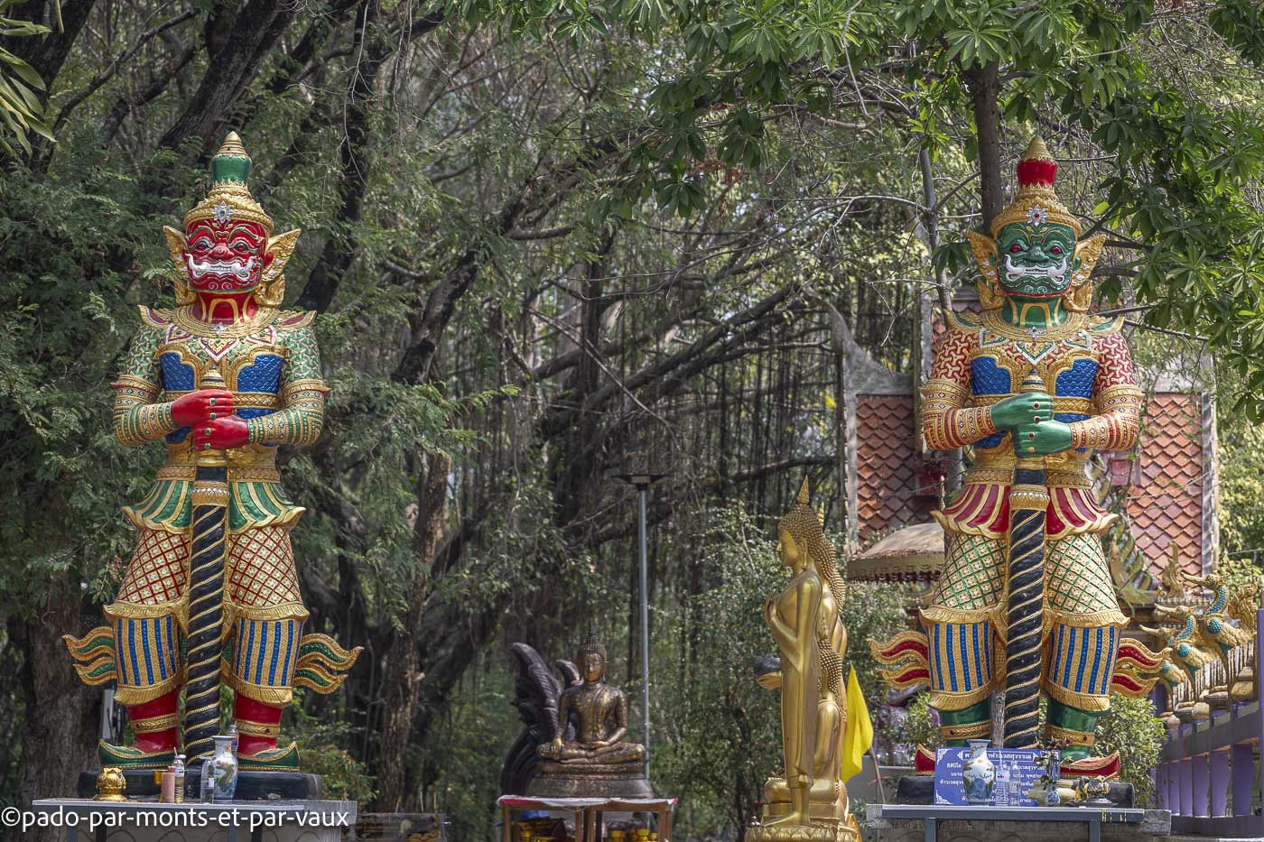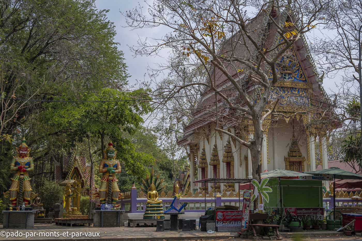 Nous reprenons la voiture pour gagner un autre temple, à proximité de la ville de Prakhon Chai et à une soixantaine de kilomètres de Buriram. Nous nous arrêtons devant un temple thaï très coloré gardé par deux énormes guerriers.