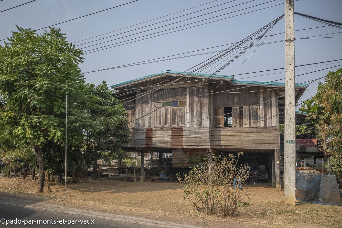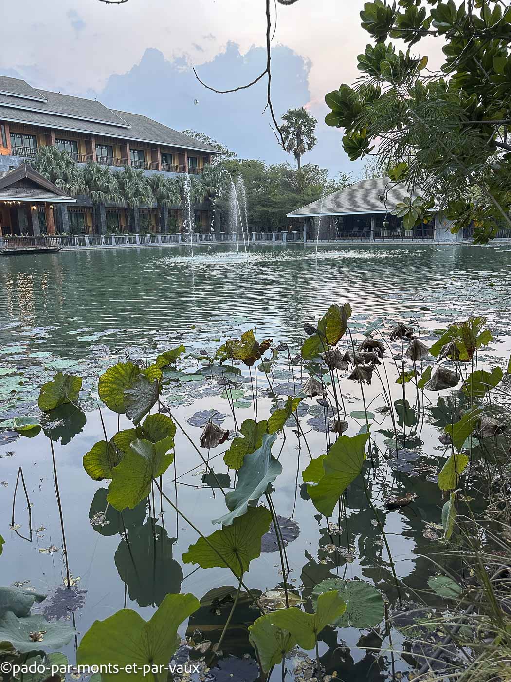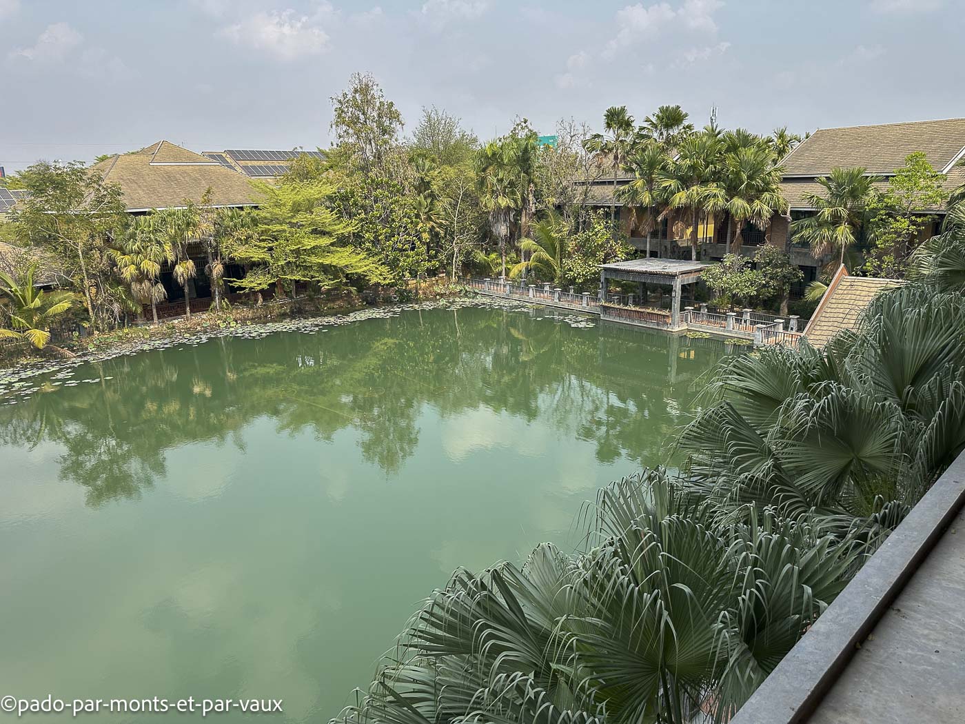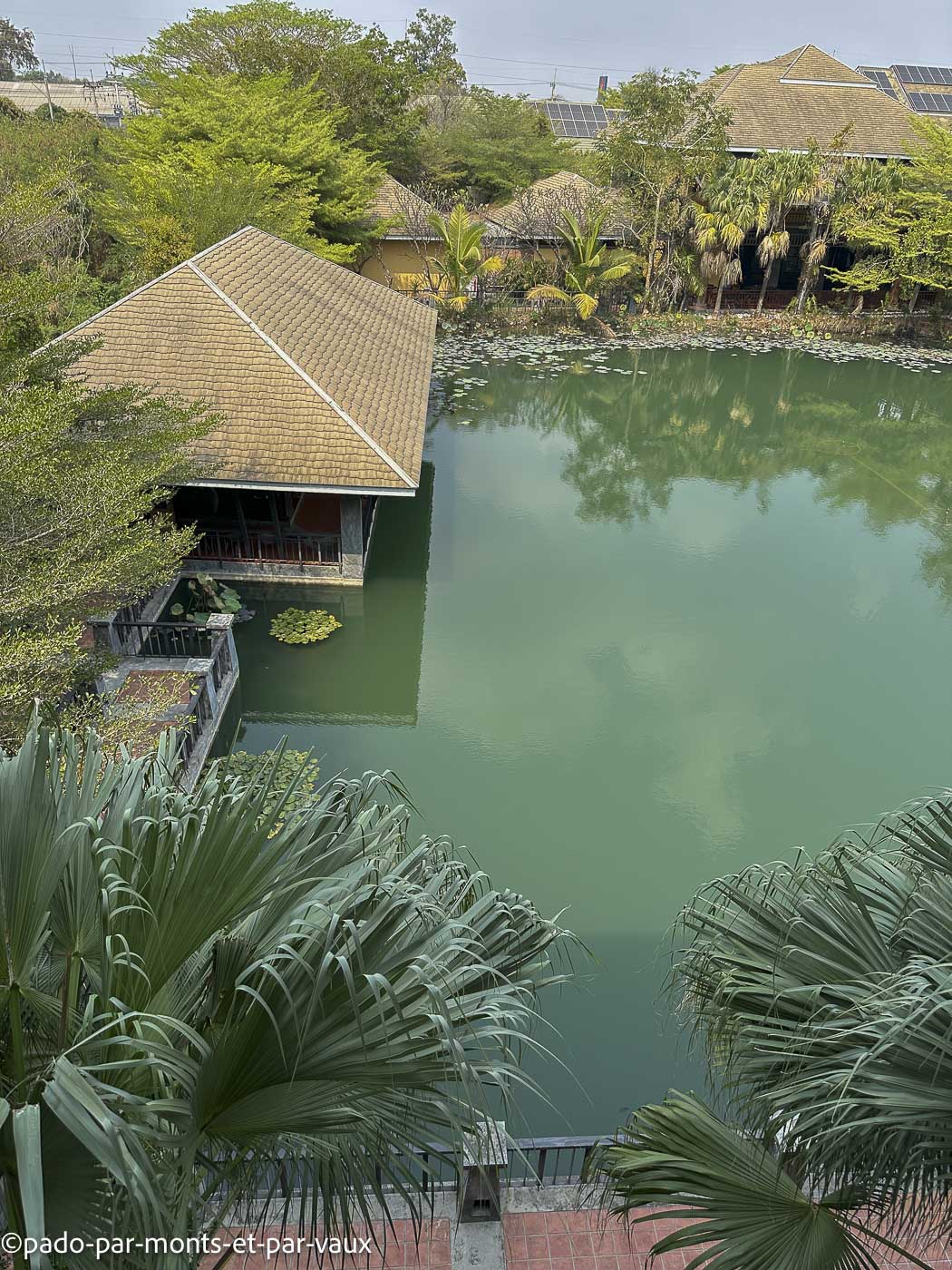 Le chauffeur nous récupère vers 13h et nous accompagne à l’hôtel de l’amour à Prakhon Chai, à quelques kilomètres de Buriram. C’est un hôtel de grande taille, plus luxueux que celui de hier mais assez impersonnel. Nous avons une grande chambre bien équipée avec un balcon donnant sur un bassin couvert de lotus. Nous allons manger un morceau dans un restaurant juste à côté en attendant que la chambre soit prête. Le repas est à oublier : croquettes au fromage insipides pour moi et nouilles au porc, très très épicées pour Patrice.