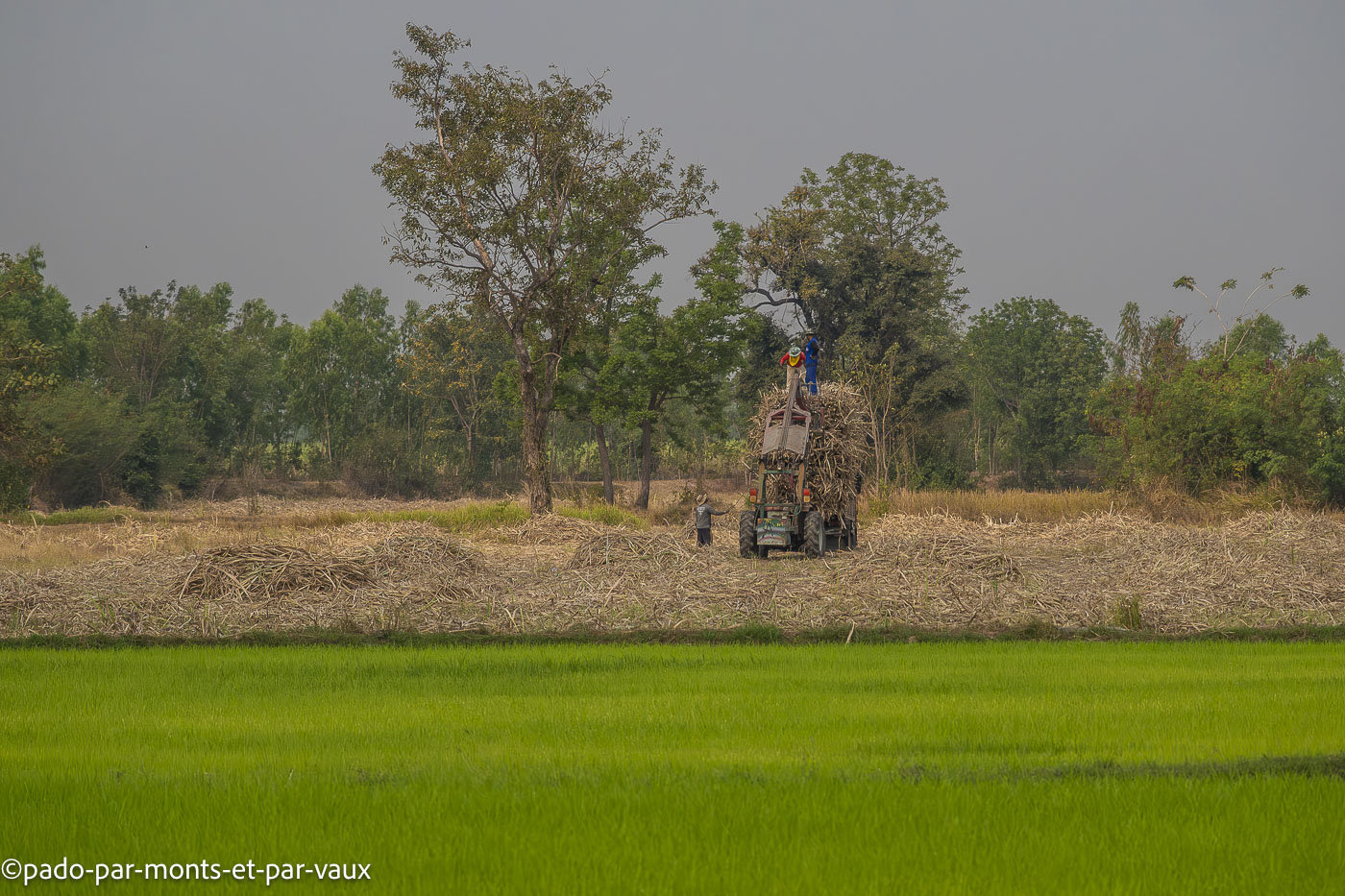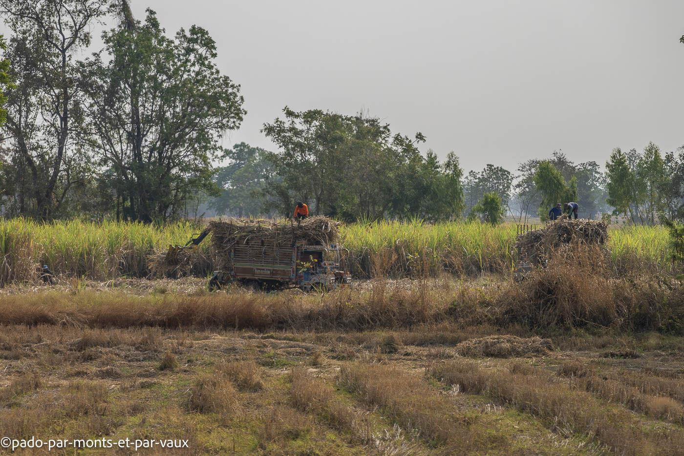 Après une bonne nuit, petit déjeuner agréable à l’hôtel (servi à l’assiette avec salade de légumes, œufs et fruits). Aujourd’hui le chauffeur nous récupère à 8h30 et nous voilà partis pour deux heures et demie de route au milieu des champs de canne à sucre. C’est la période de la coupe et nous croisons de nombreux camions qui débordent de cannes.