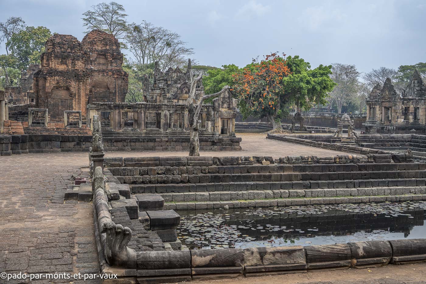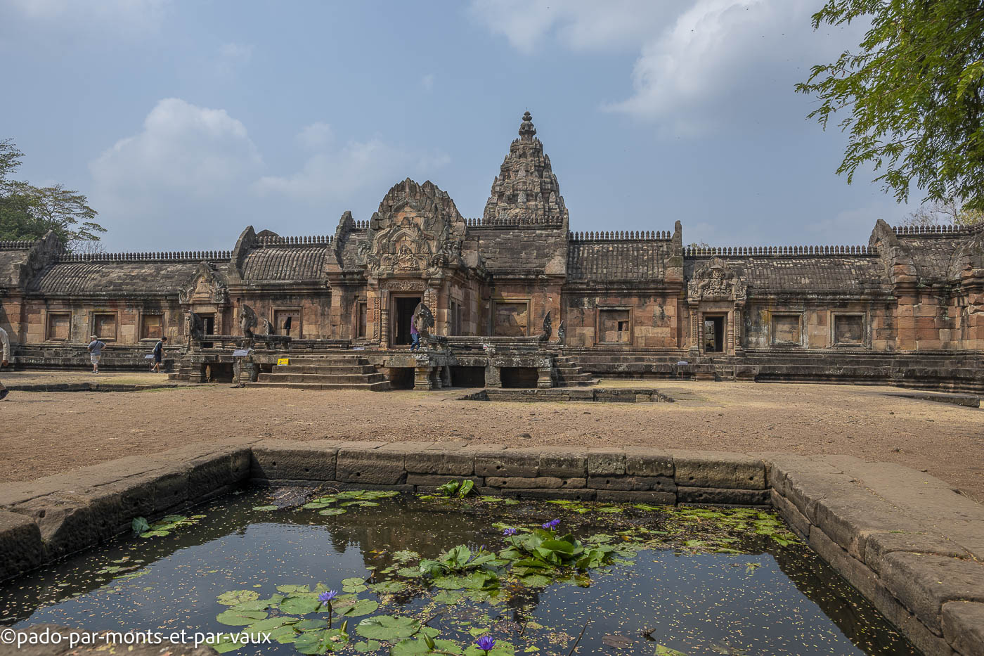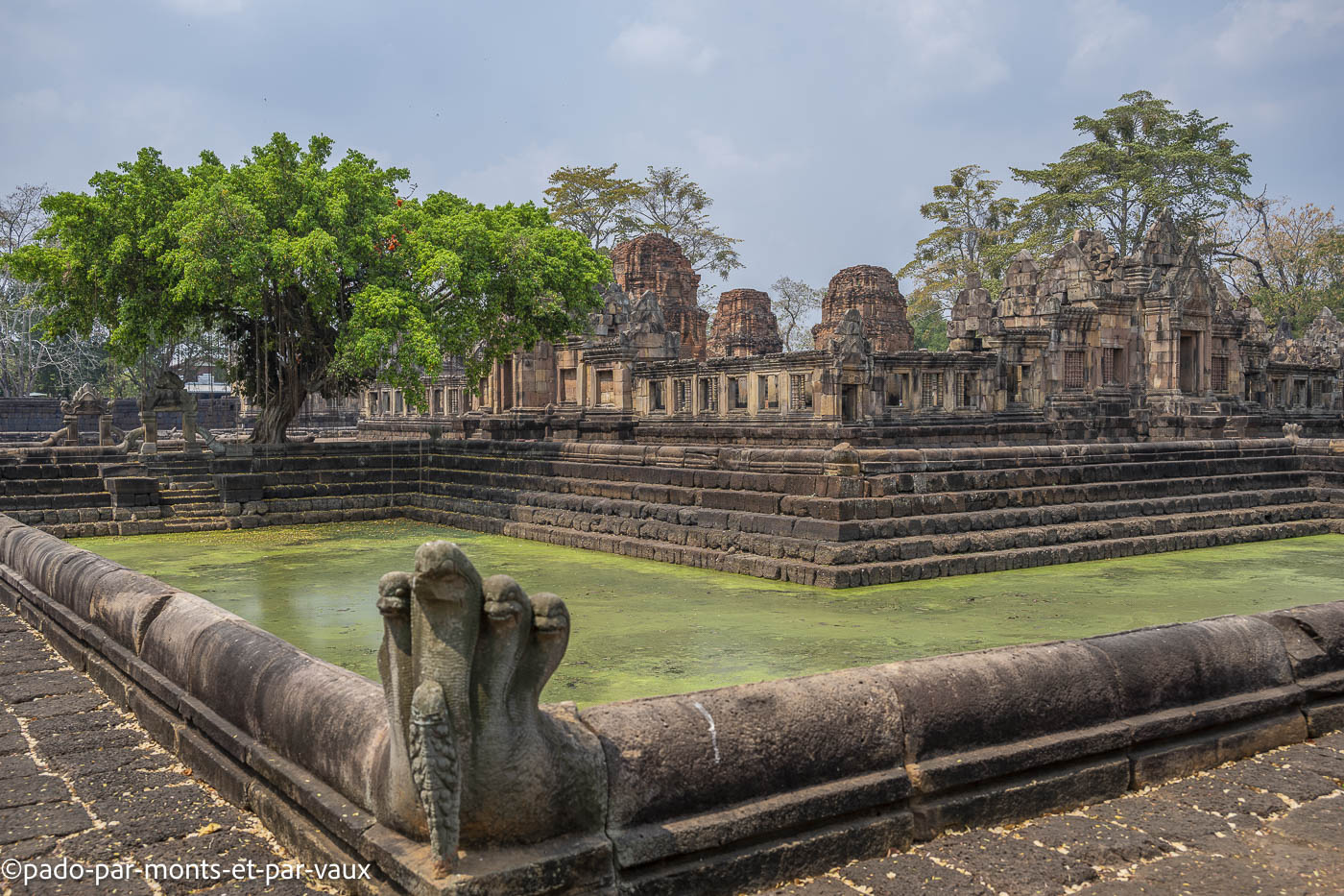 Prasat Hin Phanom Rung : premier temple de la journée. Il est juché à 350m d’altitude à l’emplacement d’un ancien volcan. Sa construction a commencé au 10ème siècle et s’est étalée sur trois siècles. Une longue voie sacrée mène au pont aux nagas. Cette voie processionnelle symbolisait la distance spirituelle entre la terre et le monde céleste. Des escaliers raides donnent ensuite accès à l’esplanade du temple ornée de bassins carrés.