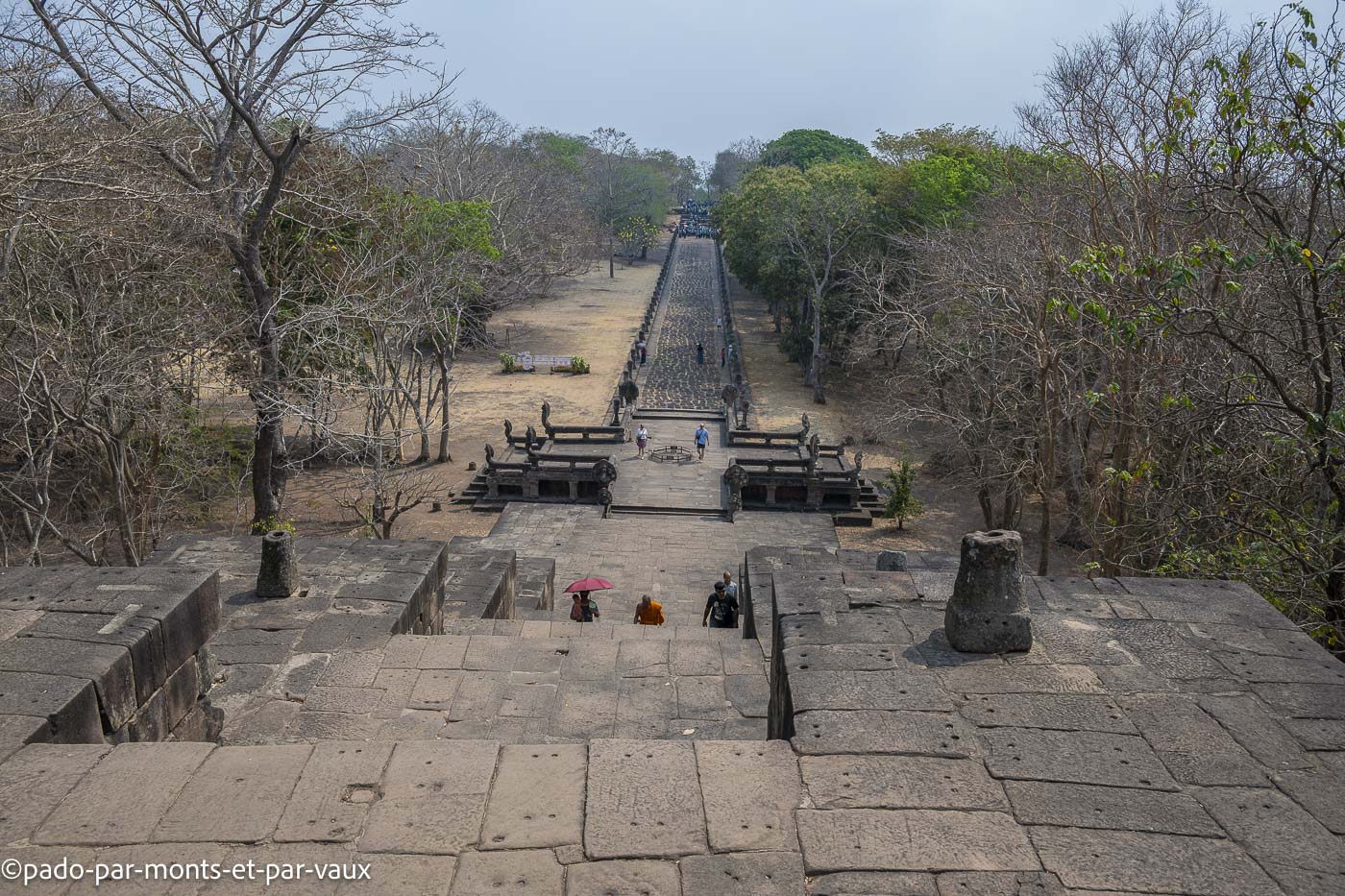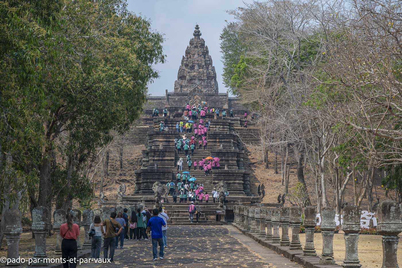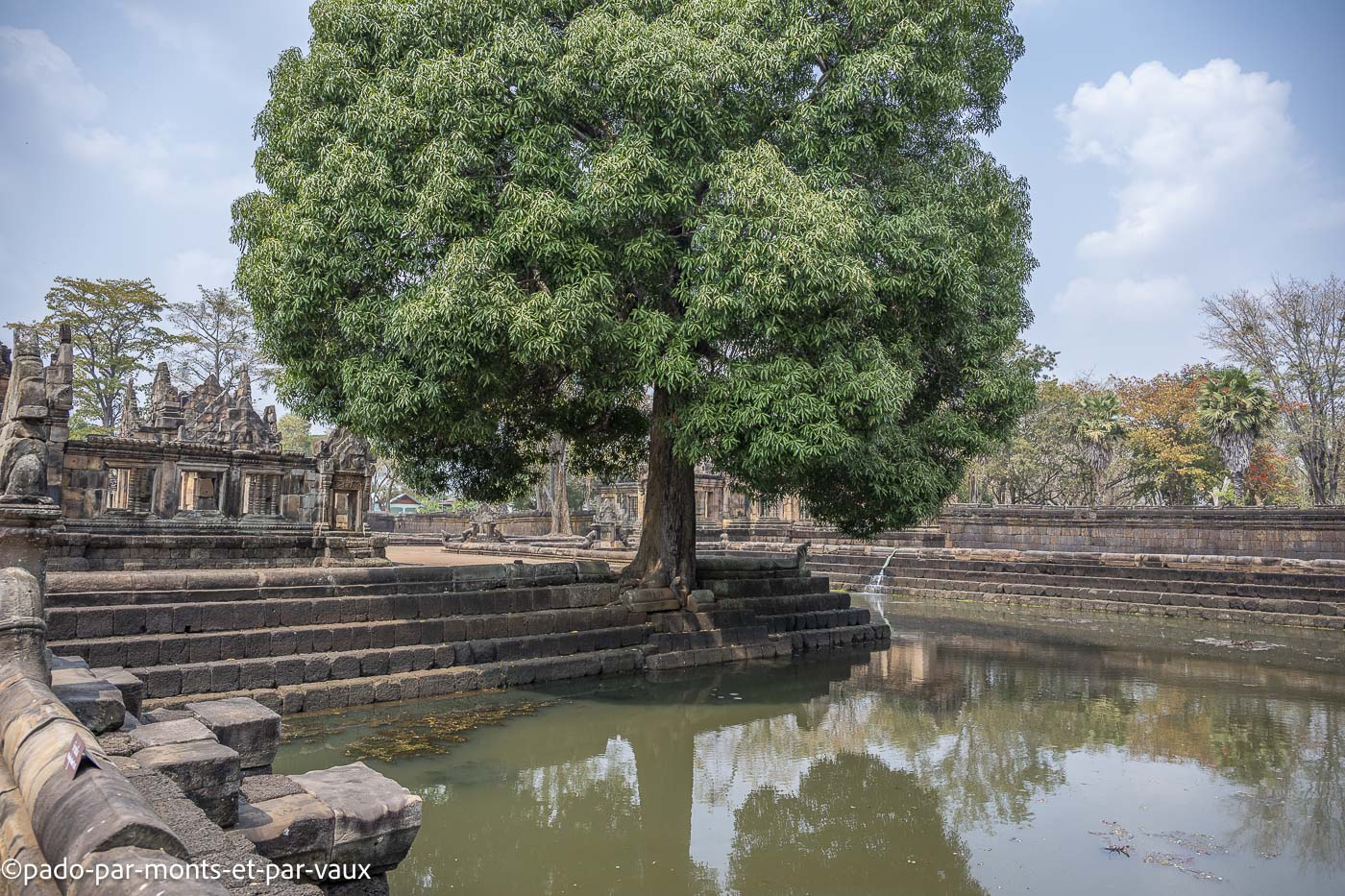 Prasat Hin Phanom Rung : premier temple de la journée. Il est juché à 350m d’altitude à l’emplacement d’un ancien volcan. Sa construction a commencé au 10ème siècle et s’est étalée sur trois siècles. Une longue voie sacrée mène au pont aux nagas. Cette voie processionnelle symbolisait la distance spirituelle entre la terre et le monde céleste. Des escaliers raides donnent ensuite accès à l’esplanade du temple ornée de bassins carrés.