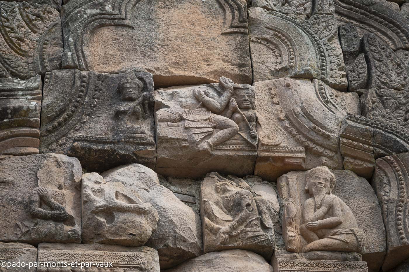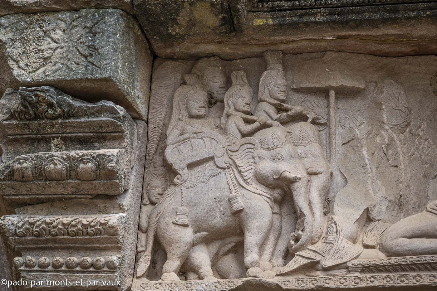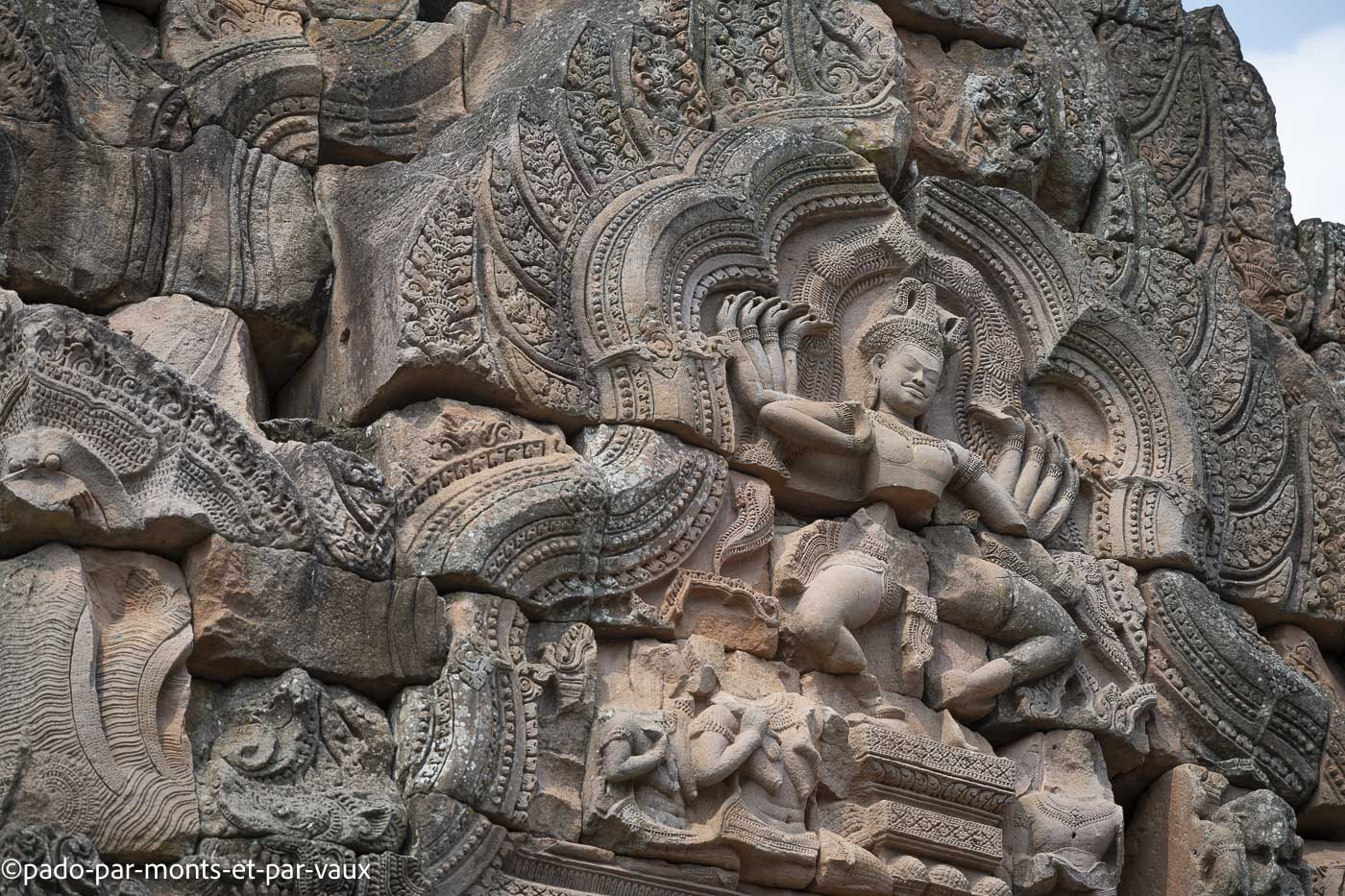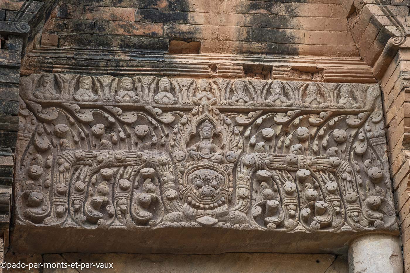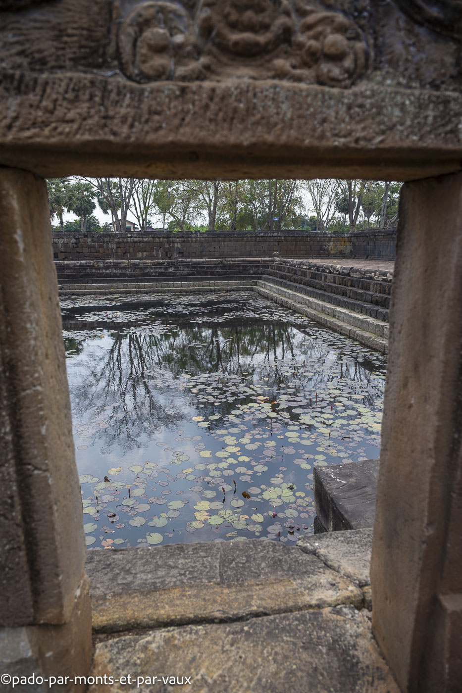 Un deuxième pont aux nagas précède le porche principal qui permet d’entrer dans la dernière enceinte. Le sanctuaire central était exclusivement réservé au roi. On peut admirer un peu partout de très beaux décors sculptés et des Singhas, créatures mythiques à tête de lion qui sont des gardiens. L’ensemble est vraiment magnifique. Il y a assez peu de touristes mais pendant notre visite une nuée de scolaires a déferlé sur les bâtiments comme un vol de sauterelles et est repartie quasiment aussi vite.