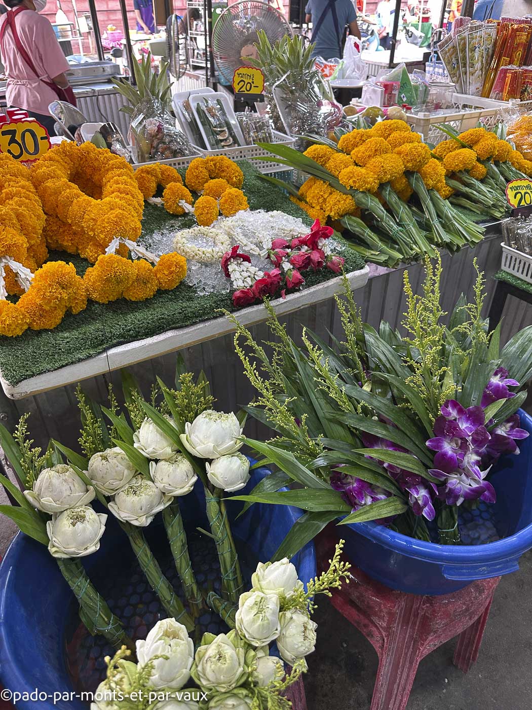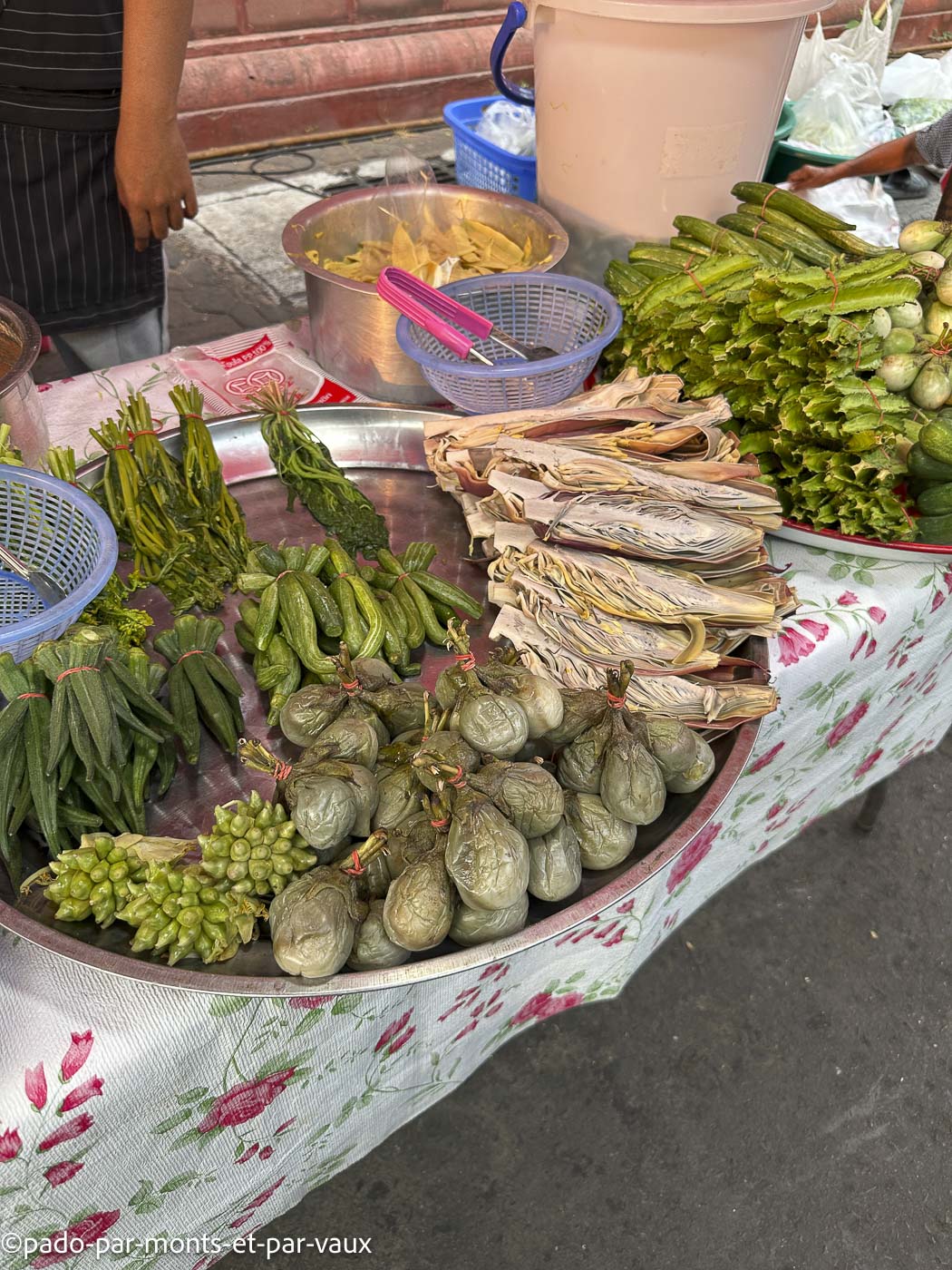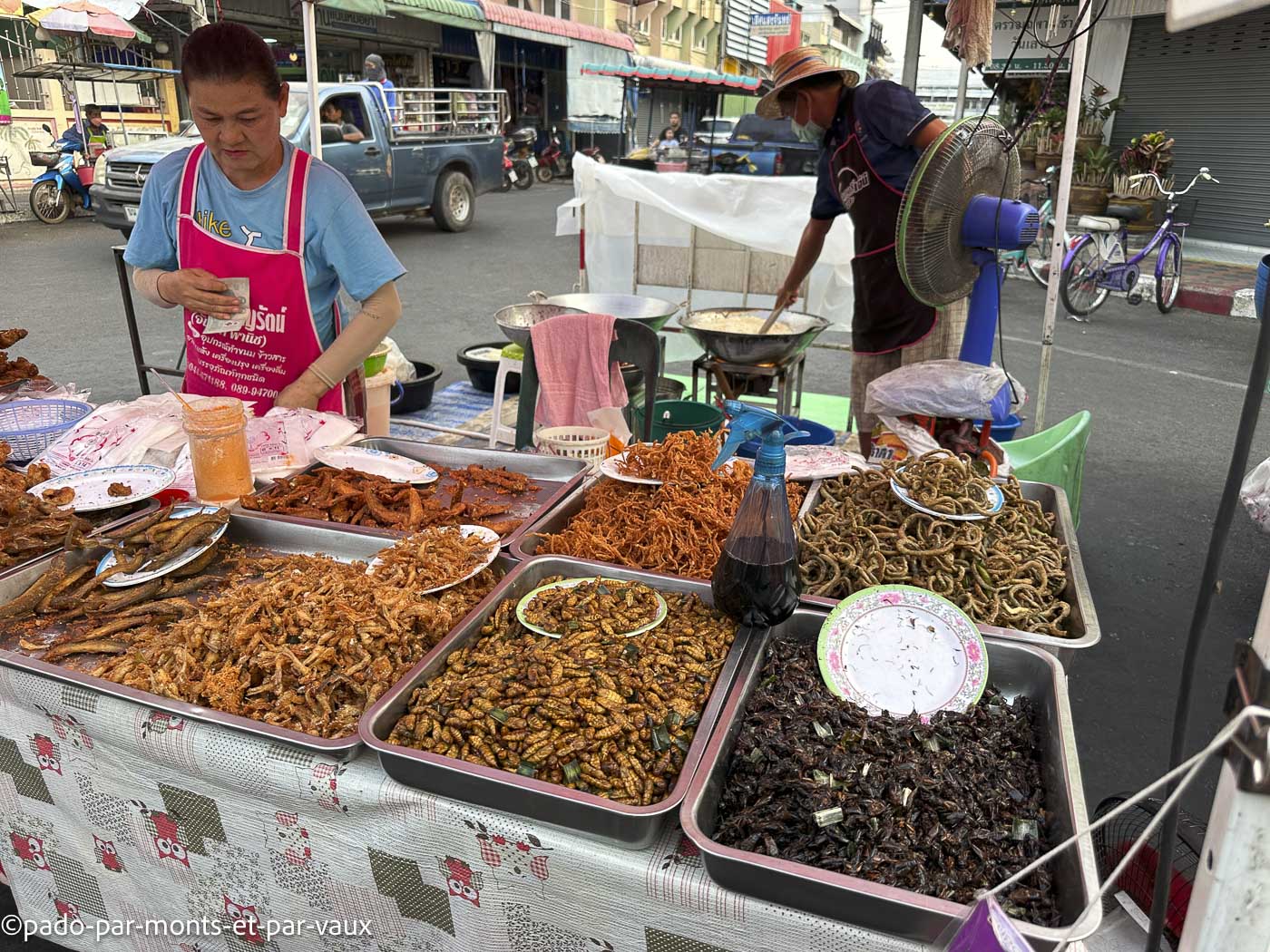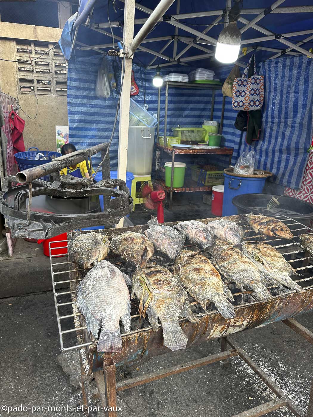 Passage par le marché couvert (qui plie bagages) et par le marché de nuit (qui s’installe). Beaucoup de fleurs, de beaux légumes, des plats tout prêts, portionnés dans des sacs transparents, des fruits, de gros poissons qui cuisent sur la braise, le ventre fourré d’herbes, mais également des choses moins appétissantes comme des vers grillés et autres insectes.