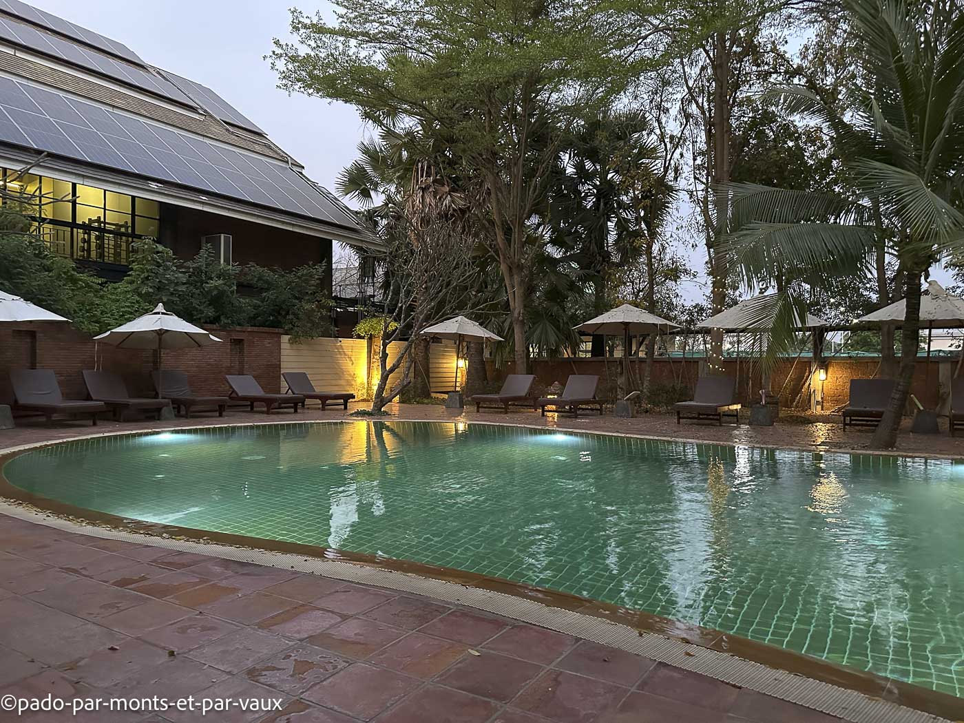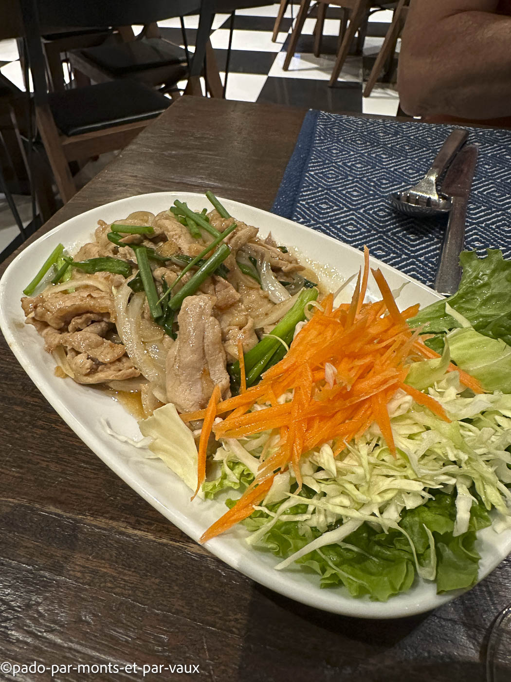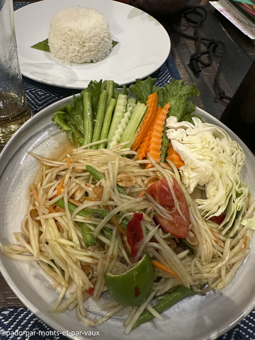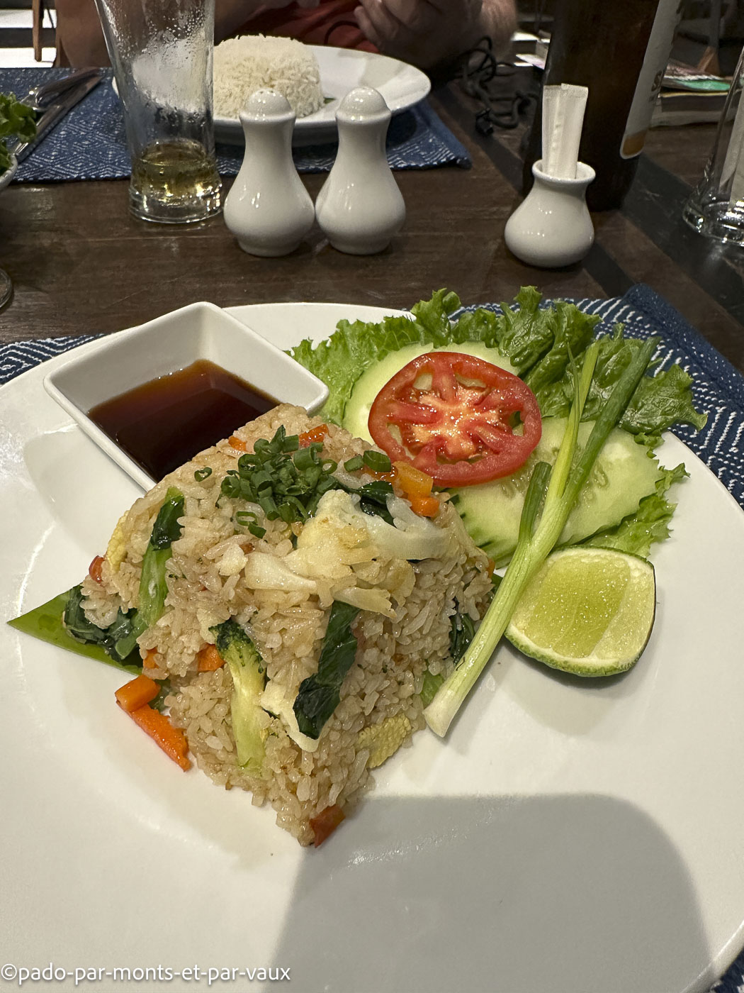 Retour à l’hôtel à la tombée de la nuit. Nous allons piquer une tête dans la piscine (bien agréable) mais nous ne nous attardons pas car nous subissons une attaque de moustiques bien affamés. Dîner au restaurant de l’hôtel. Nous choisissons des plats thaïs et c’est une excellente surprise, tout est très bon : salade de papayes vertes, riz frit aux légumes et porc sauté à la sauce aux huitres.