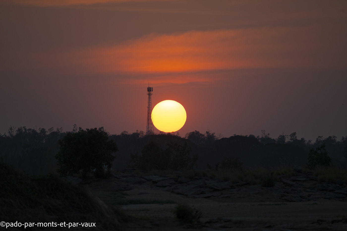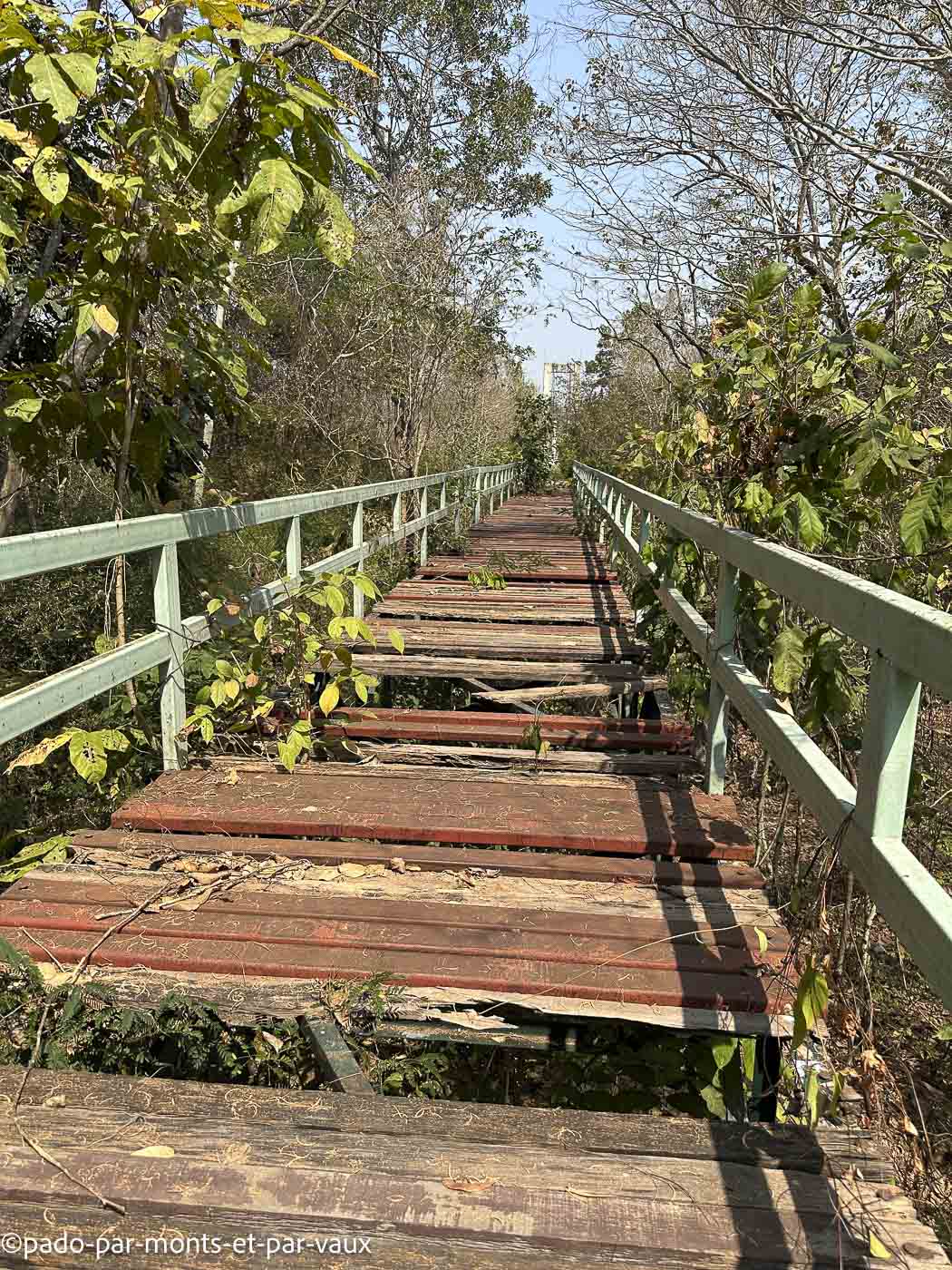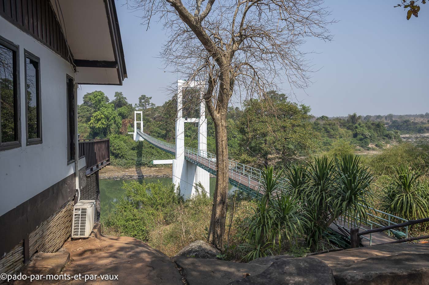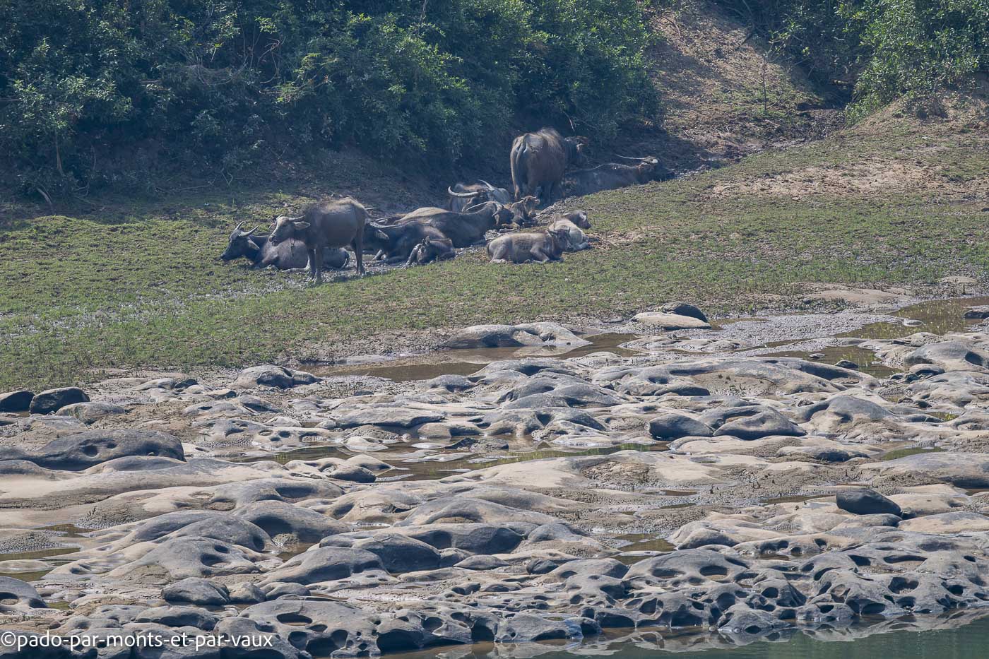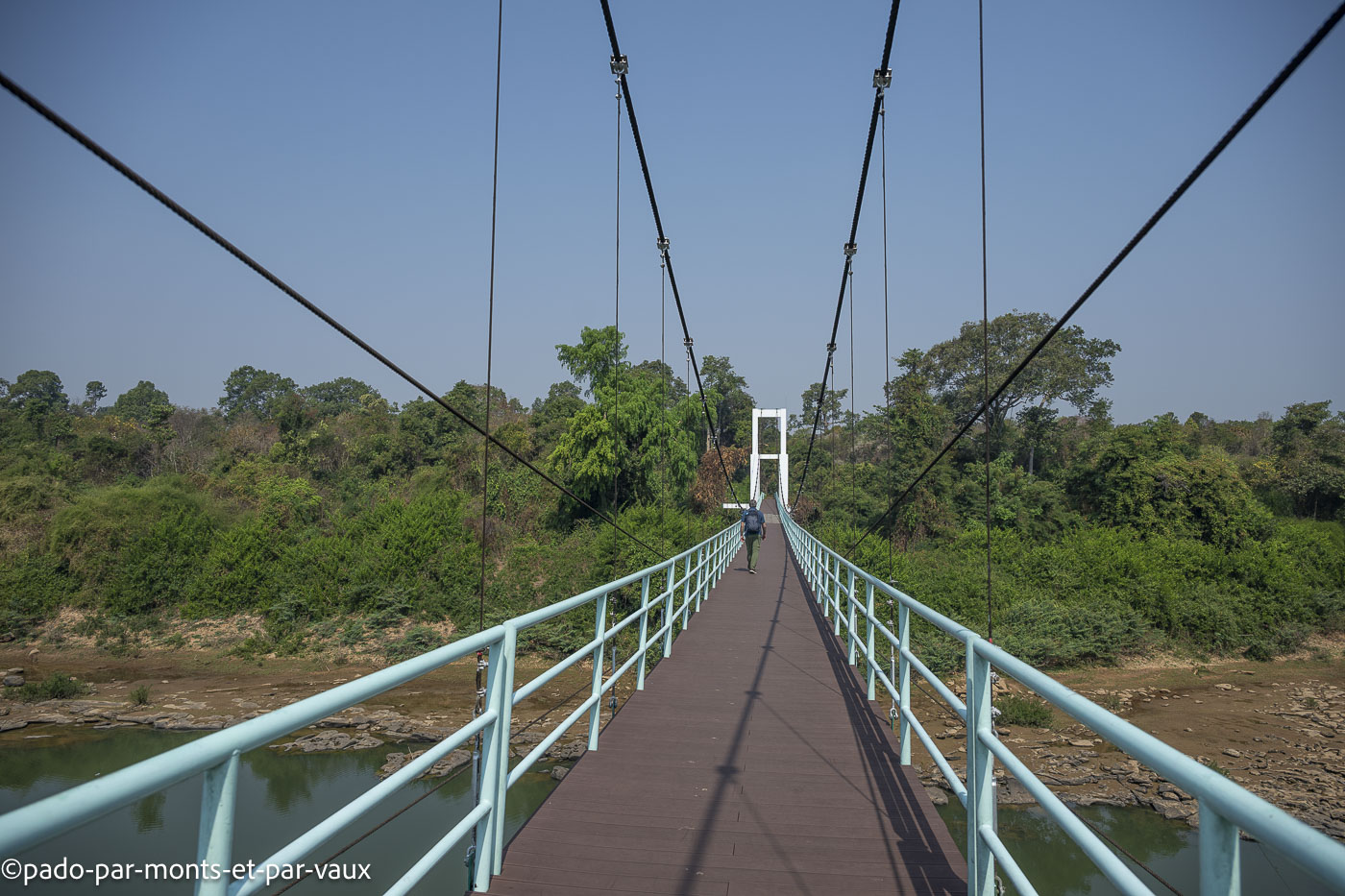 Nous commençons la journée par la visite du Parc national de Kaeng Tana et plus précisément par un pont suspendu qui traverse la rivière Mun. En fait la première partie du pont arrive jusqu’à la petite île de Don Tana (au milieu de la rivière) dont les chemins forestiers sont complètement envahis par la végétation et le deuxième pont de l’autre côté de l’île est en partie effondré et donc impraticable. A cette époque de l’année, il n’y a pas de rapide sur la rivière mais seulement des buffles qui se rafraichissent. Pour tout dire, hormis le coup d’oeil, l’endroit a assez peu d’intérêt.