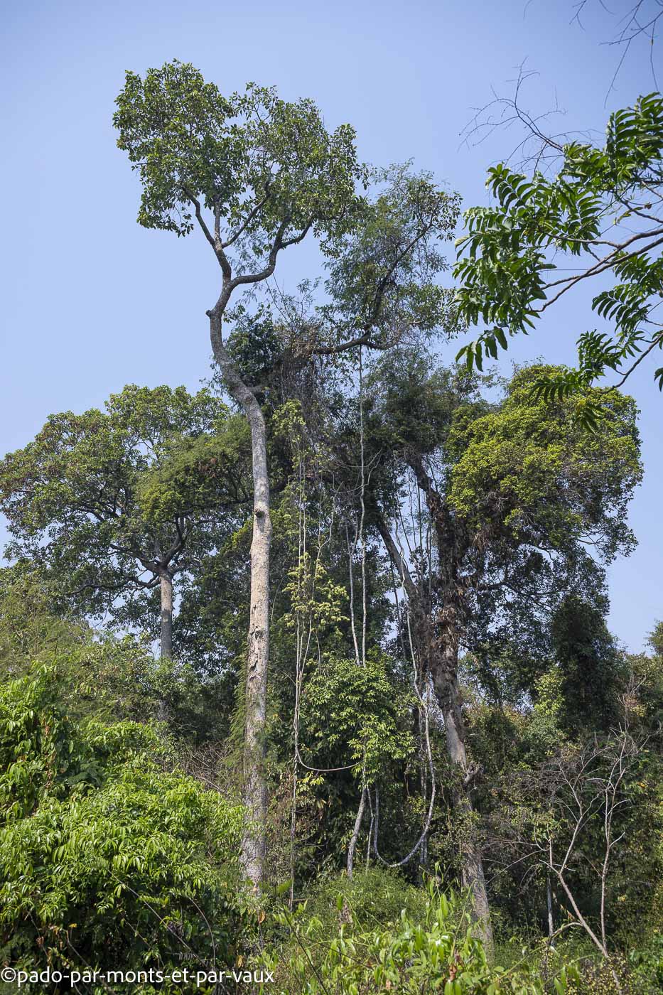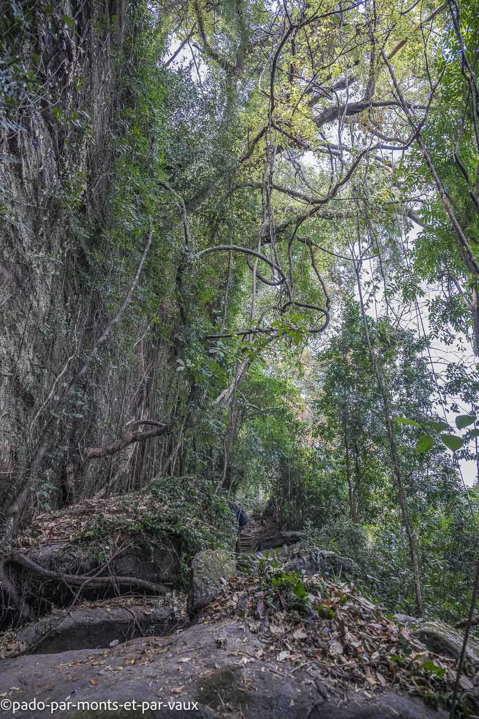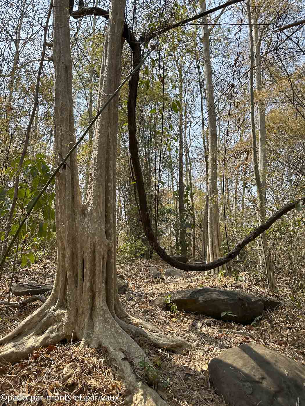 Nous nous arrêtons un peu plus loin et nous décidons de faire le Pha Phueng Nature Trail qui a l’air bien balisé. C’est une boucle d’environ 4kms qui suit grossièrement la rivière en passant par des cavernes et des points de vue aménagés. Malgré la sécheresse, c’est une jolie promenade au milieu de forêts de bambous et le long de la rivière Mun (avant qu’elle ne se jette dans le Mékong). Il y a même quelques petits rapides sur la rivière. Indépendamment du fait que c’est la saison sèche, il y a un barrage juste en amont des rapides, avec une énorme retenue d’eau qui inonde toutes les terres aux alentours.