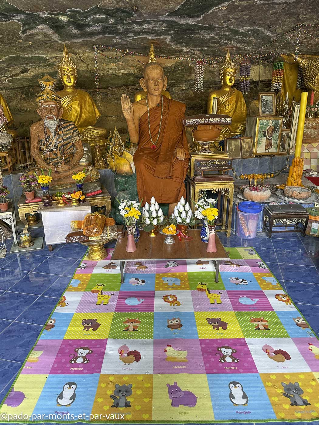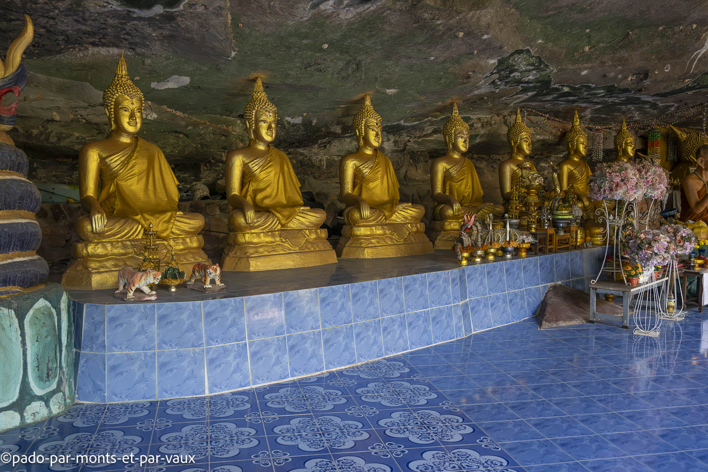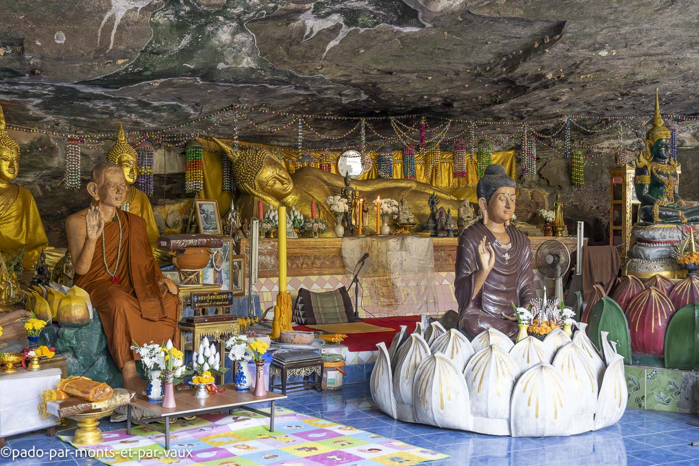 Wat Tham Heo Sin Chai : c’est un temple assez curieux, presque caché dans la forêt. Au niveau de la route d’accès, se trouvent quelques bâtiments quasiment abandonnés, mais des escaliers permettent de descendre dans la pente et on découvre des cavernes dans lesquelles sont disposés des bouddhas de toutes les tailles. La plus grande des cavernes est carrelée de bleu. Les moines vivent dans de petites maisons, juste à côté. L’endroit est assez étonnant, très zen et naturellement assez kitsch.